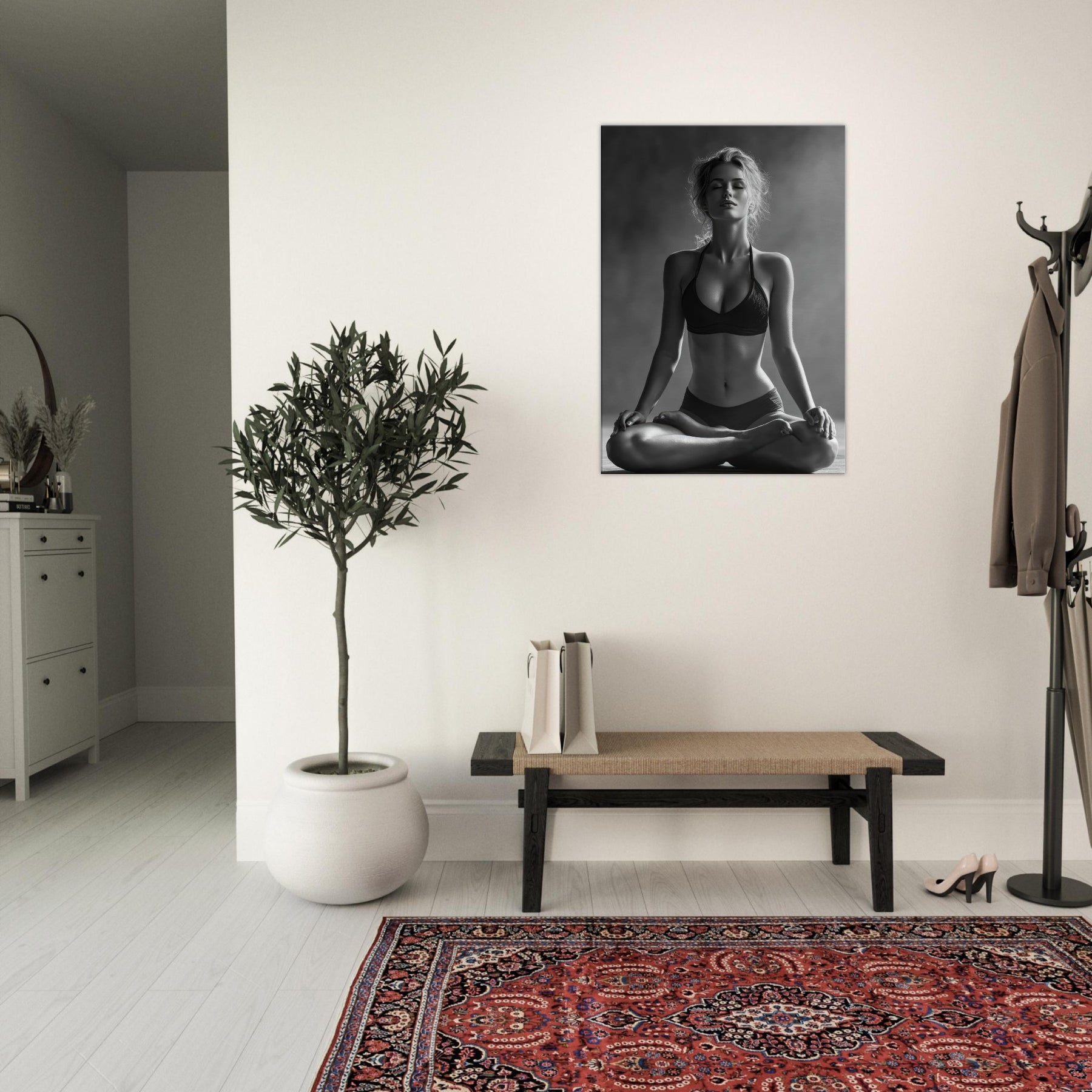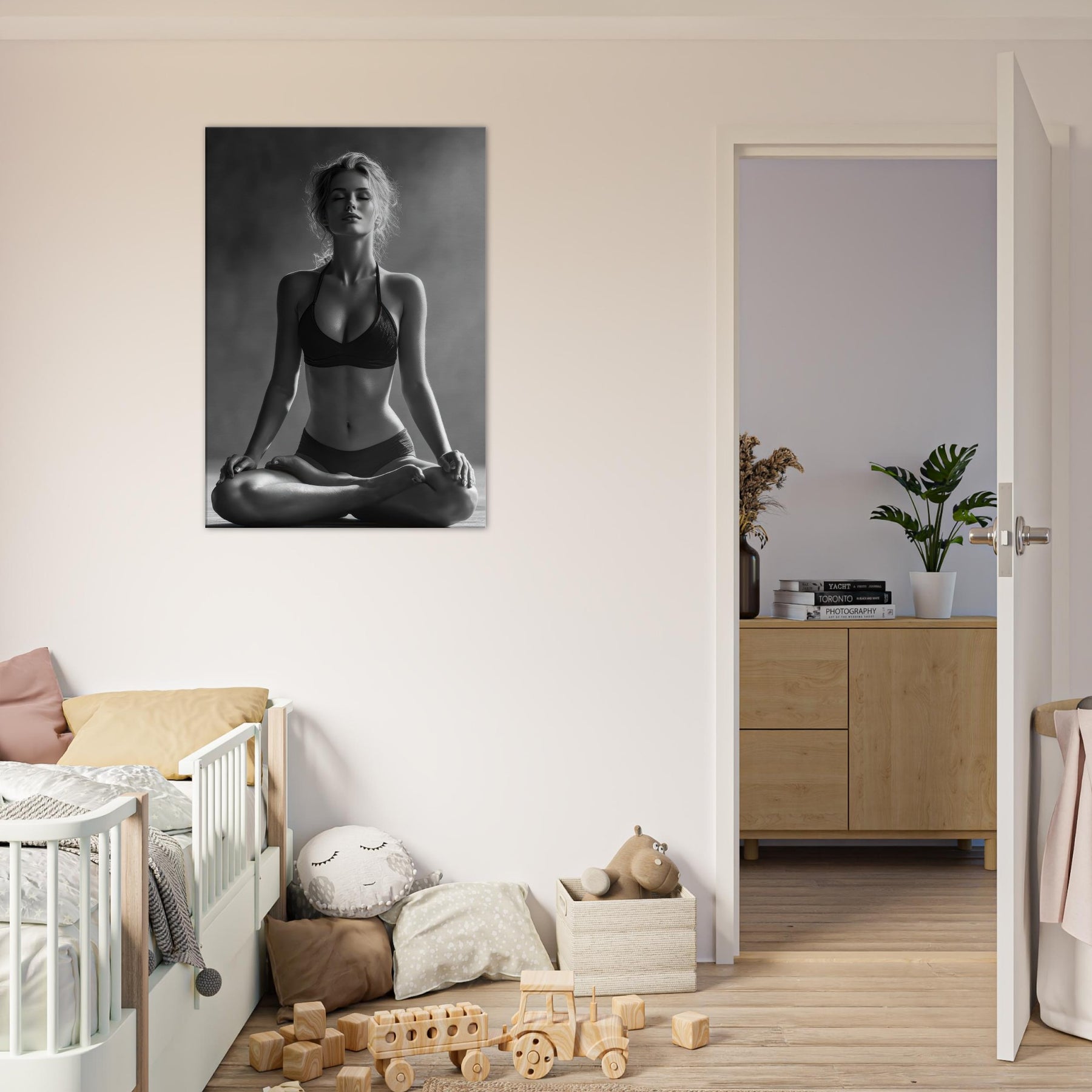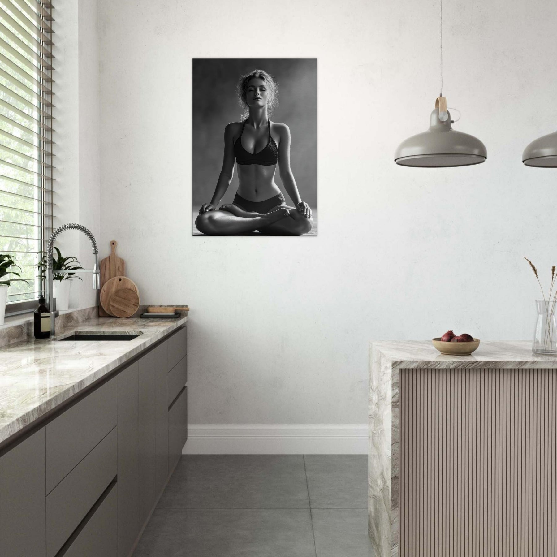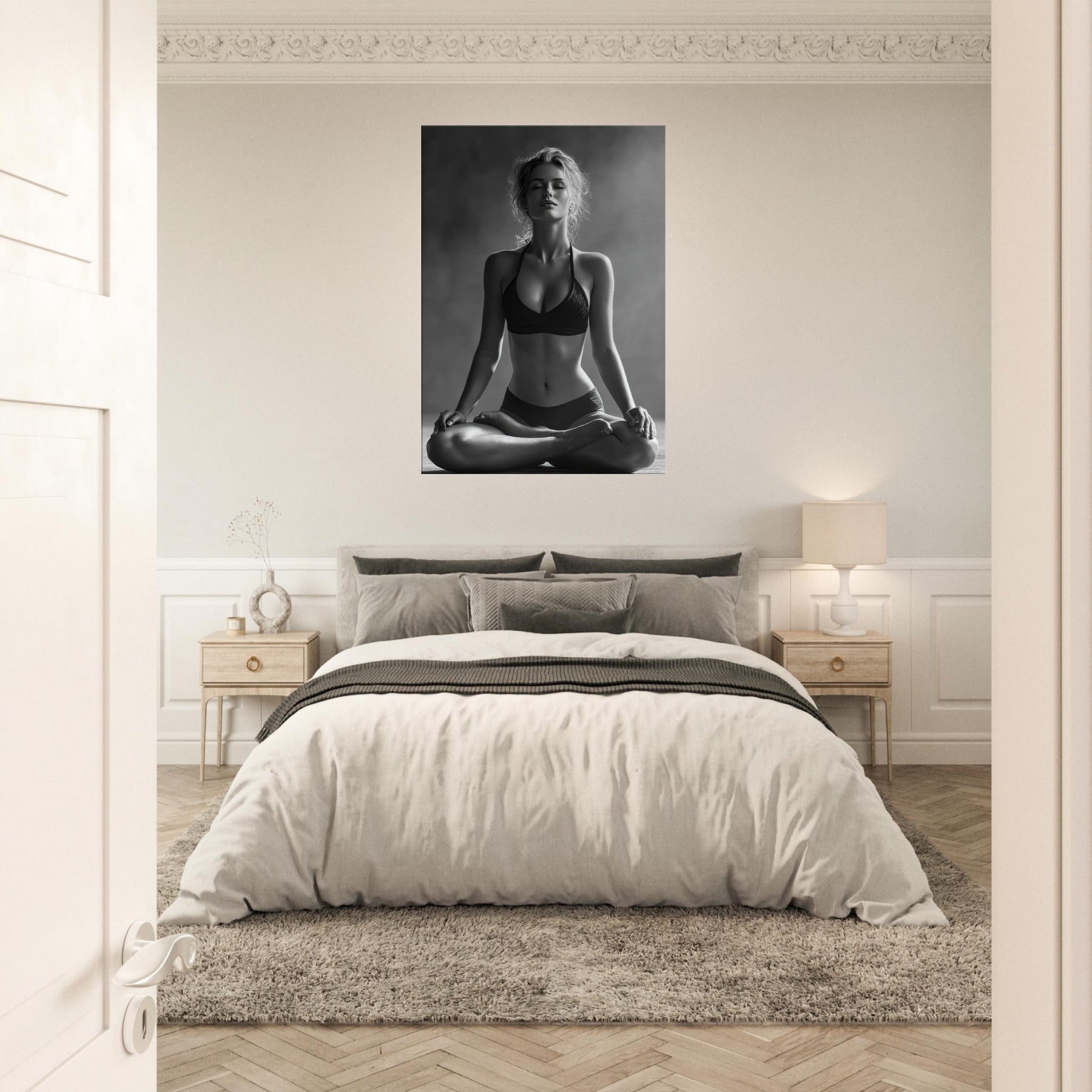 Meditative and austere, this black and white study centers the Yoga Lotus Pose in a hush of light and shadow. The pared back lines trace a radiant calm, while the skin tone and fabric folds become a soft contrast that awakens the senses without shouting.