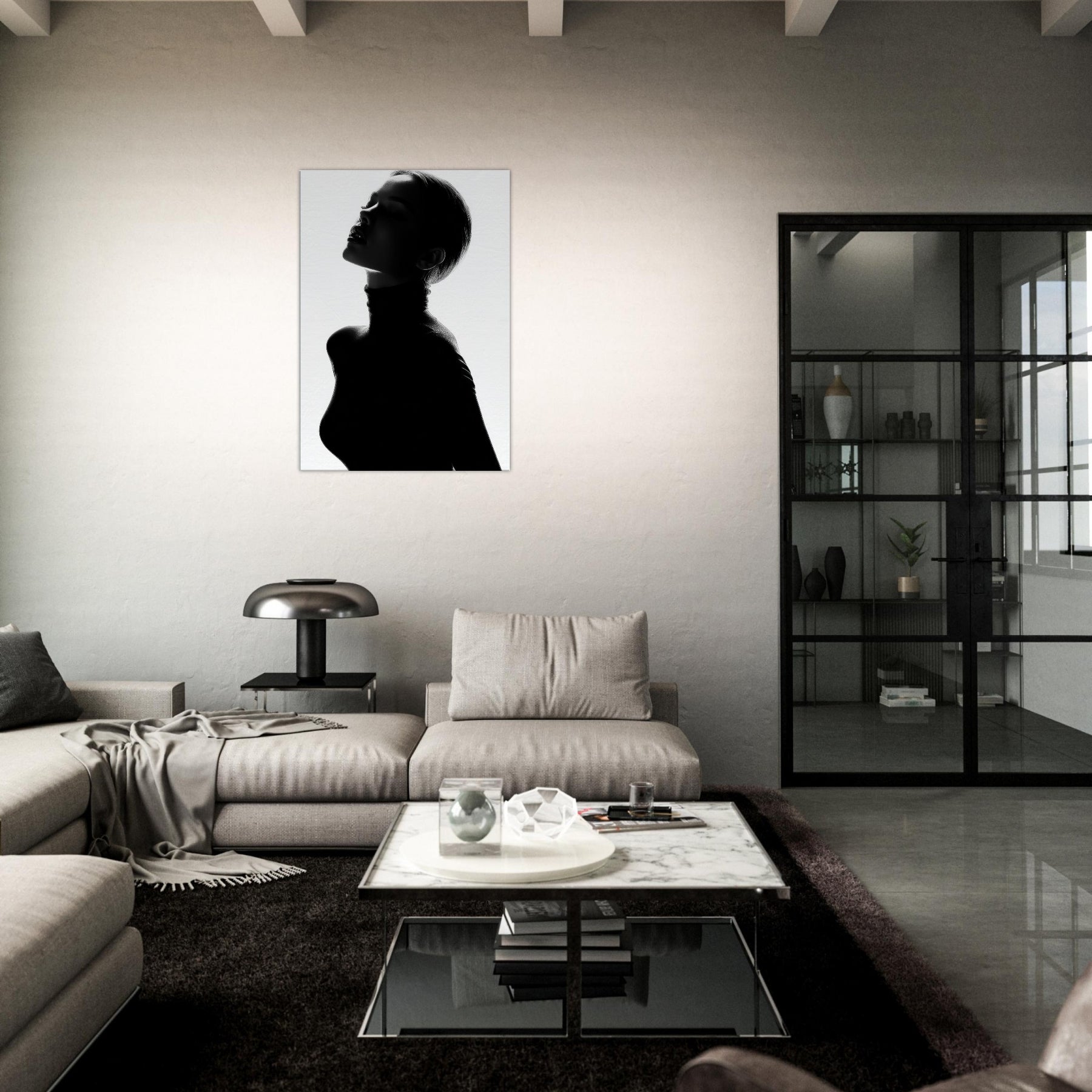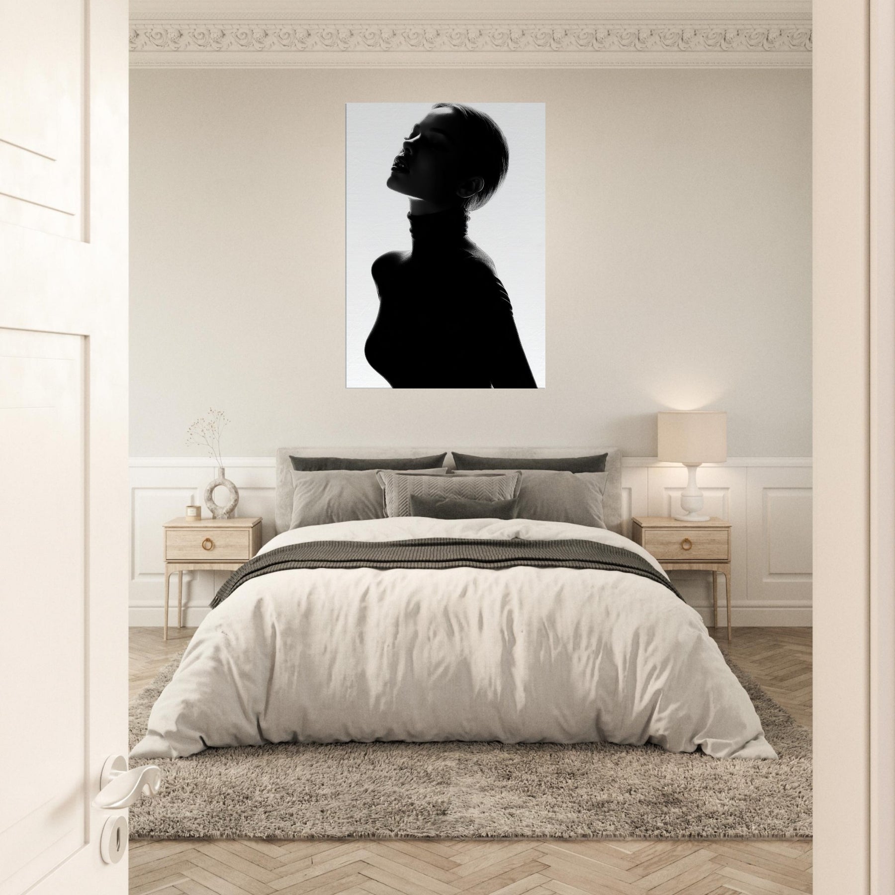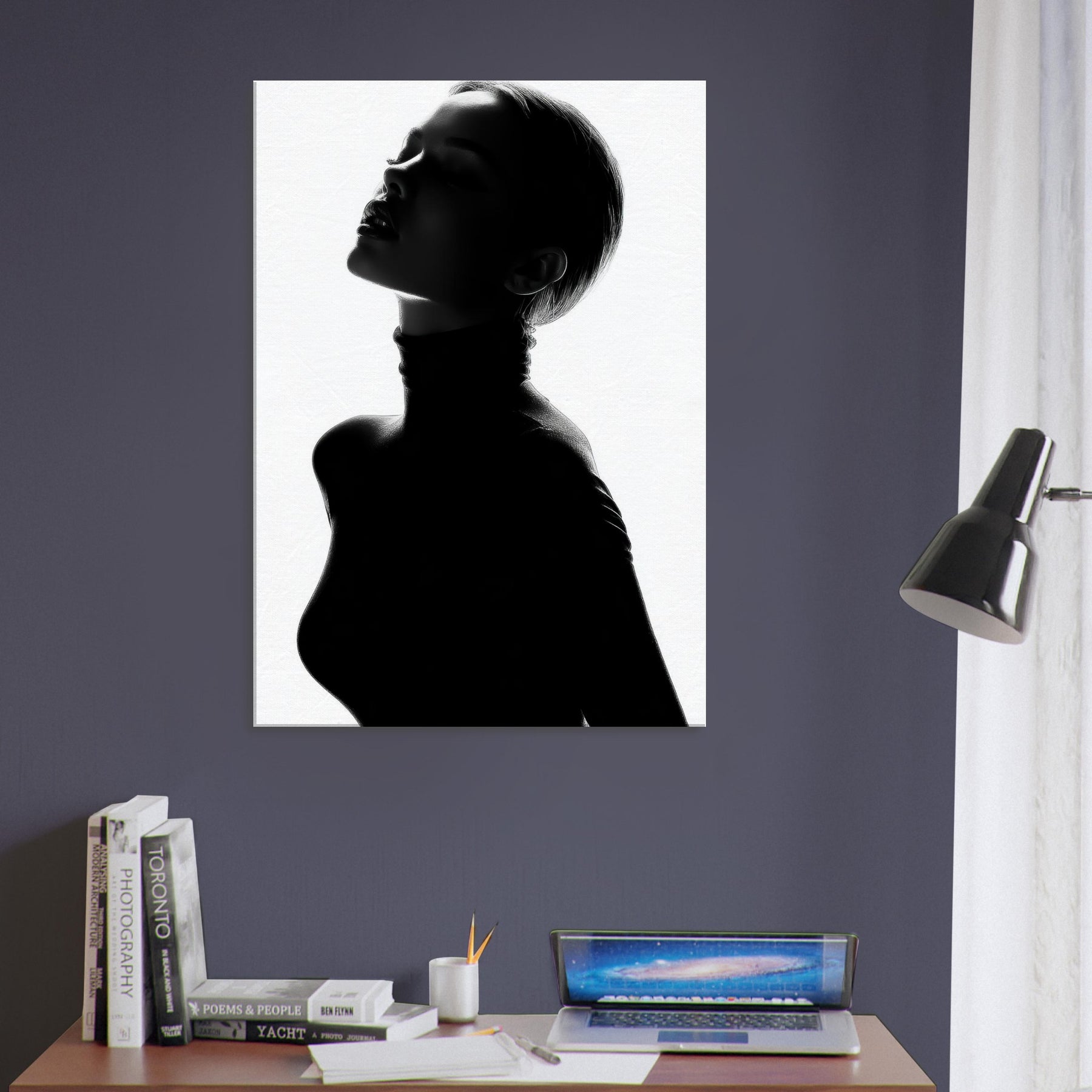 The stark black forms against radiant white create a poised tension, like a whispered breath at dusk. The graceful neck and angled profile evoke quiet confidence, a contemporary ode to femininity. Hang it where daylight cools into golden evenings, and watch the artwork sculpt the room with glamour and restraint a timeless presence that elevates walls into intimate, cinematic space.
