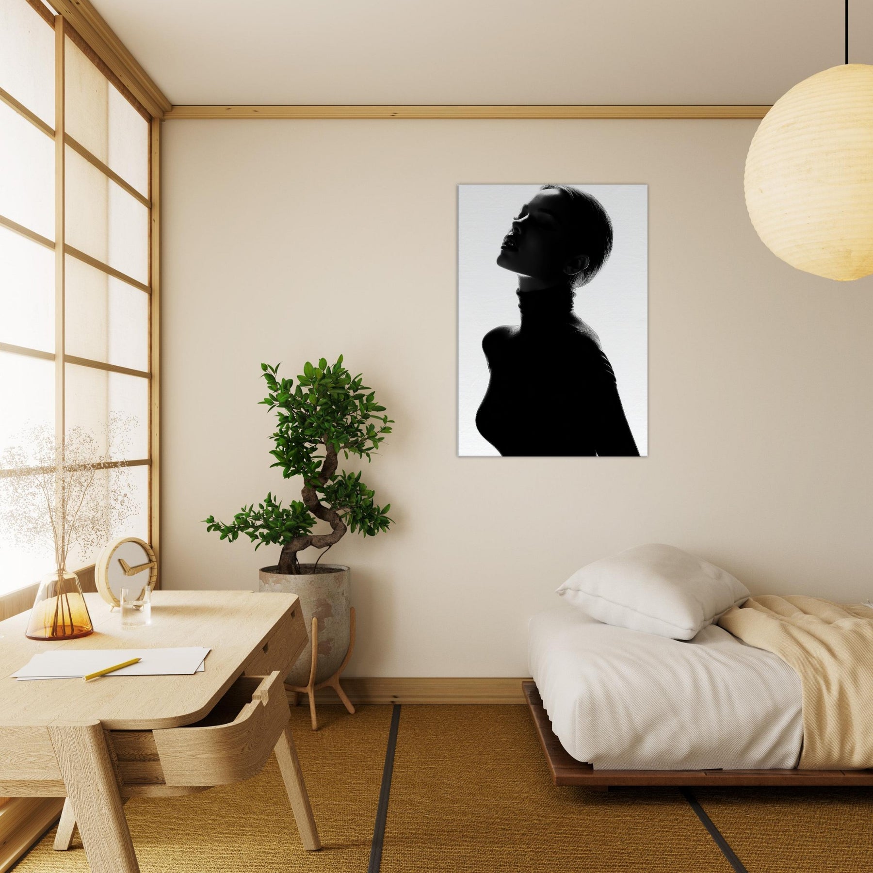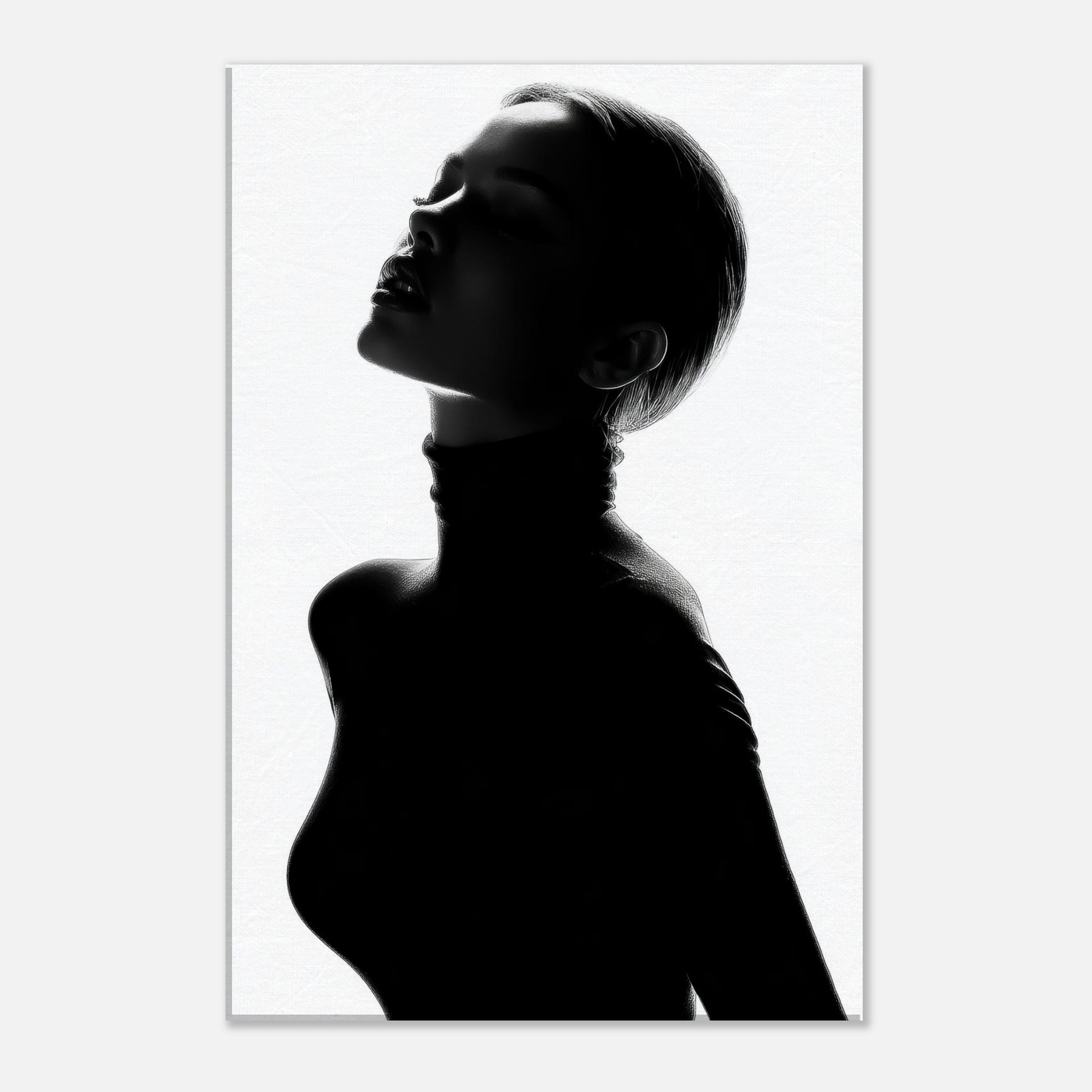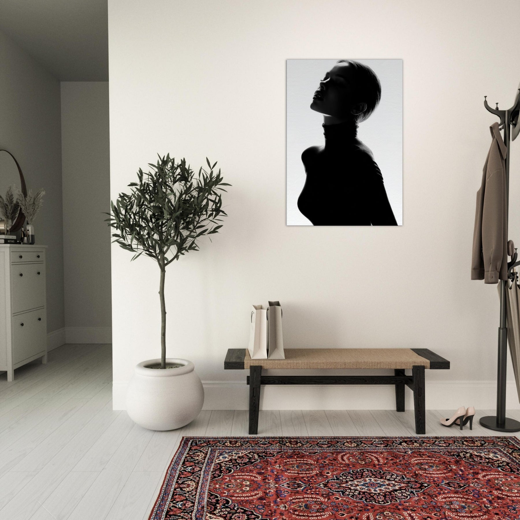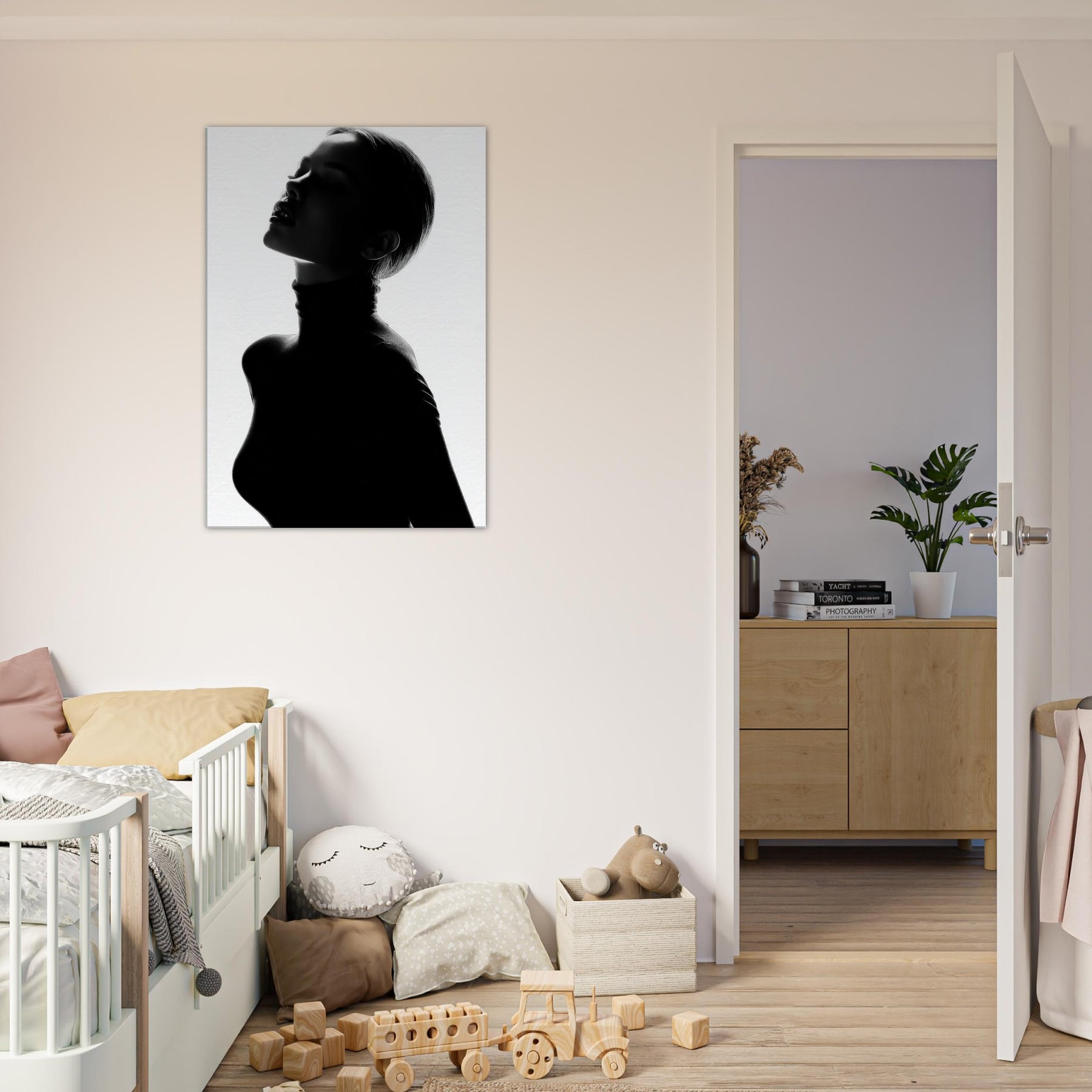 The stark black forms against radiant white create a poised tension, like a whispered breath at dusk. The graceful neck and angled profile evoke quiet confidence, a contemporary ode to femininity. Hang it where daylight cools into golden evenings, and watch the artwork sculpt the room with glamour and restraint a timeless presence that elevates walls into intimate, cinematic space.