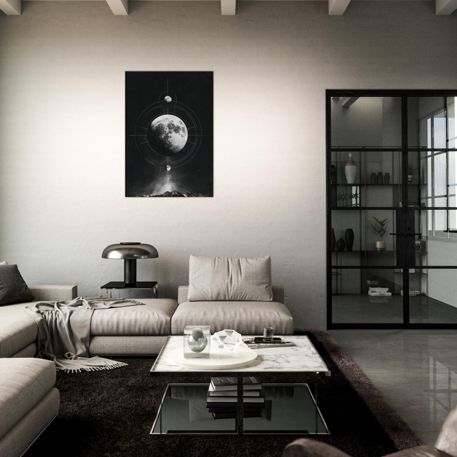 It radiates a mystical calm, inviting reflection in a living room or bedroom, turning walls into a quiet observatory. The piece anchors soft textures and muted lighting, heightening the sensation of spacious air. A timeless focal point for contemplative interiors.