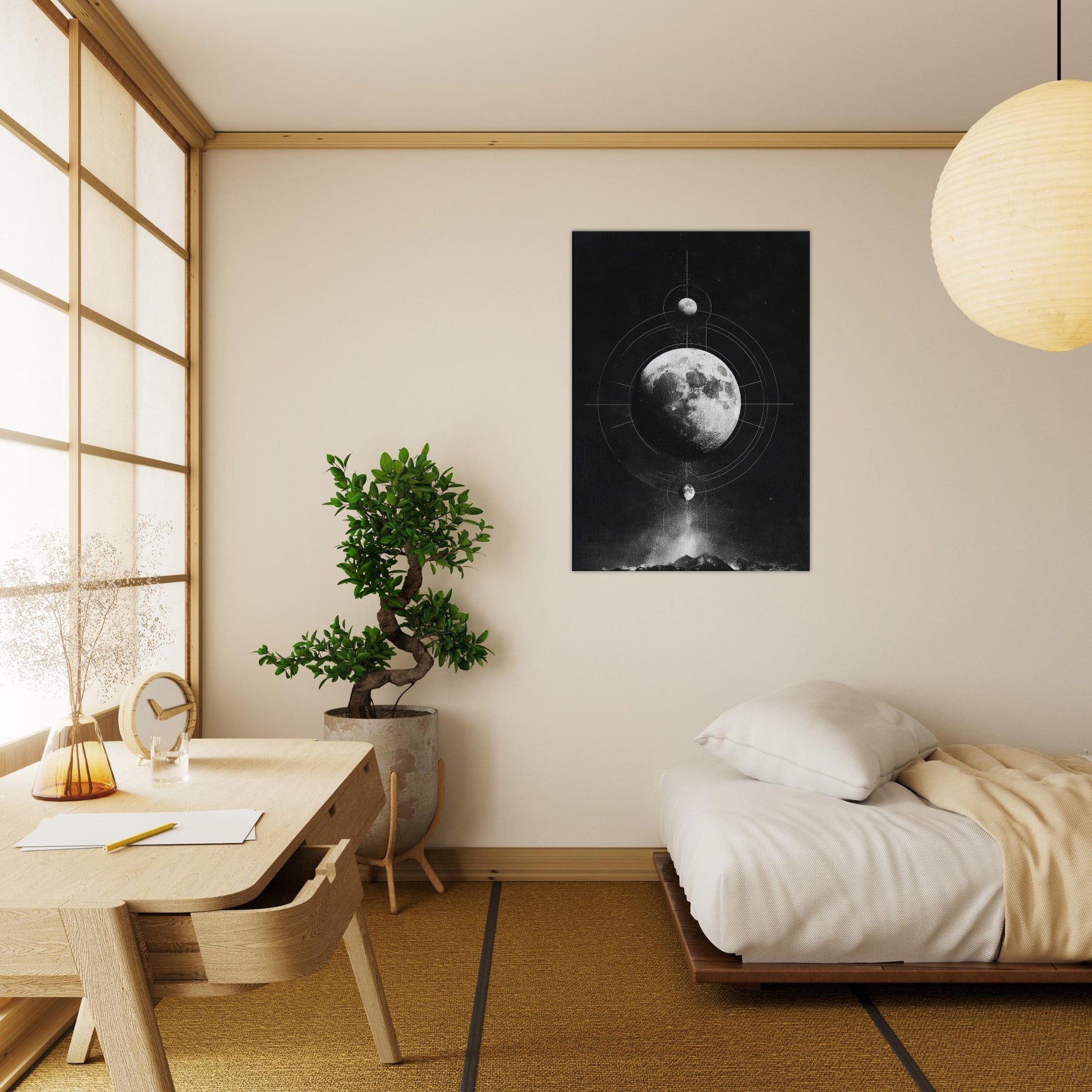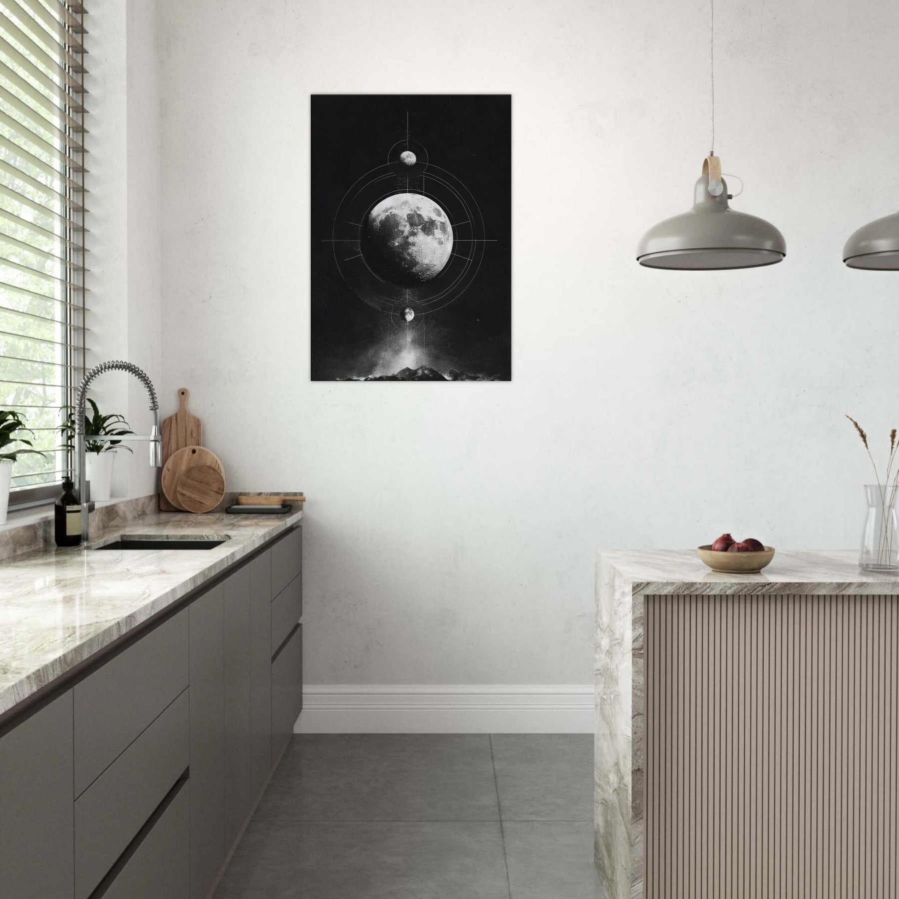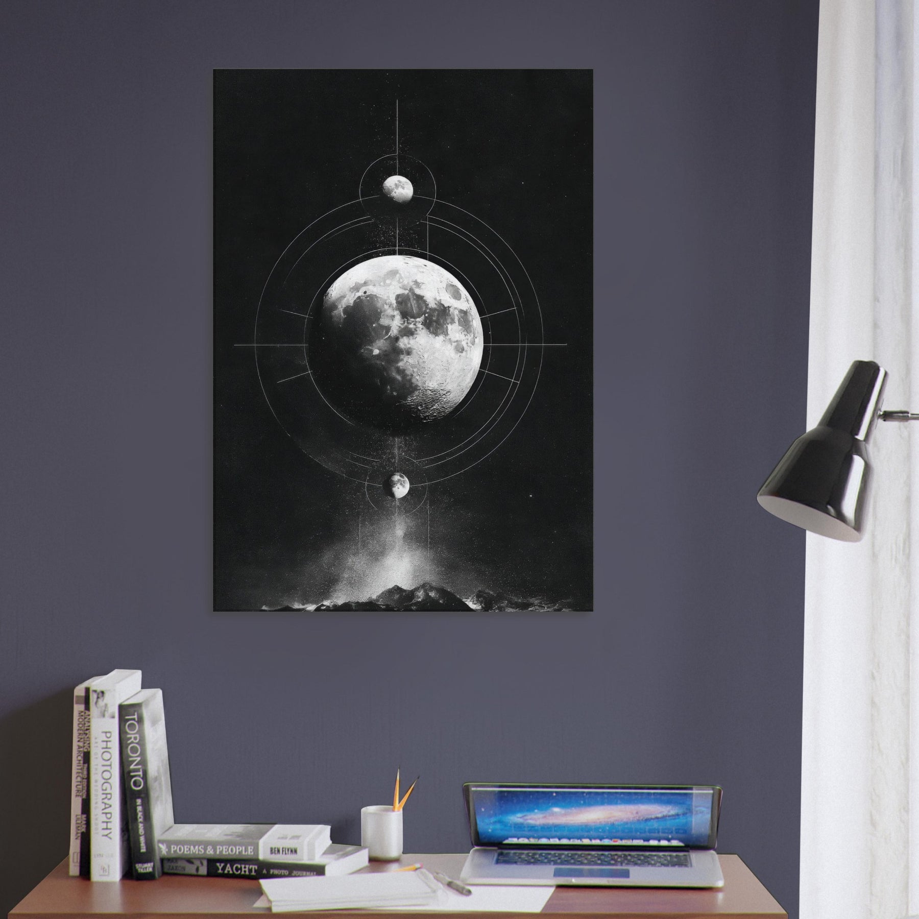 Let the Moon Phases drift across your room in a hush of grayscale where night and light converse. This black and white study unfolds as a quiet constellation, a circle of orbits encasing the Moon, framed by delicate lines that trace intention and memory.