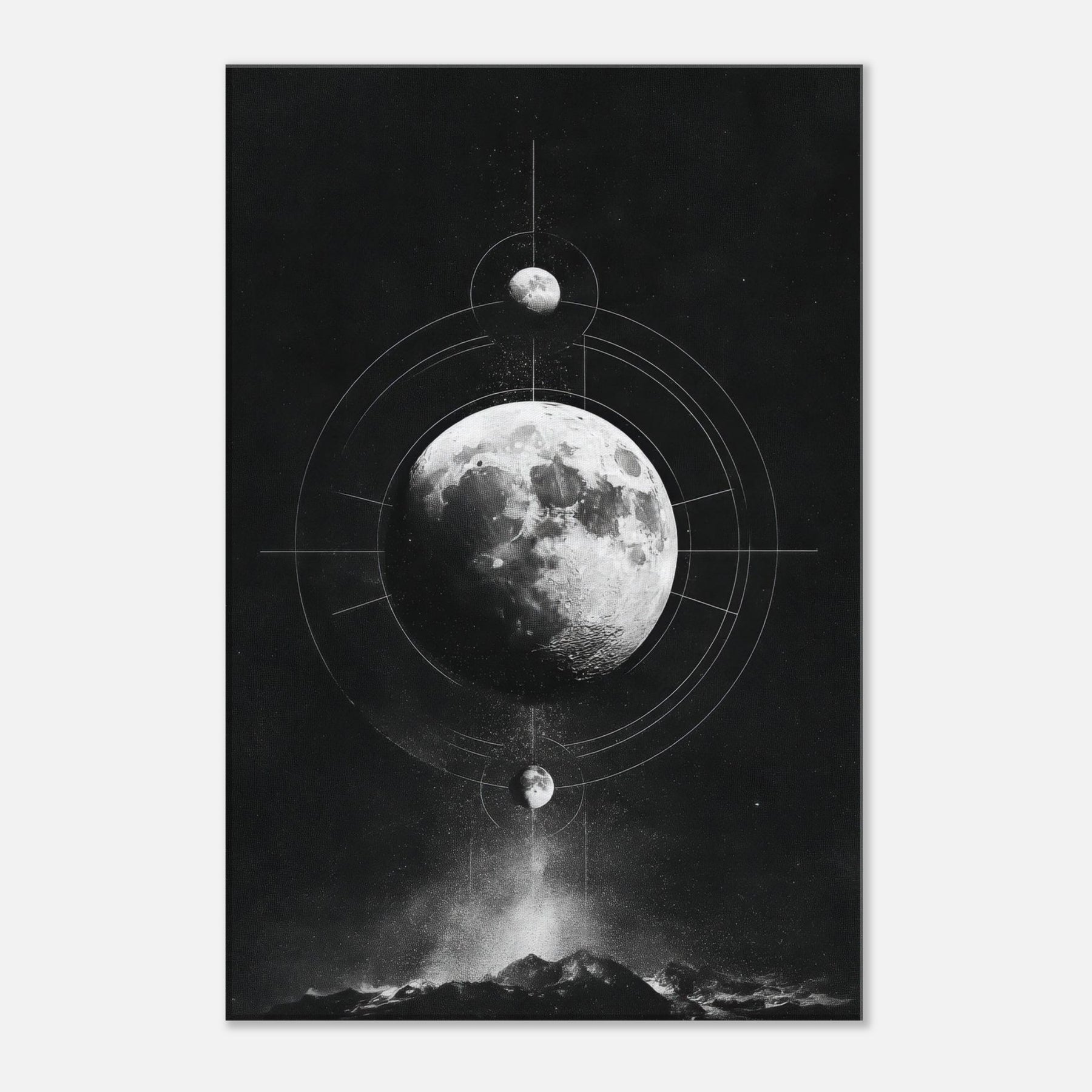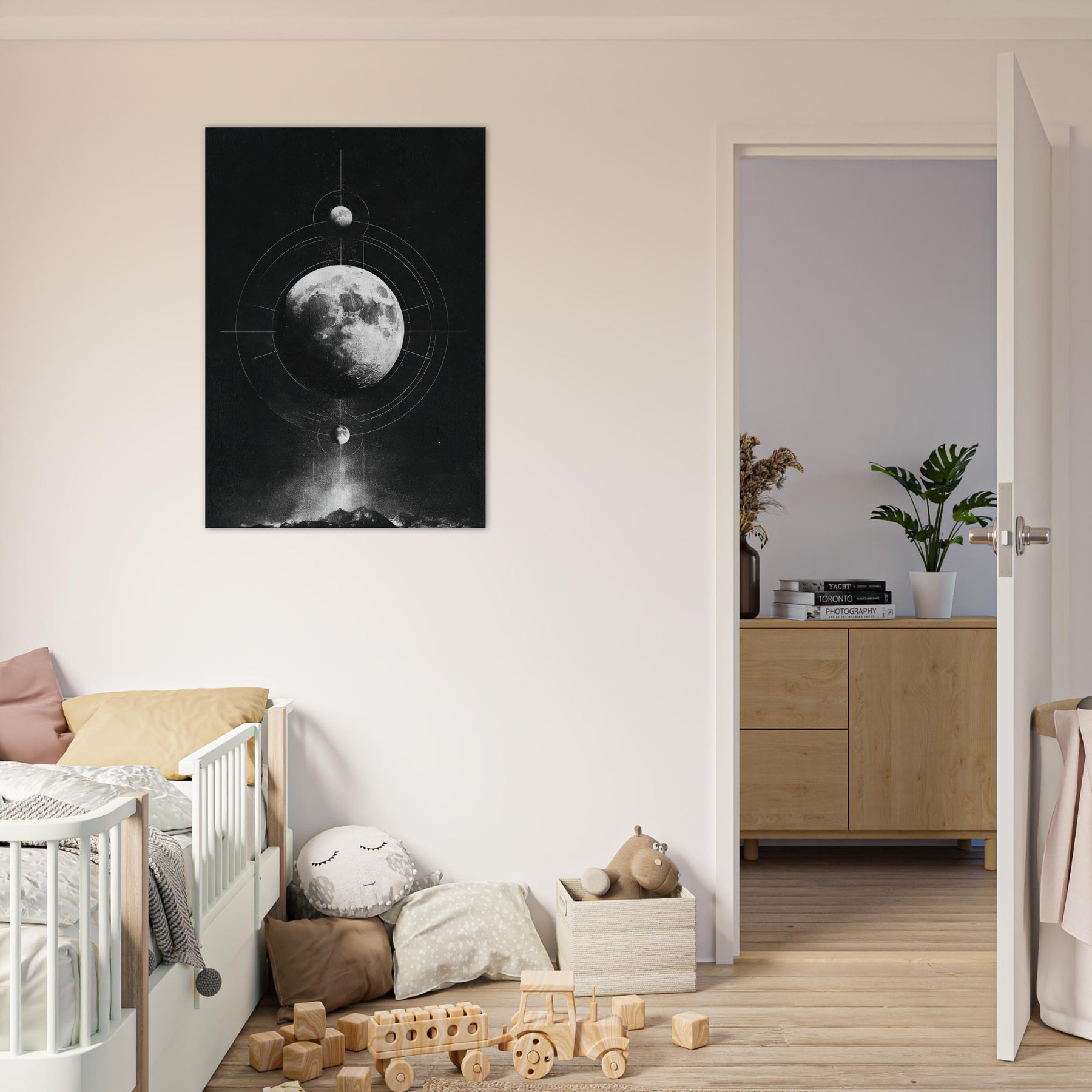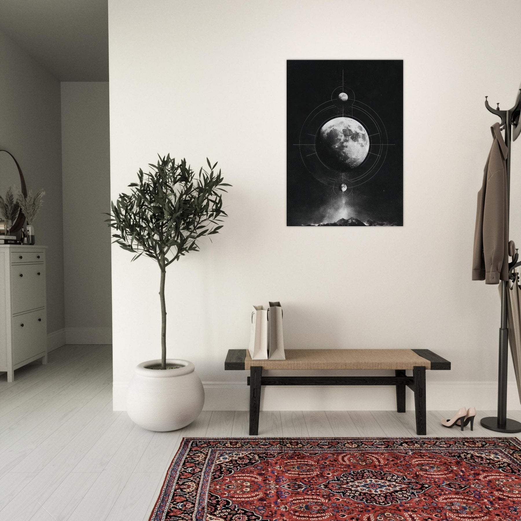 Let the Moon Phases drift across your room in a hush of grayscale where night and light converse. This black and white study unfolds as a quiet constellation, a circle of orbits encasing the Moon, framed by delicate lines that trace intention and memory.