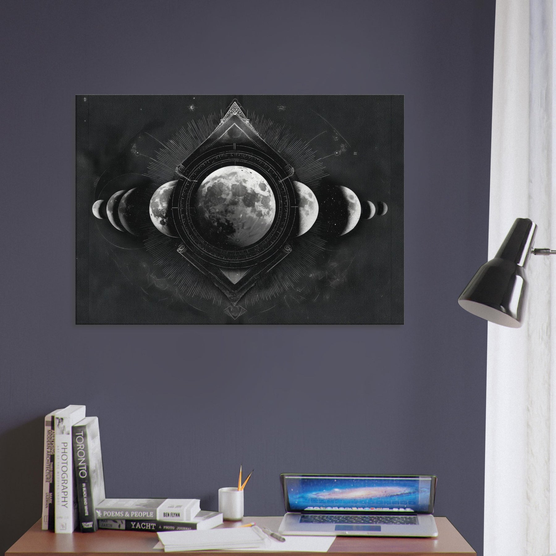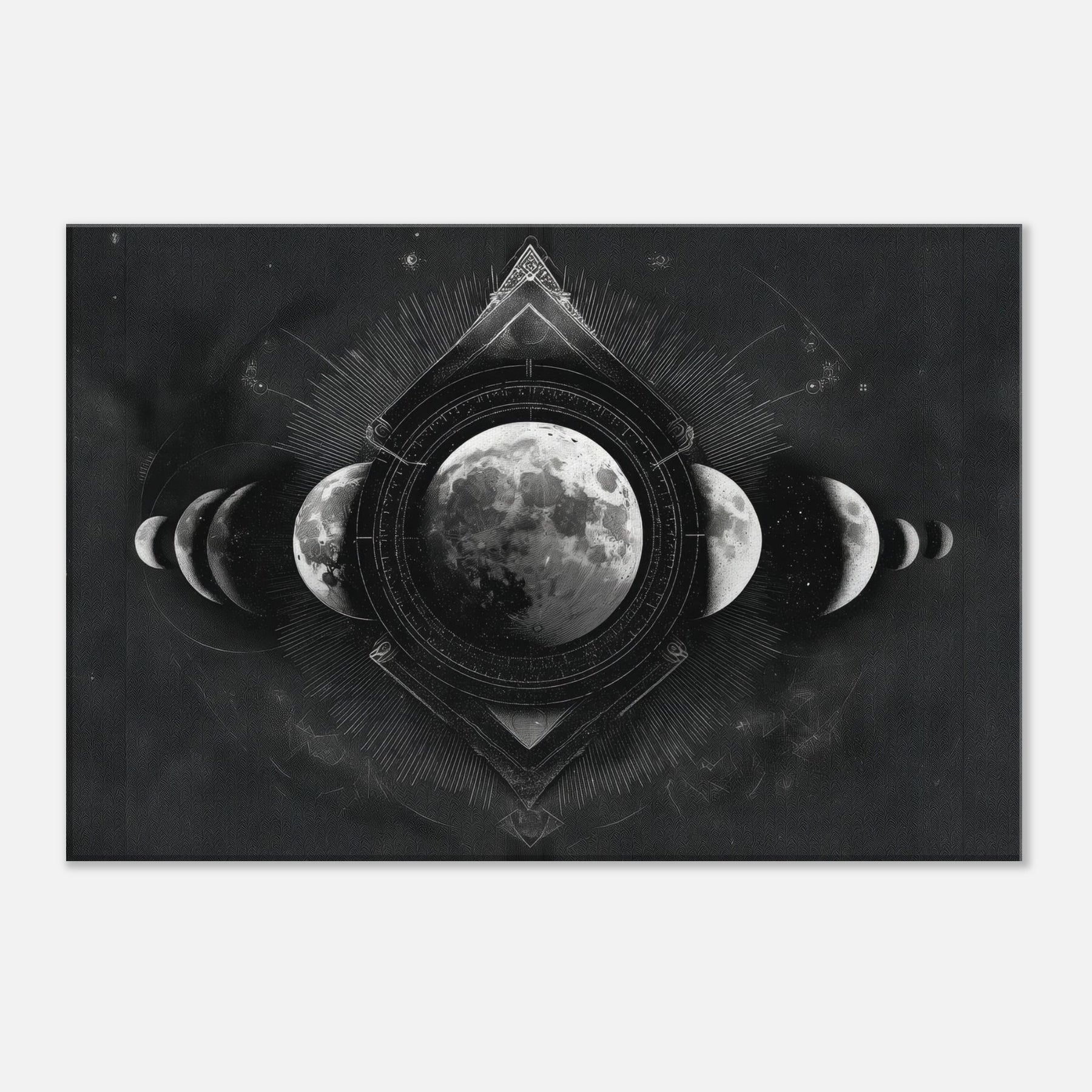 Moon Phases unfolds in a quiet, spellbound symmetry that feels timeless. The central lunar orb is framed by a ceremonial geometric ring, like a portal to nocturnal tides and meditations. Ghostly halos radiate, the graphite textures soft and tactile, inviting slow, thoughtful gaze. This black and white composition enhances any living space with hush and focus, turning walls into a serene sky. Perfect for a living room, bedroom, or study, it invites quiet contemplation and a touch of mystic allure.