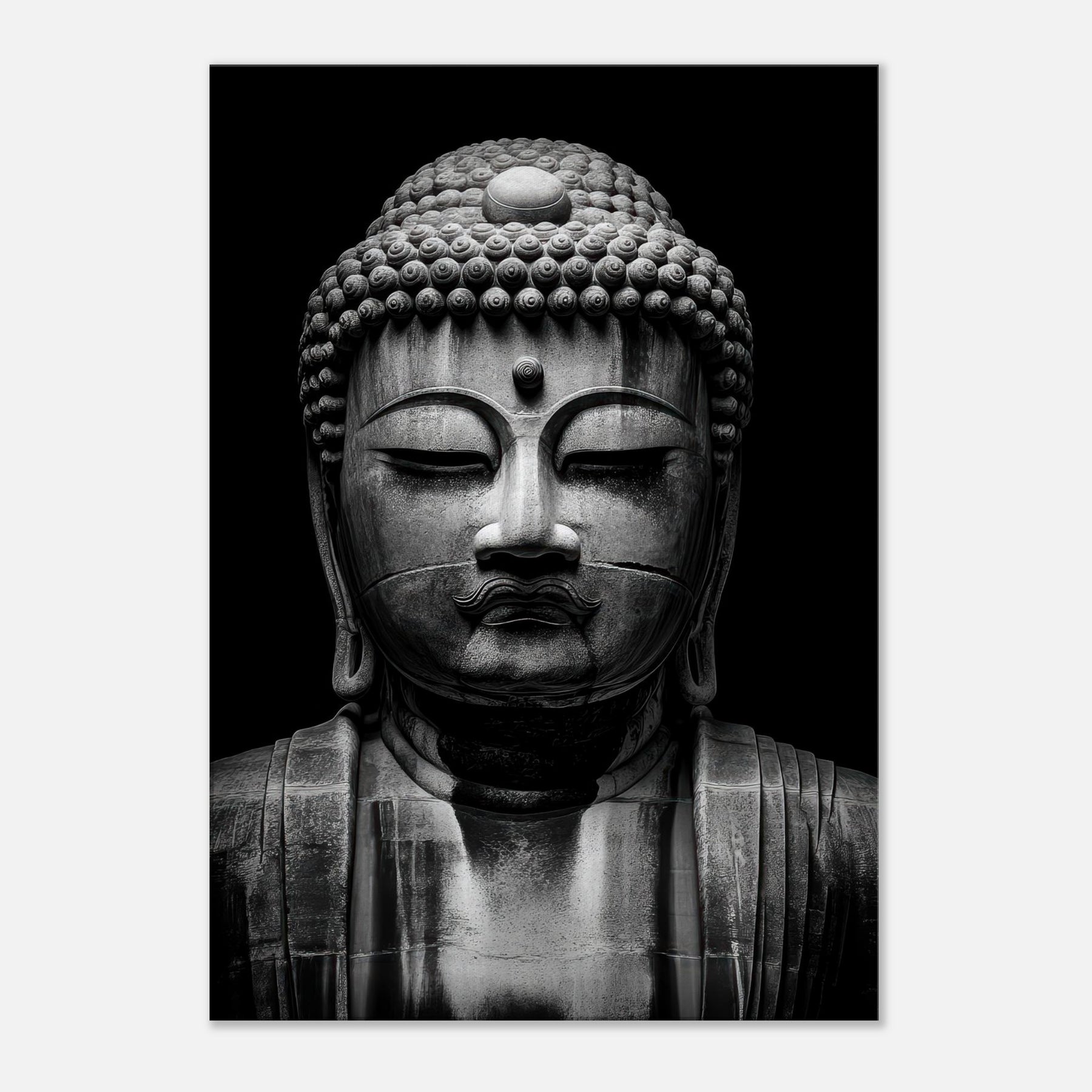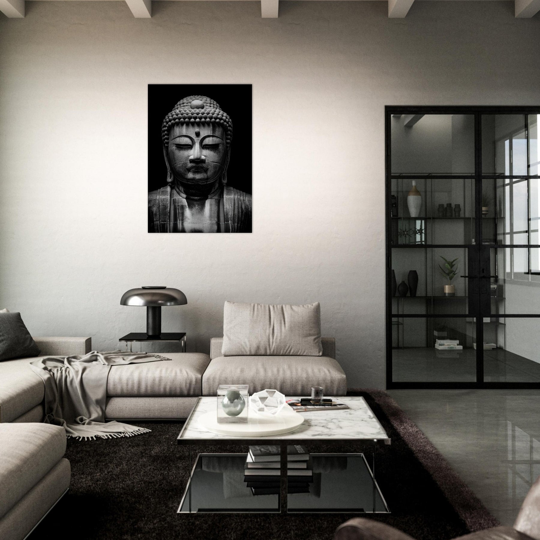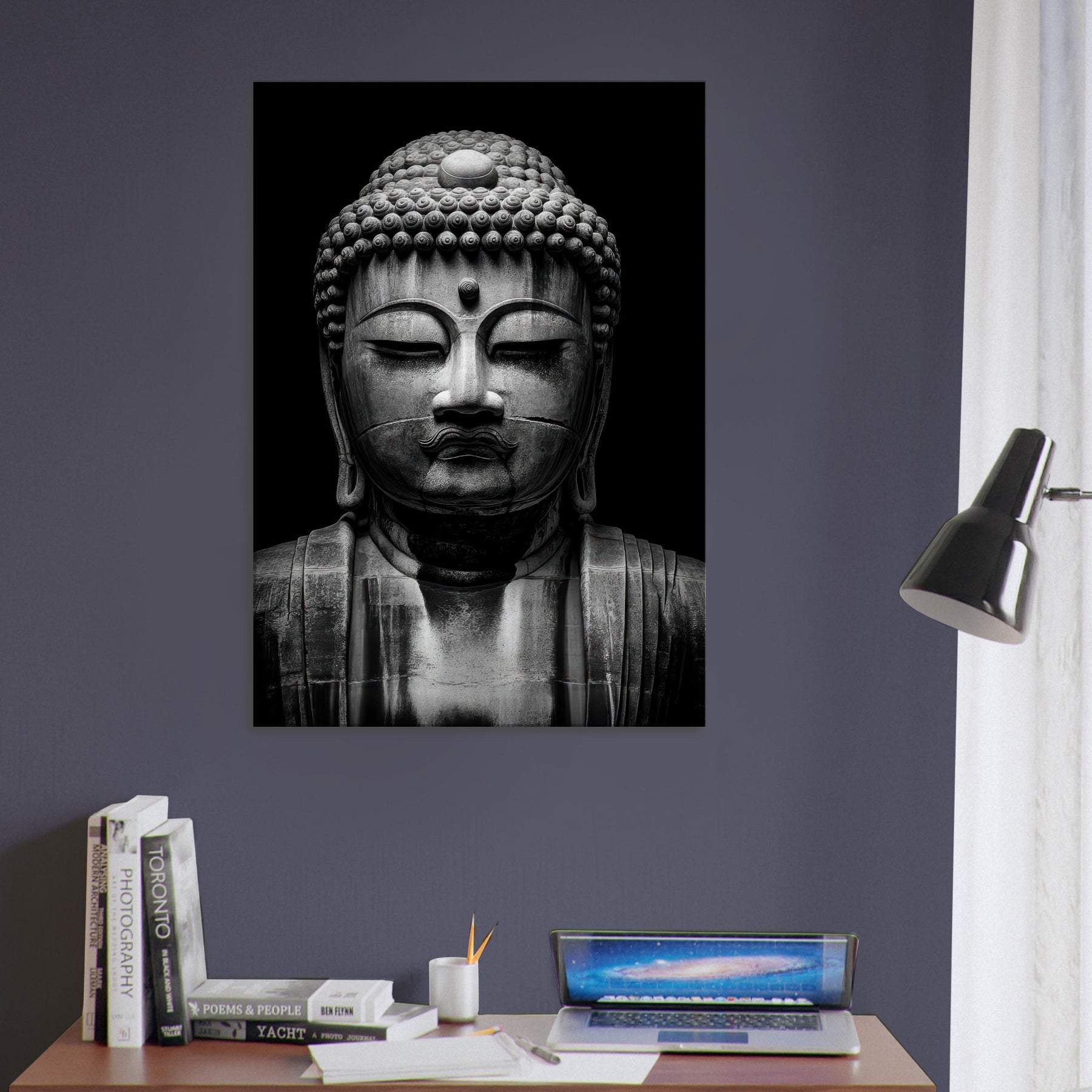 An arresting study of stillness, this Buddha in black and white captures a quiet, inner architecture. The serene gaze and gentle folds of the urna invite reflection as if a temple breathes within the room.