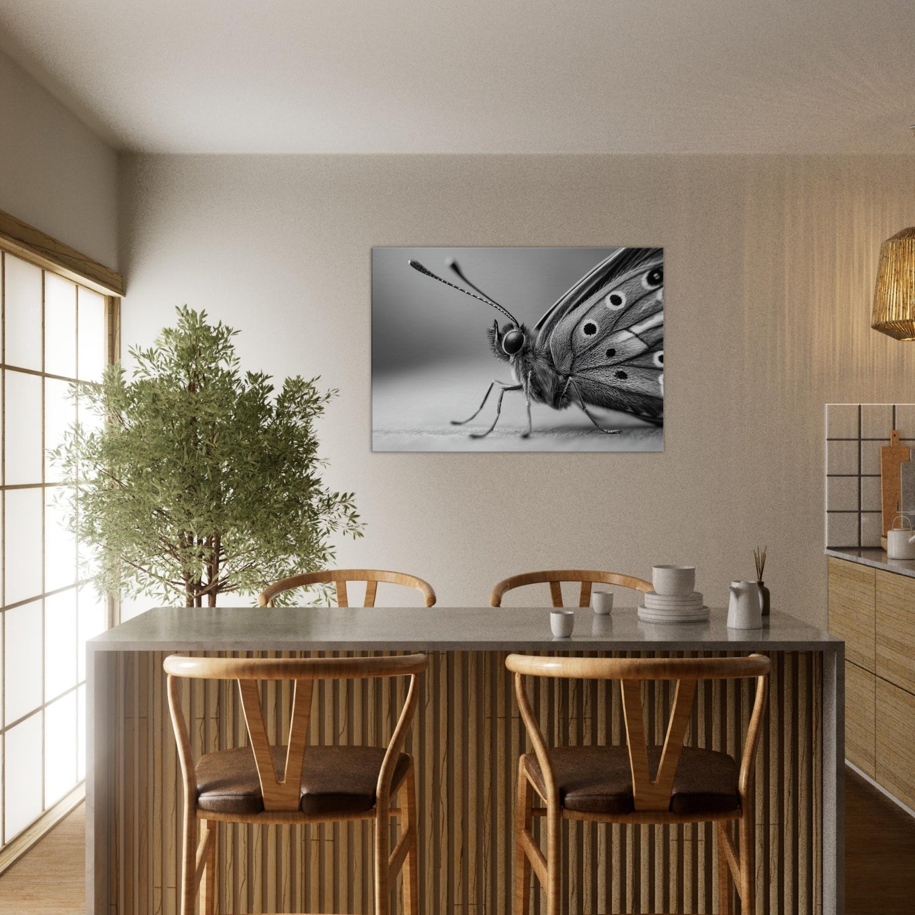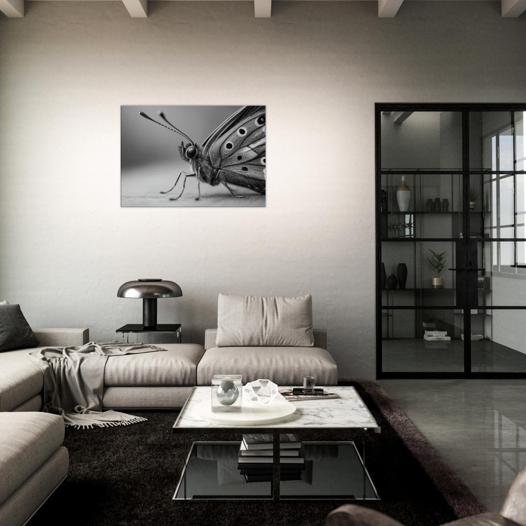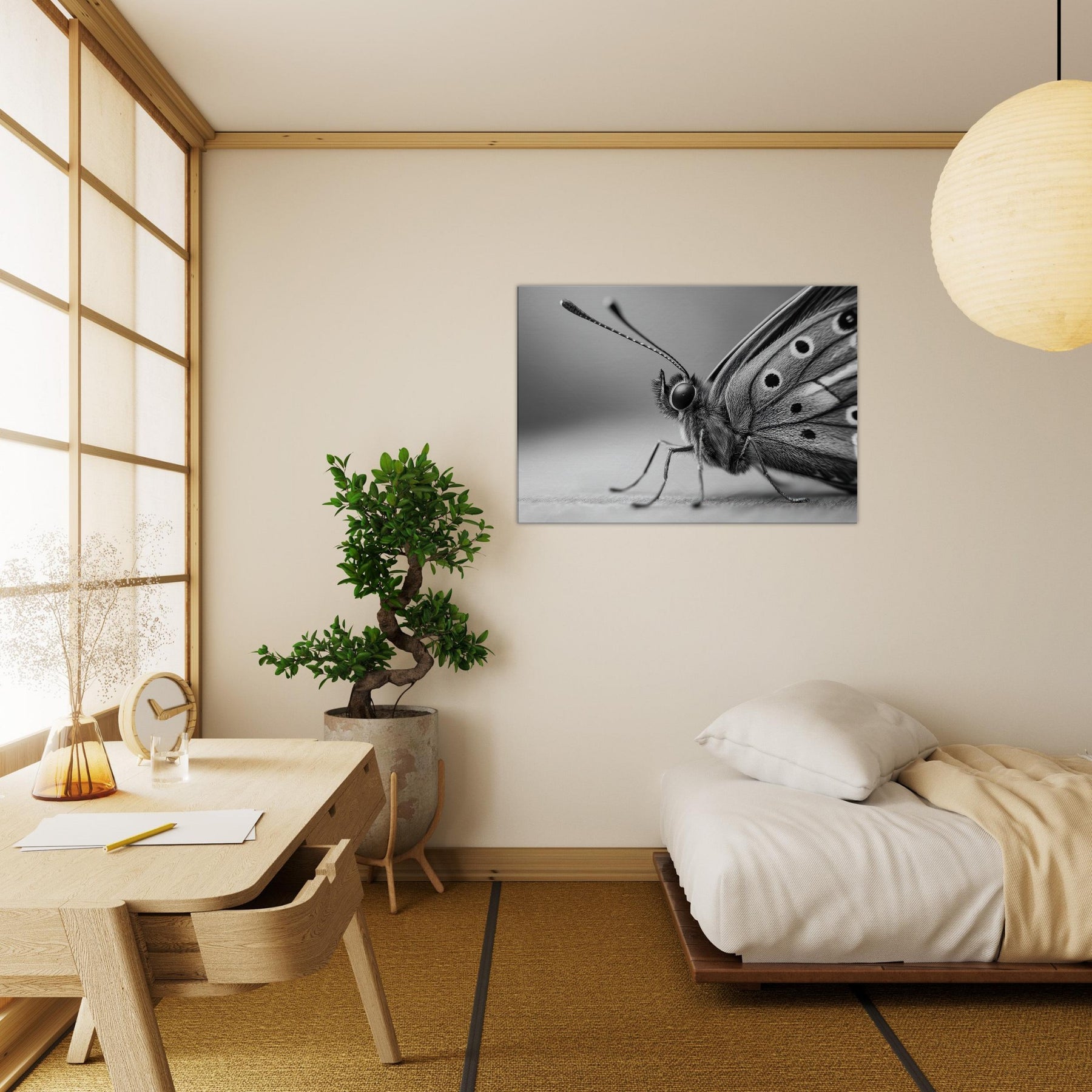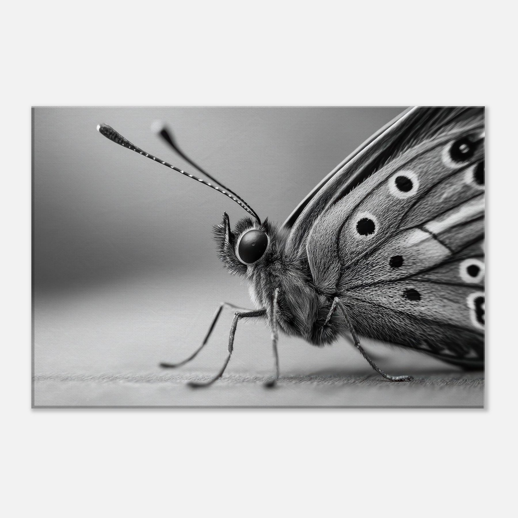 Immerse your space in quiet motion with a Butterfly captured in bold, tonal contrast. This black and white study dissolves color into form, revealing delicate wing texture and the creature's poised grace.
