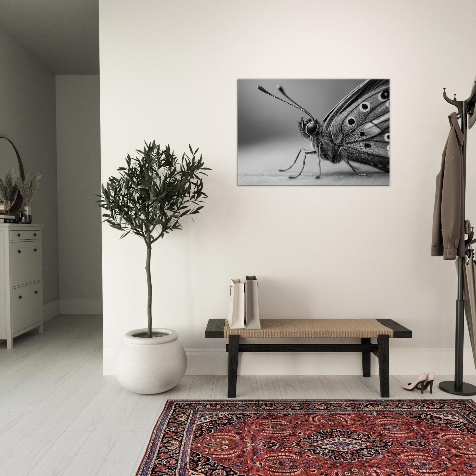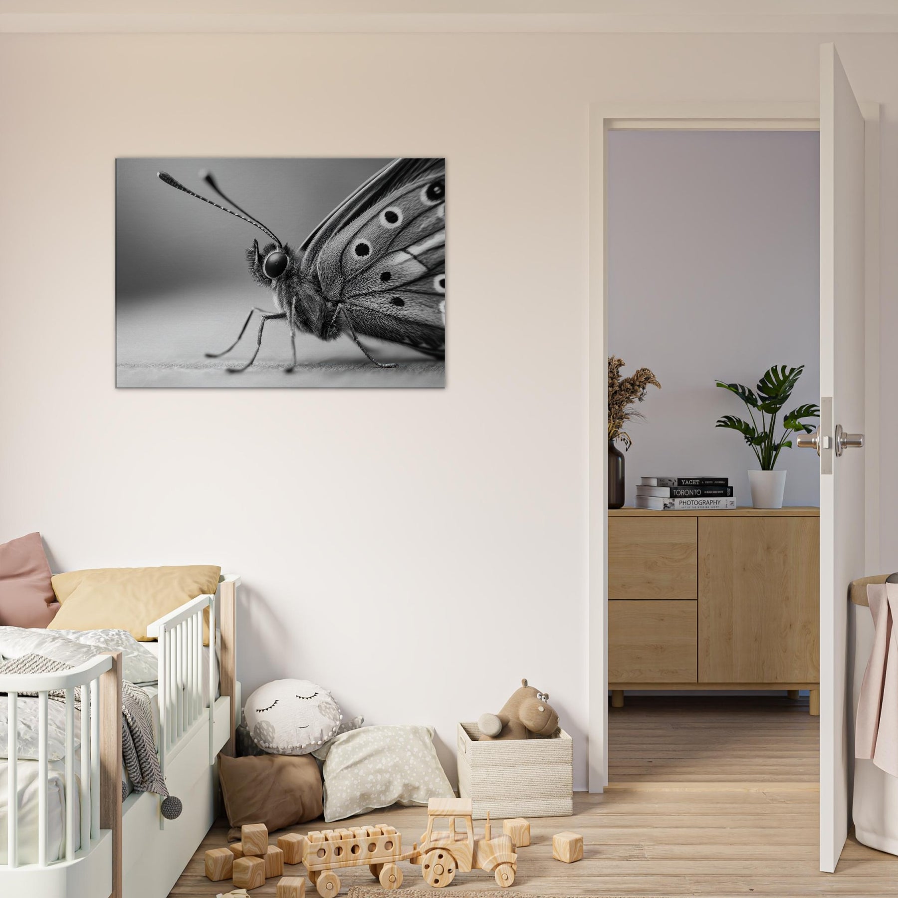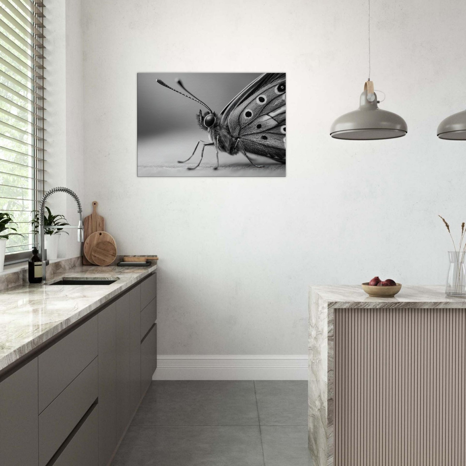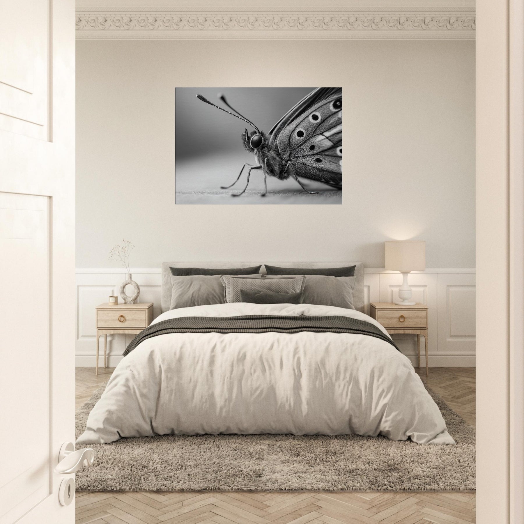 Immerse your space in quiet motion with a Butterfly captured in bold, tonal contrast. This black and white study dissolves color into form, revealing delicate wing texture and the creature's poised grace.