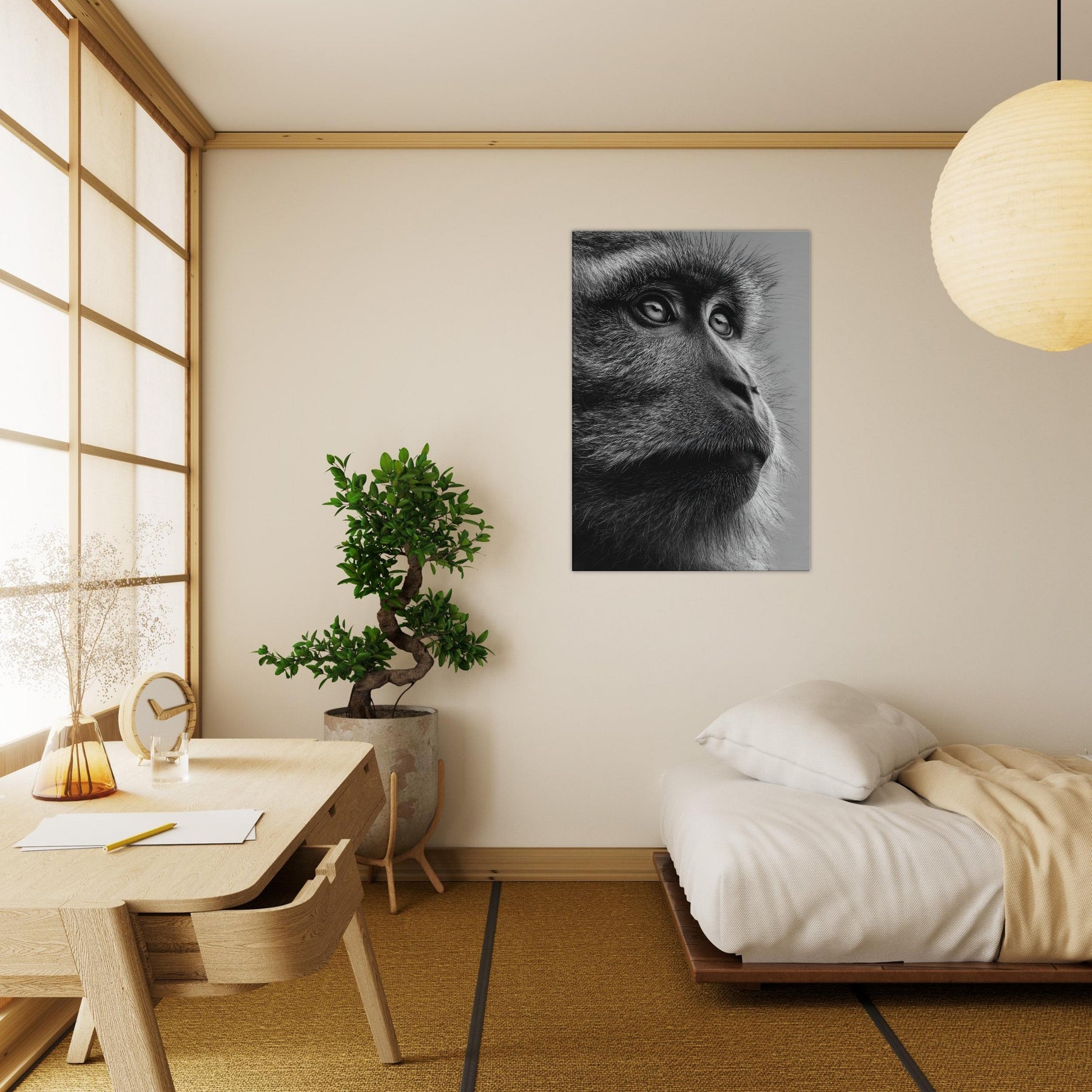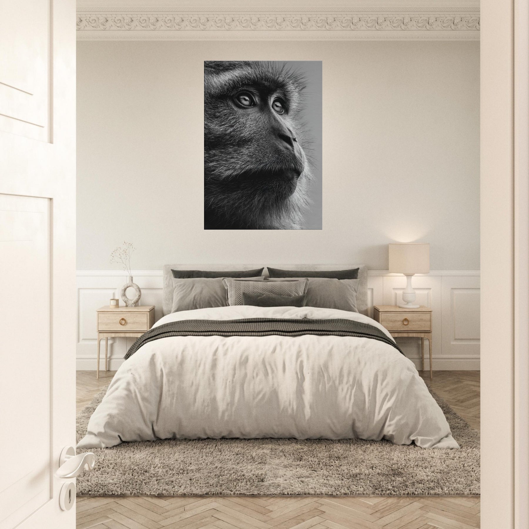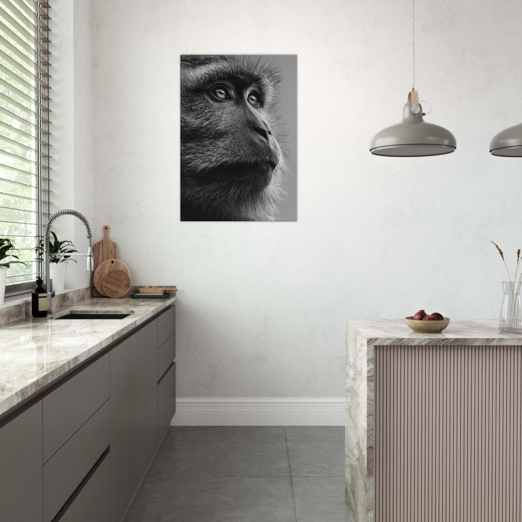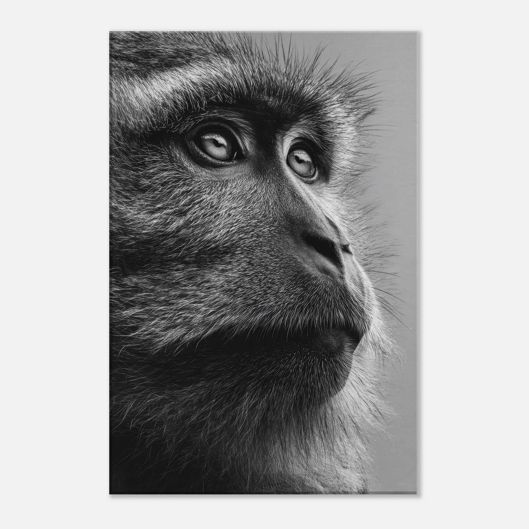 Beneath a black and white spectrum, this close up captures a contemplative Monkey in quiet reverie. The razor-thin fur, the reflective gaze, the way light threads through each strand all render a moment of stillness and grace.