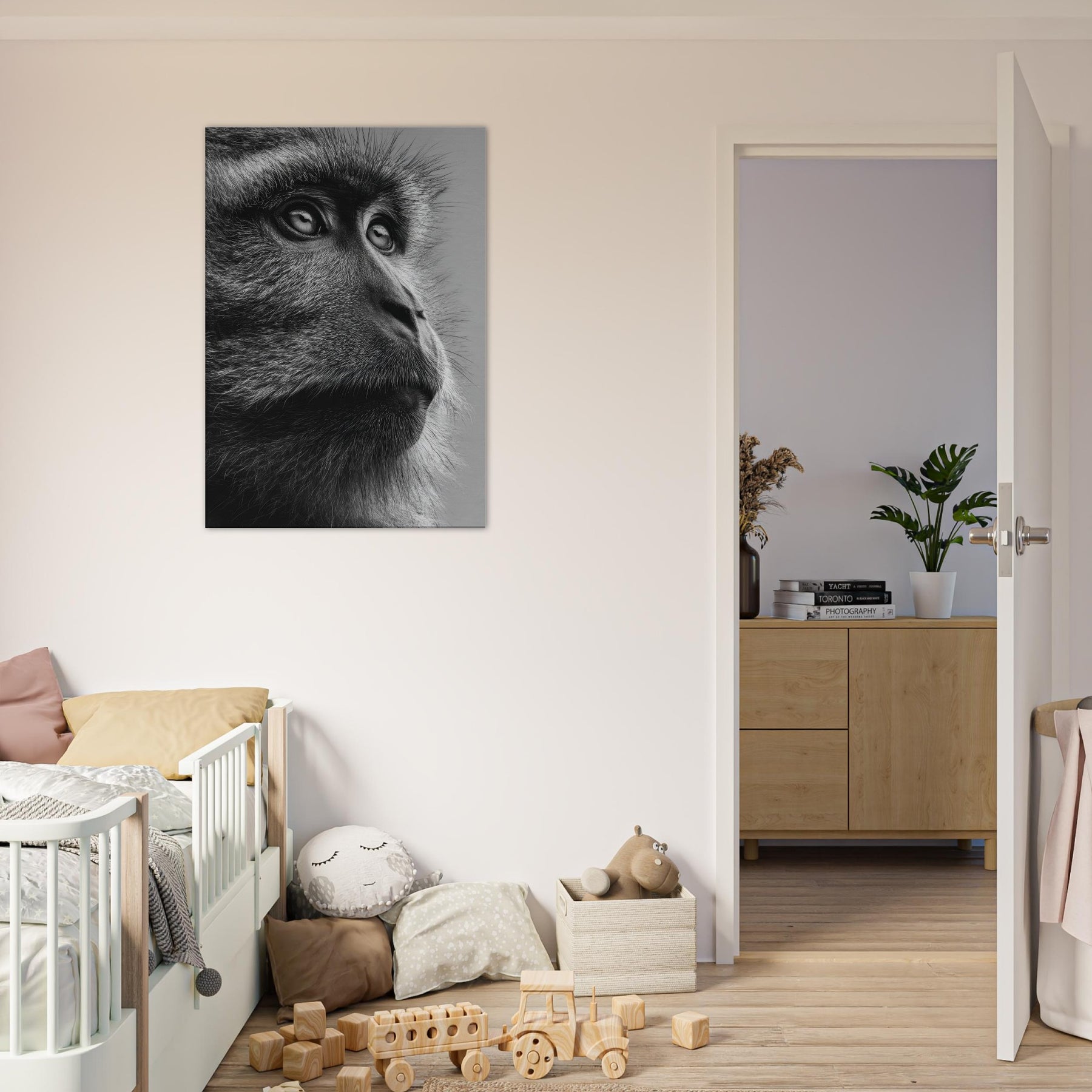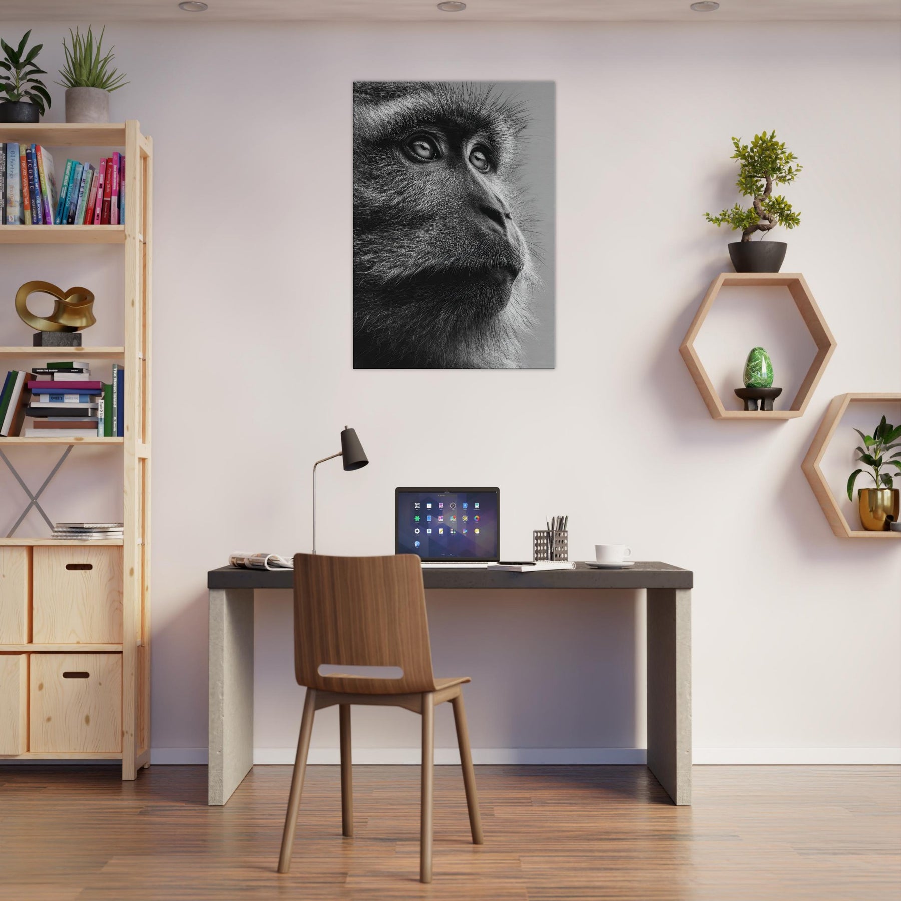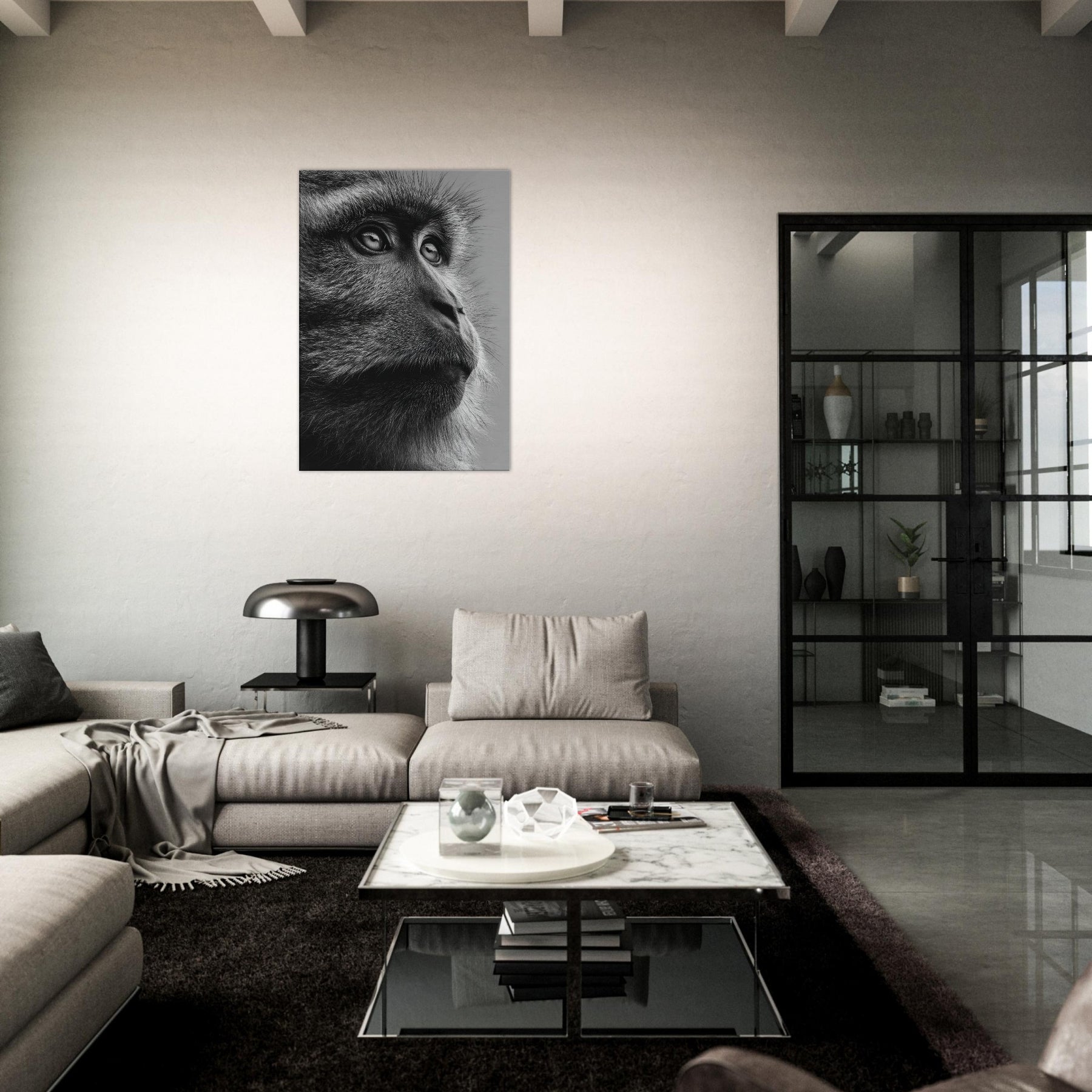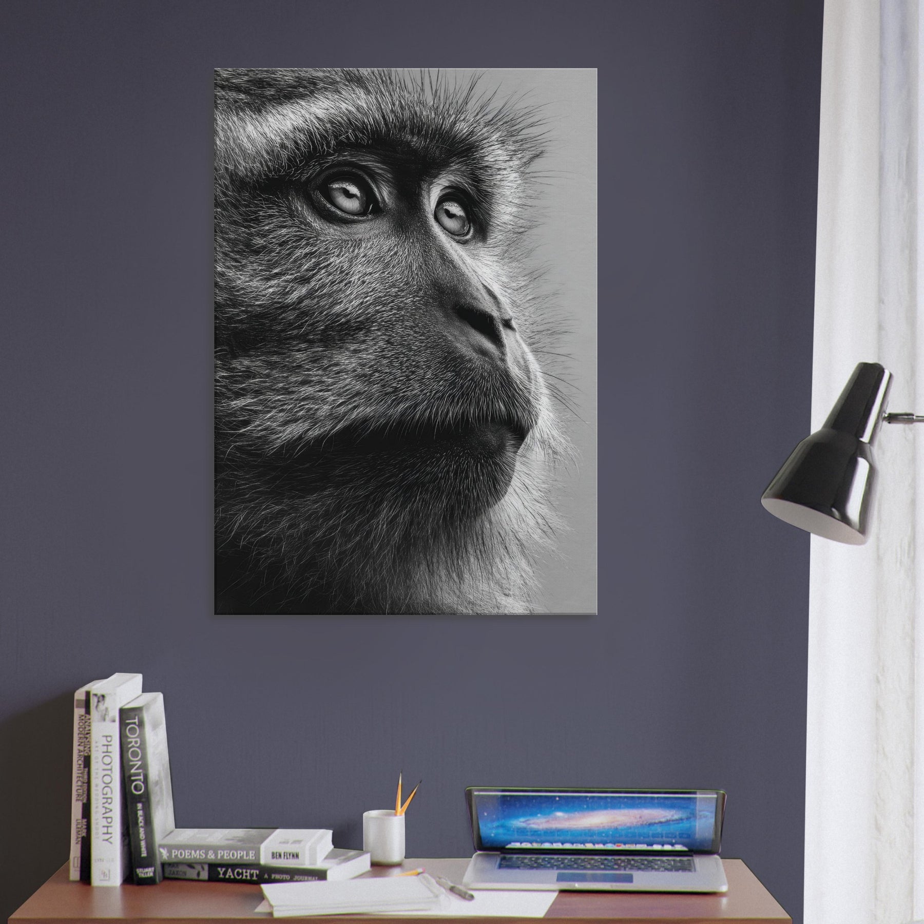 Beneath a black and white spectrum, this close up captures a contemplative Monkey in quiet reverie. The razor-thin fur, the reflective gaze, the way light threads through each strand all render a moment of stillness and grace.
