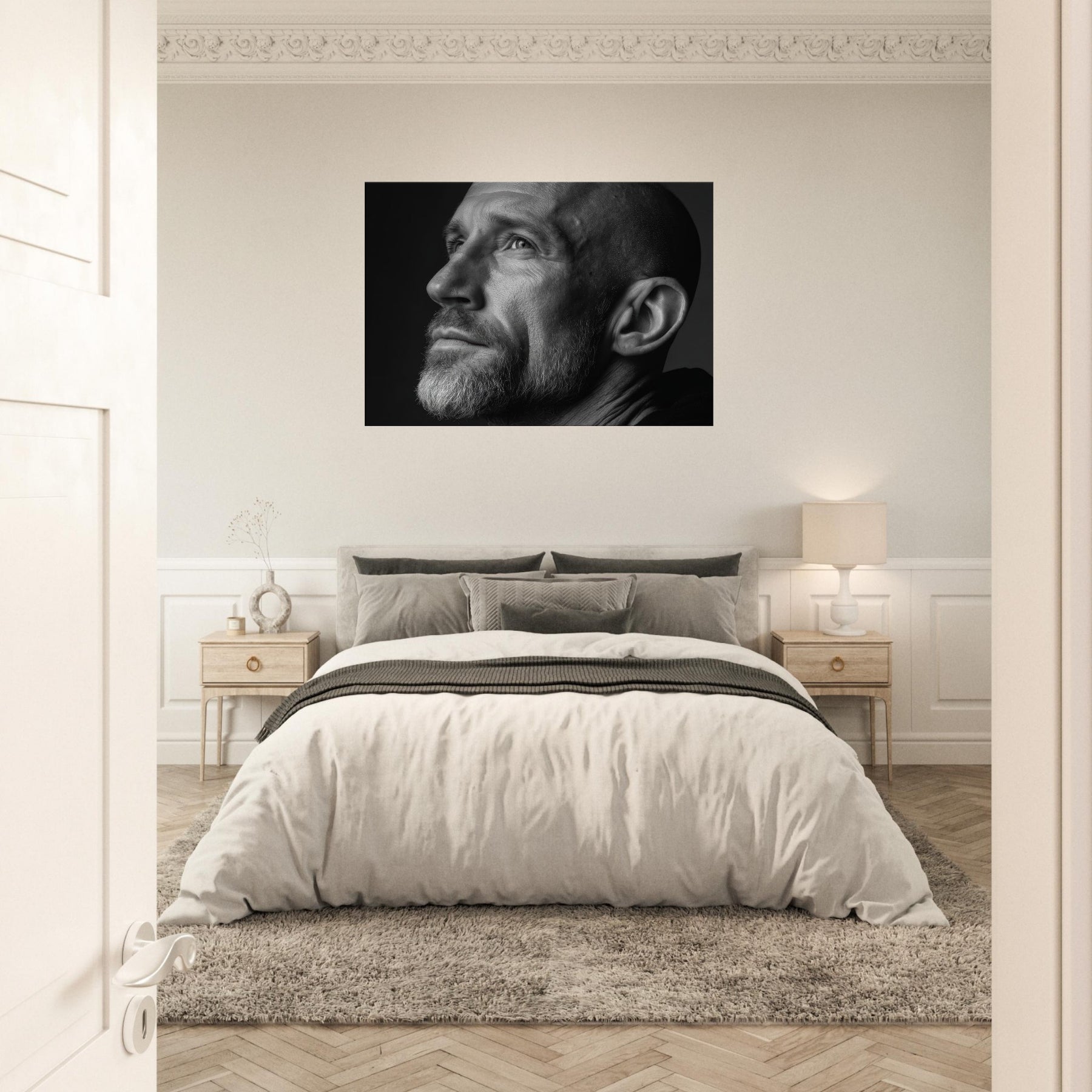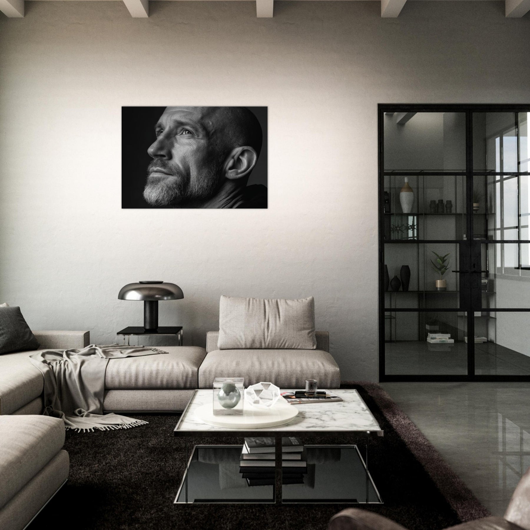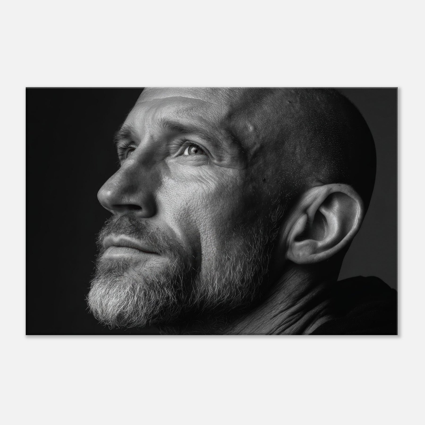 In black and white, the contrasts sculpt mood and texture, inviting a contemplative corner in the living room. Hang it to anchor a monochrome vignette or to lend gravity to conversations about identity and memory. The central subject is Male (Bearded, Tribal, Bald).