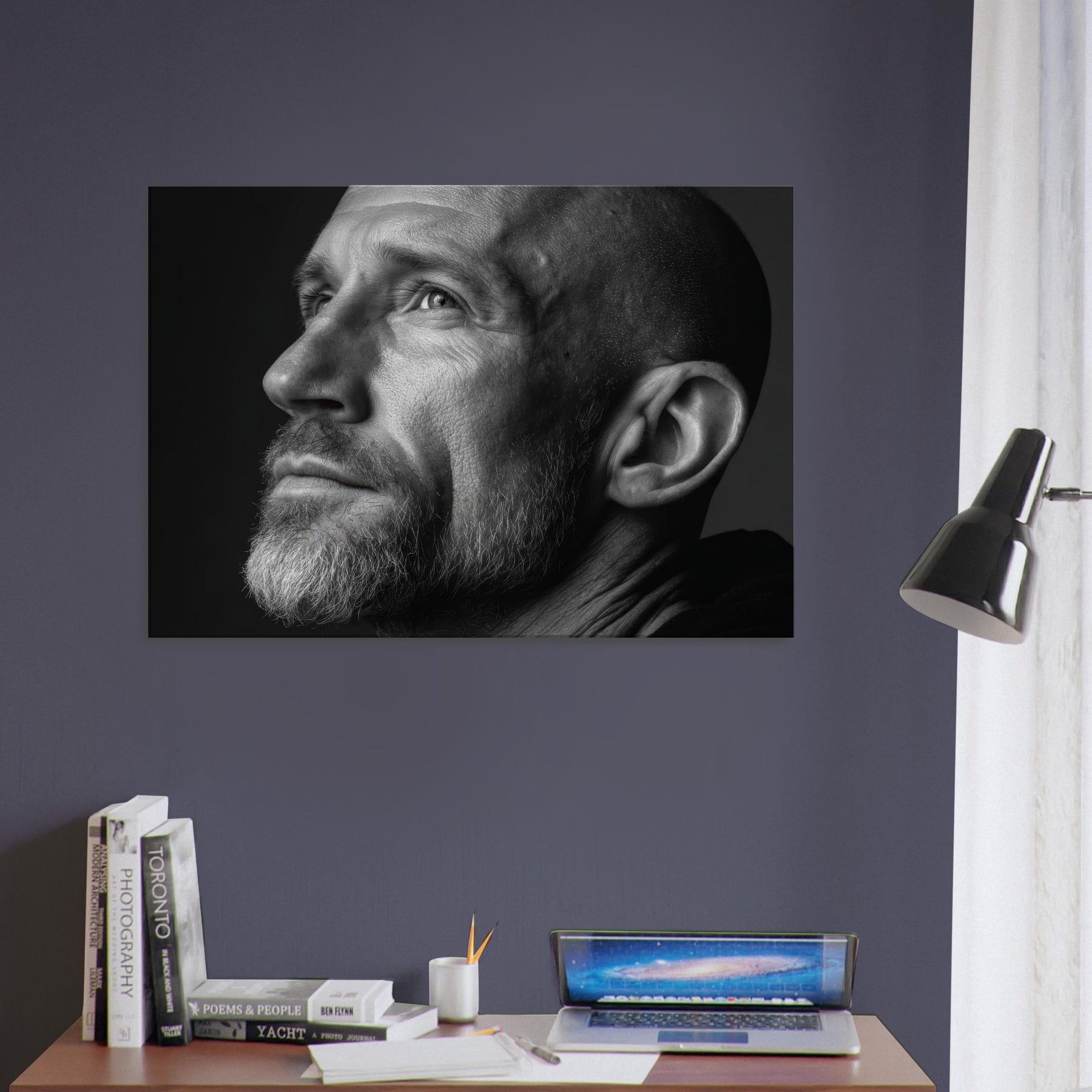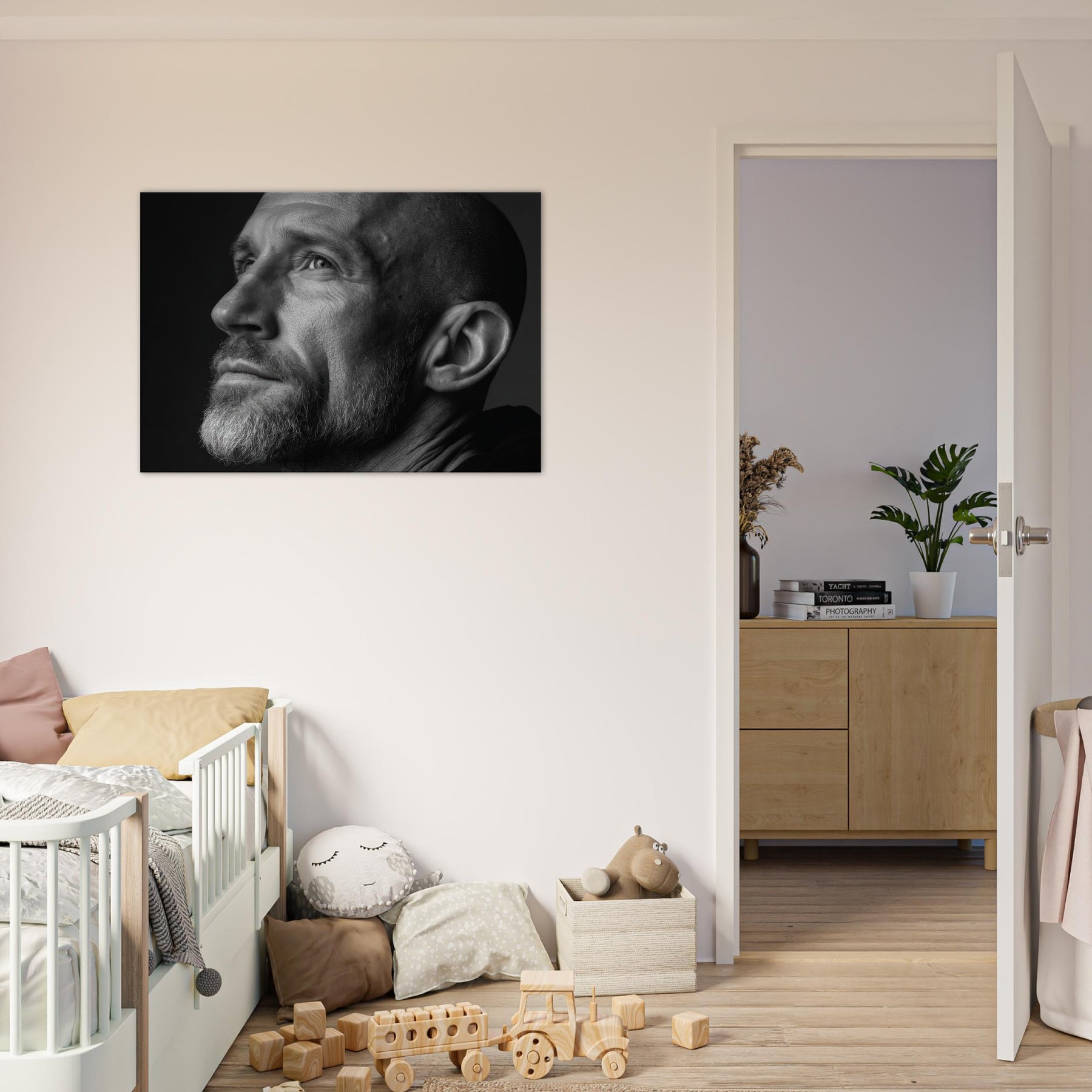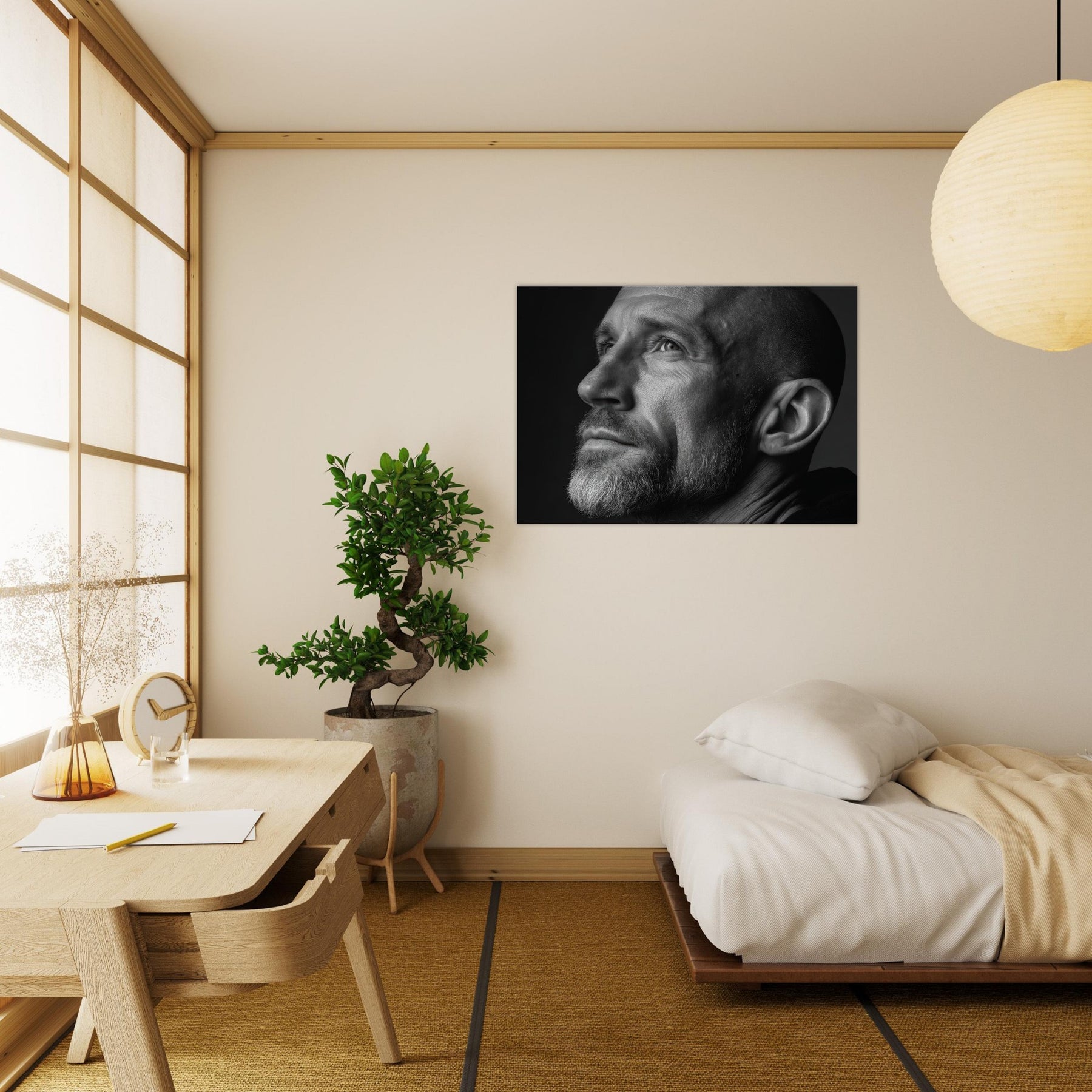 In black and white, the contrasts sculpt mood and texture, inviting a contemplative corner in the living room. Hang it to anchor a monochrome vignette or to lend gravity to conversations about identity and memory. The central subject is Male (Bearded, Tribal, Bald).