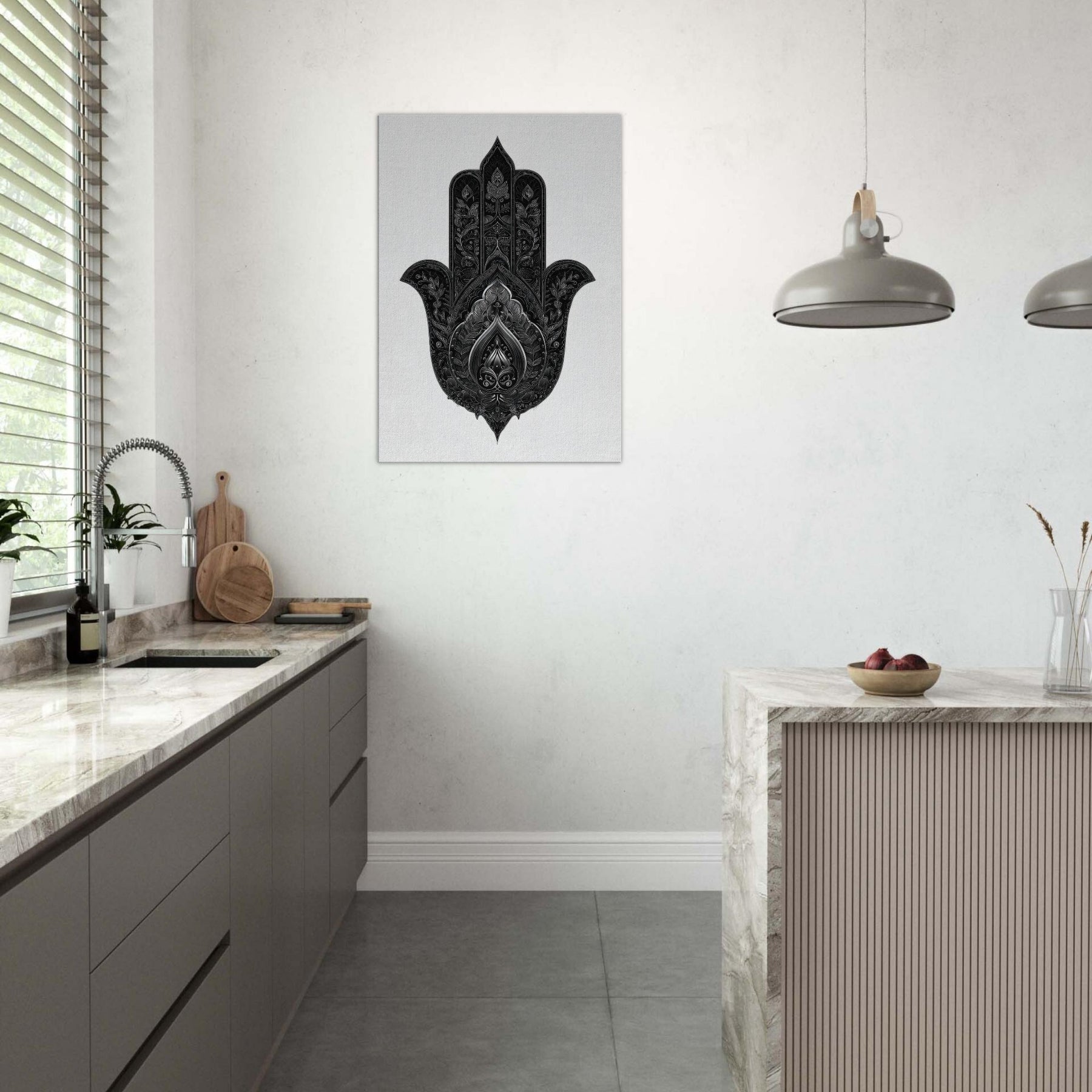 In a living room, the piece gathers light and casts subtle shadows, inviting slow, mindful breaths as you pause before the detail. The black and white palette lends timeless authority, letting the Primary Subject breathe beside modern furnishings, while its tactile ornamentation elevates walls into a sanctuary of calm and subtle wonder.