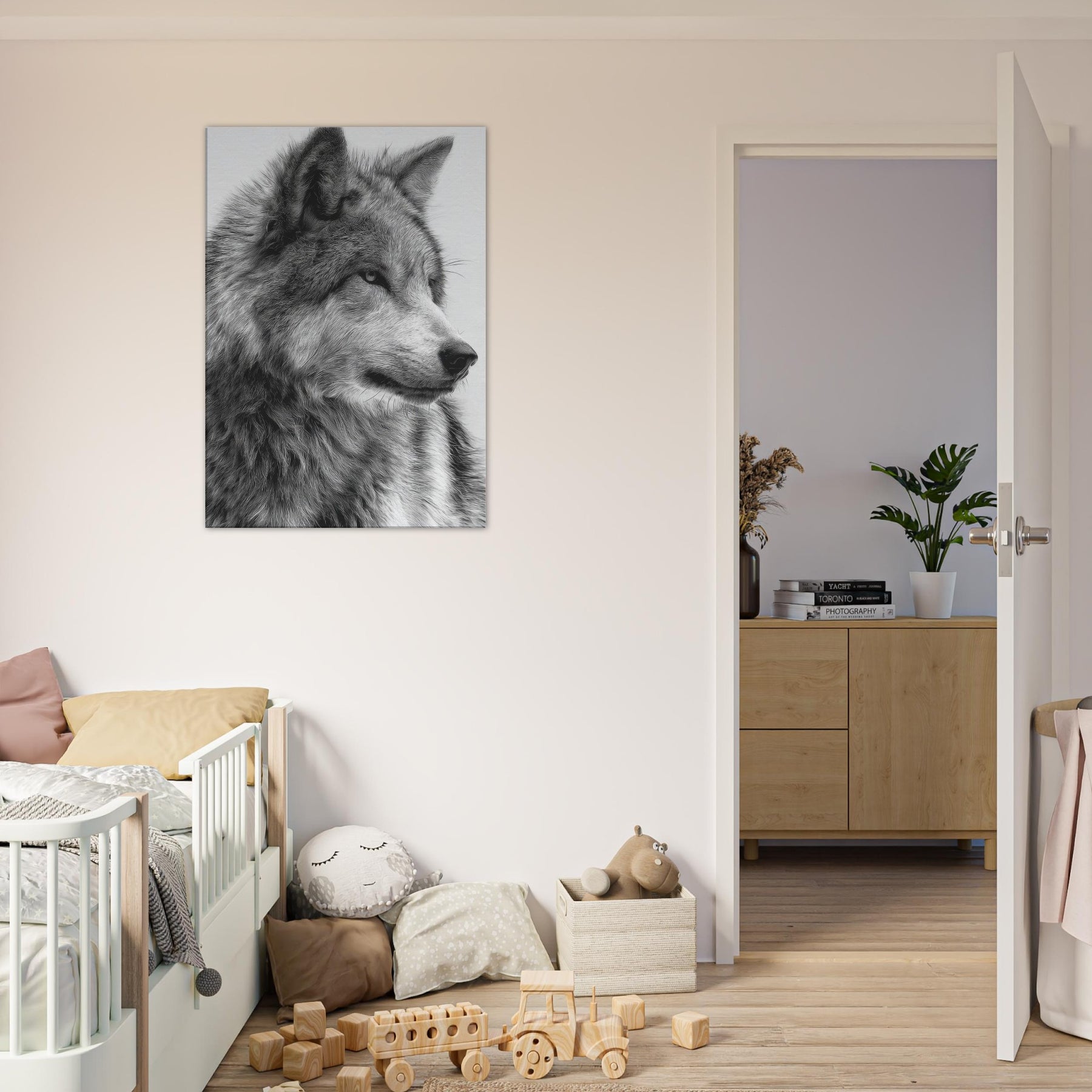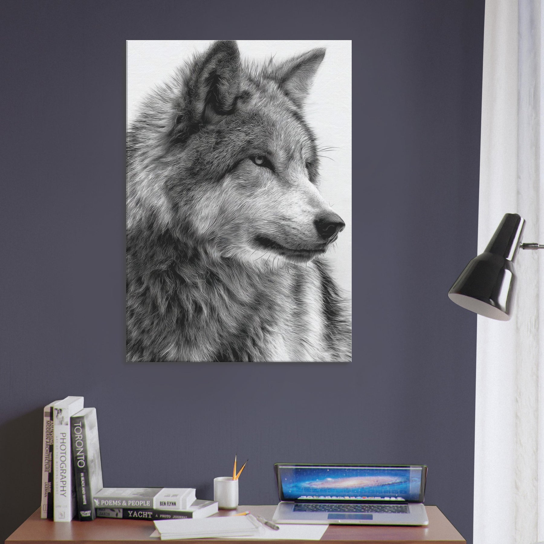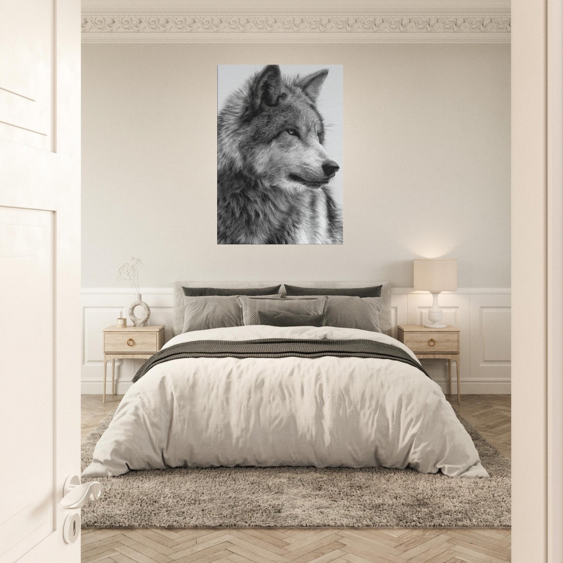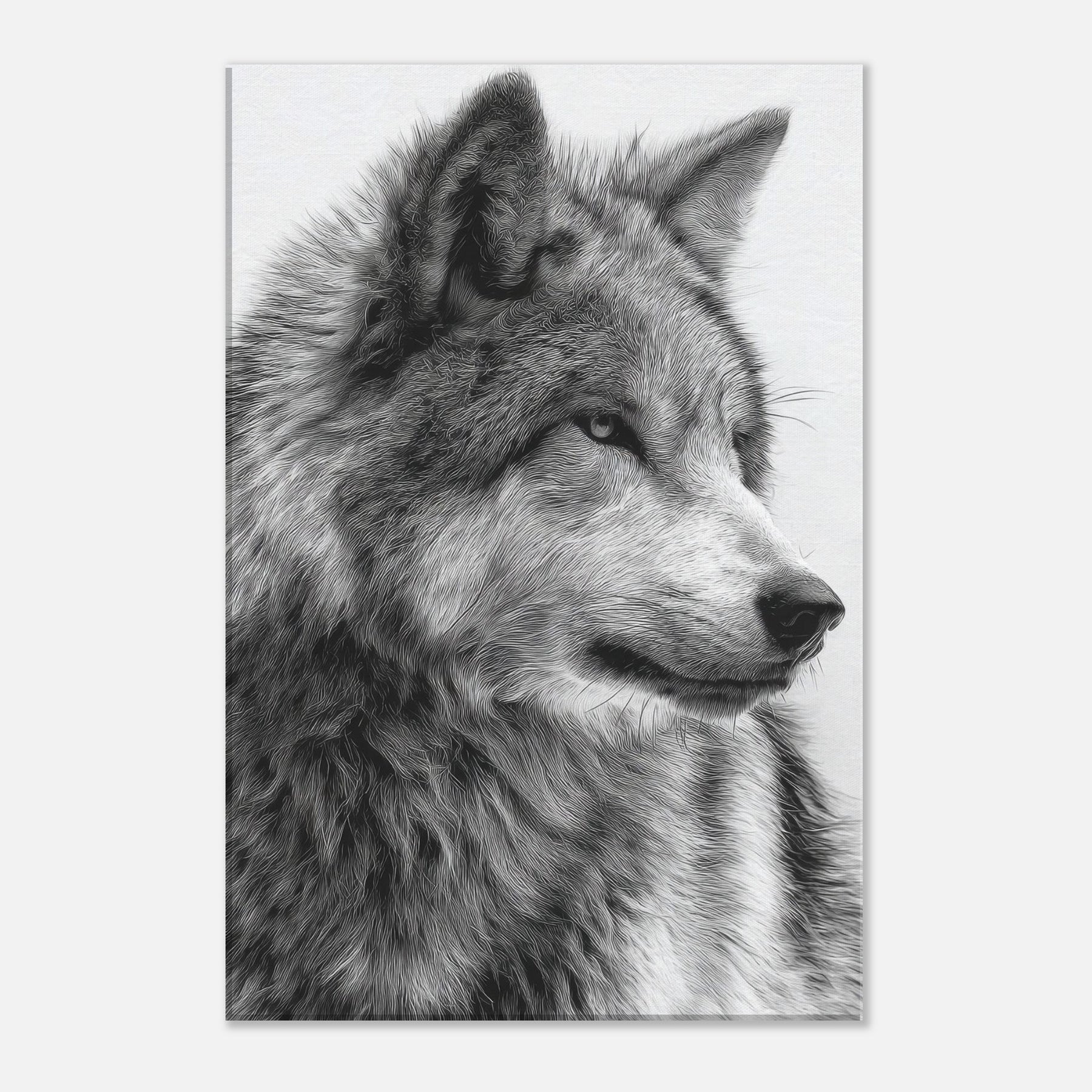The restrained contrast heightens texture and emotion, turning walls into a window of wilderness. The piece exudes immediate presence without shouting, making it ideal for a living room, study, or entryway. Hang it solo for a dramatic focal point or pair it with softer textures to summon a sense of nocturnal calm and timeless strength.