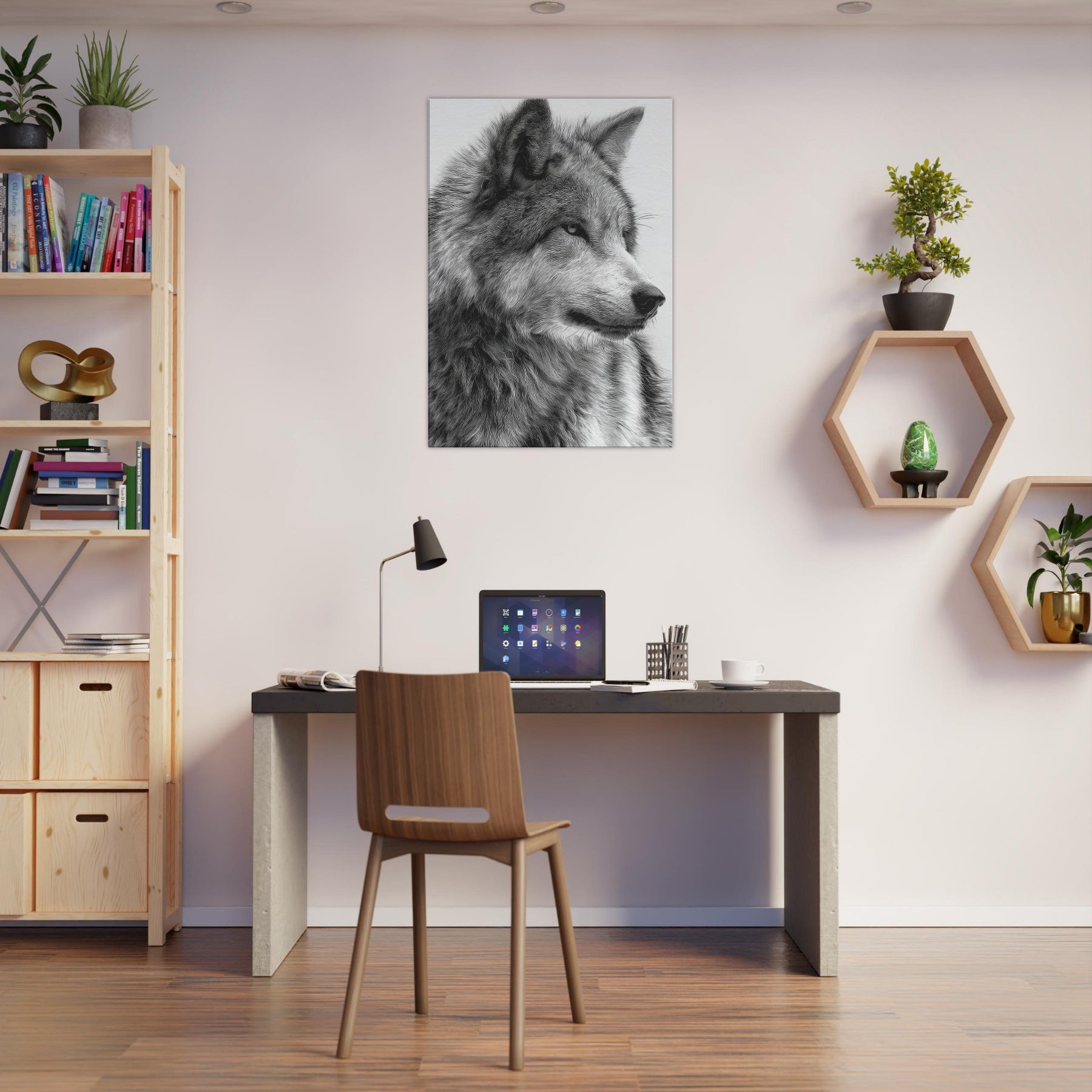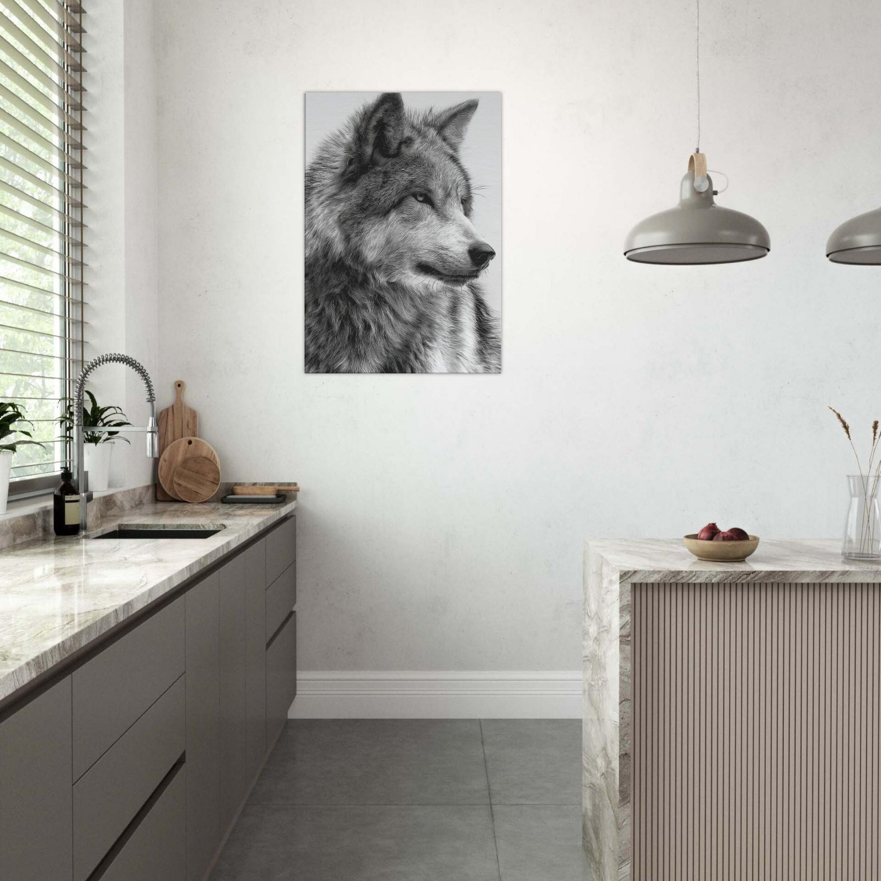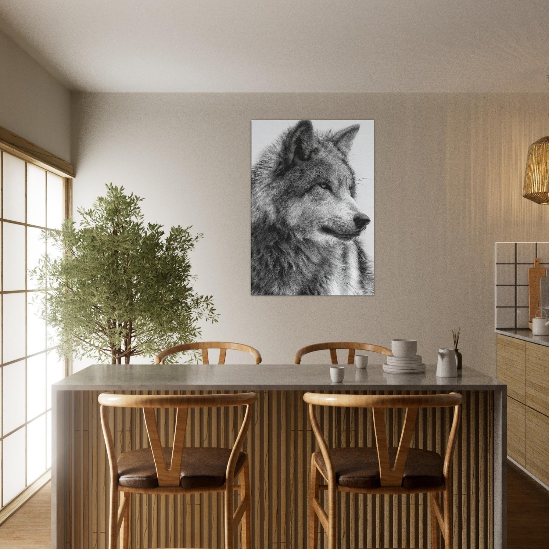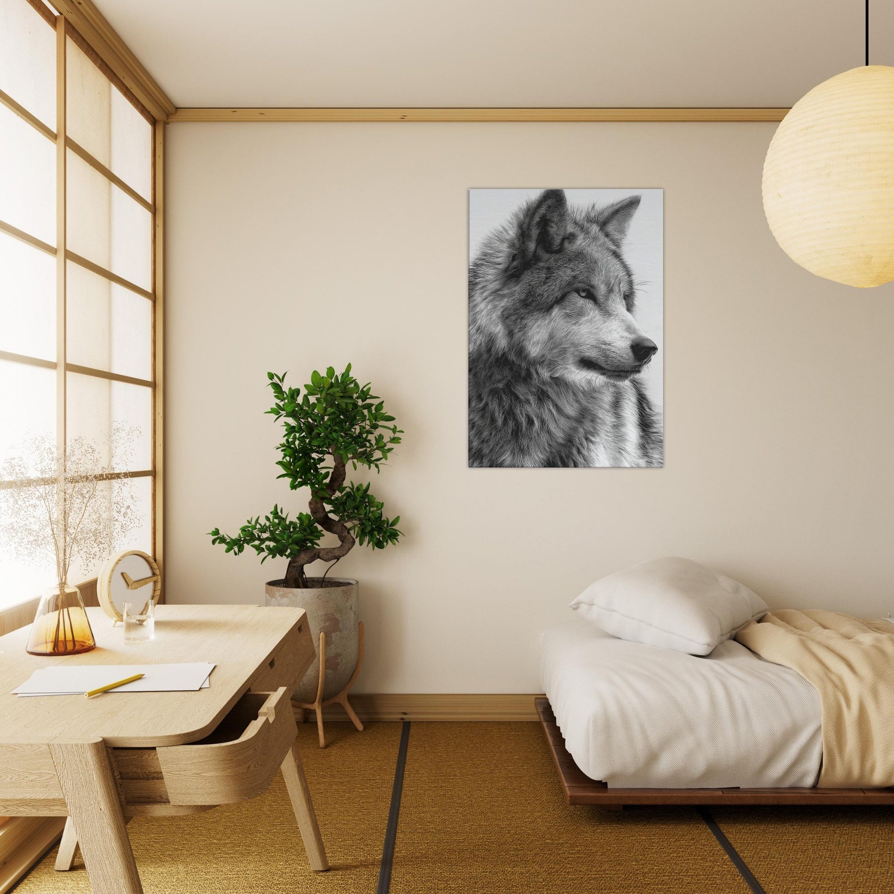 The restrained contrast heightens texture and emotion, turning walls into a window of wilderness. The piece exudes immediate presence without shouting, making it ideal for a living room, study, or entryway. Hang it solo for a dramatic focal point or pair it with softer textures to summon a sense of nocturnal calm and timeless strength.