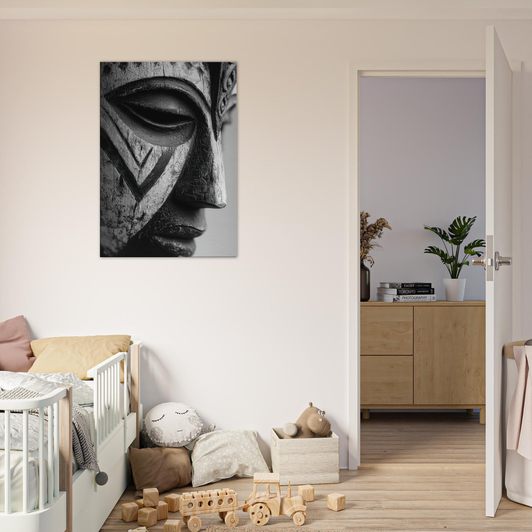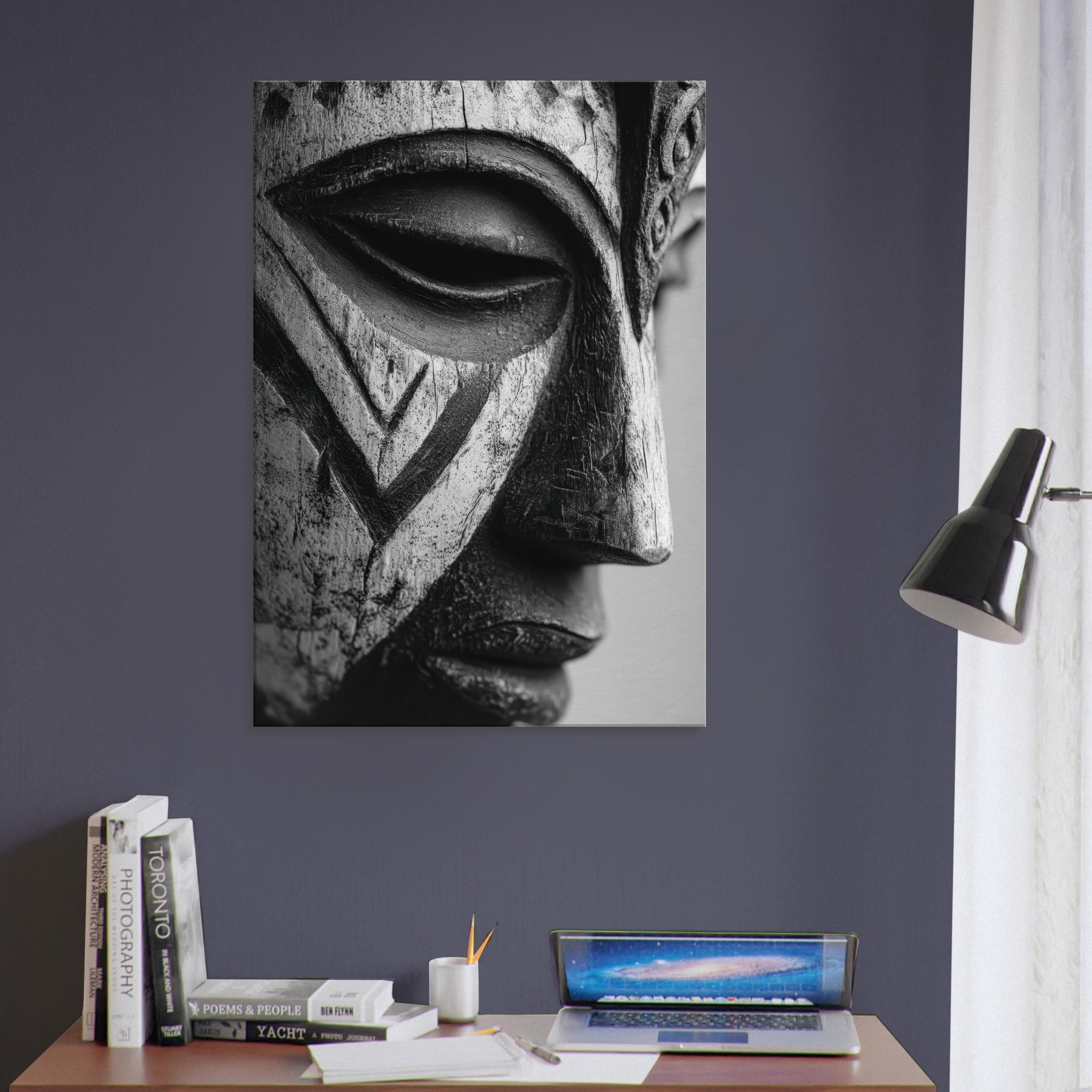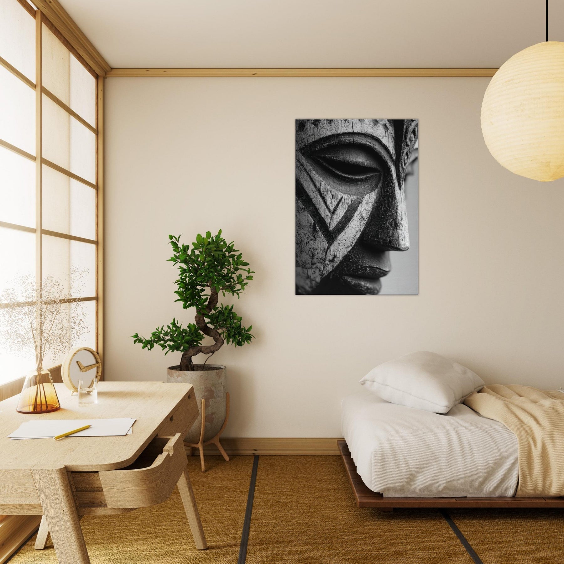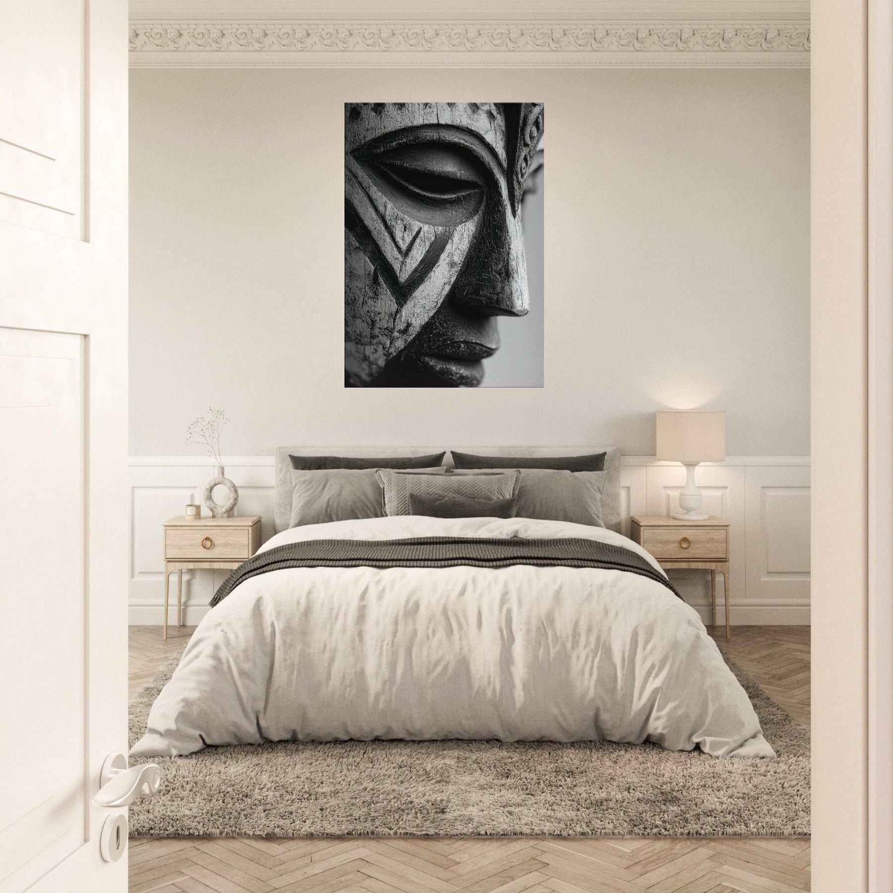This piece centers on a Tribal Mask, its contours catching light and shadow, grounding the room with a primal rhythm.