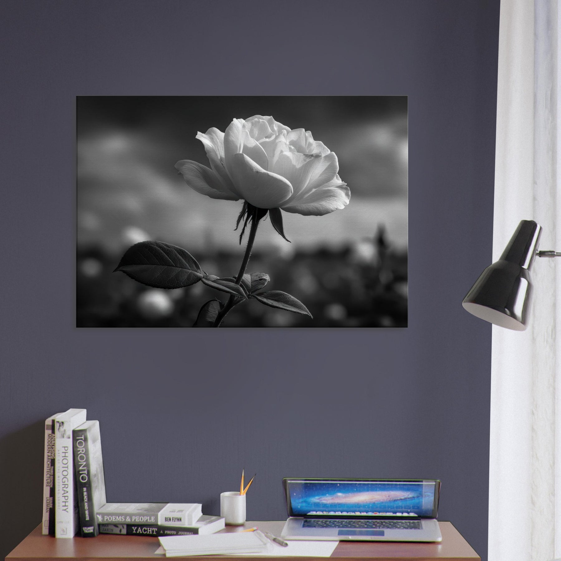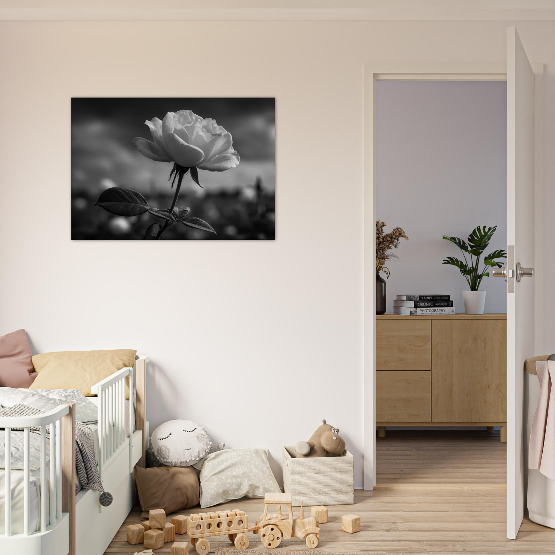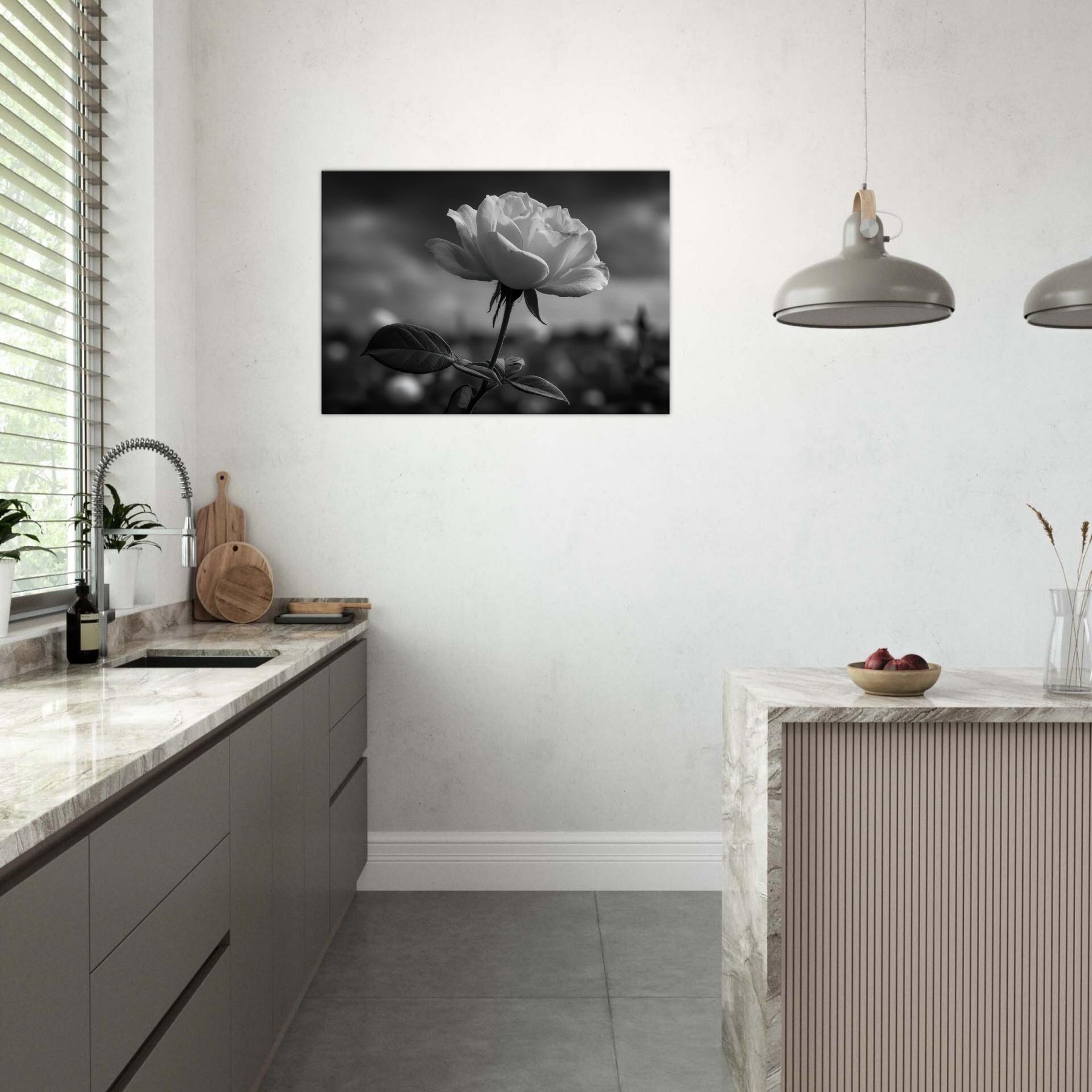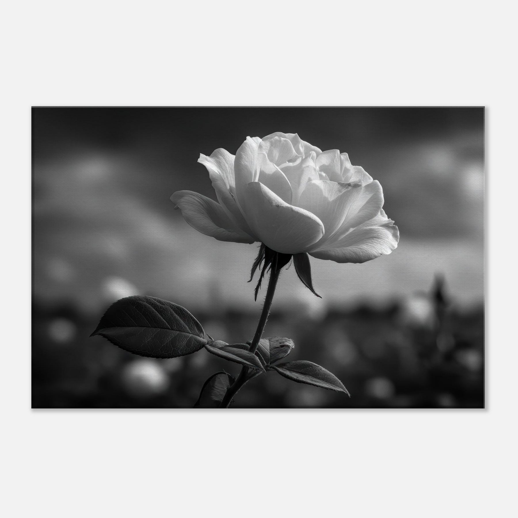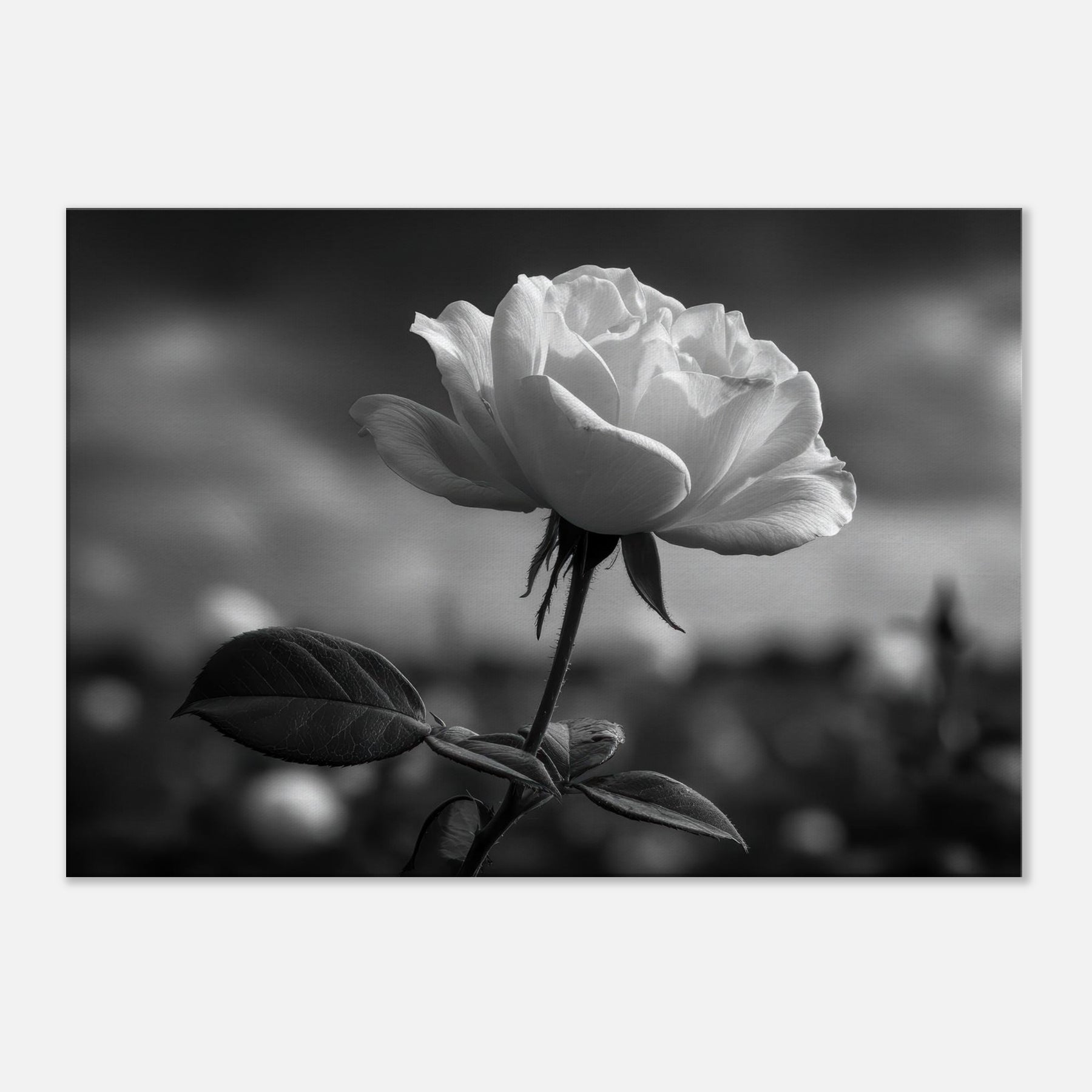 A quiet study in contrast, this black and white close up renders a single Rose with sculpted petals and velvety shadows. The atmosphere is moody, almost nocturnal, inviting reflection as light threads through its curves. Framed in understated scale, it invites calm focus in a living room or bedroom, turning a wall into a contemplative vignette. As the primary subject, the Rose radiates graceful resilience, its delicate linework and graphite tones evoking memory, quiet romance, and everyday luxury.