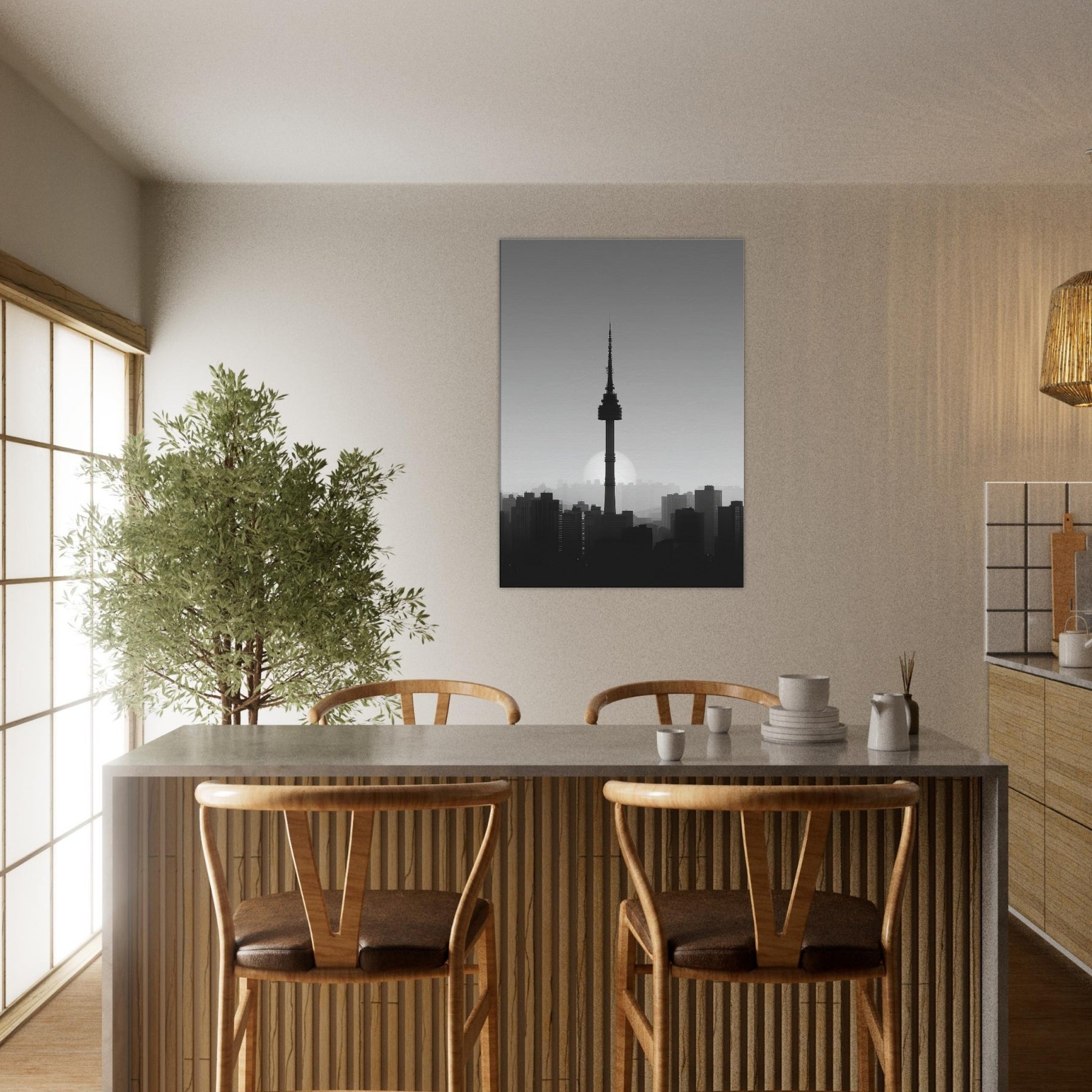 In monochrome, this image distills Seoul's hum into a breath of ink and light. The city becomes a quiet rhythm: a single tower rising above a silenced skyline, the sun sinking behind glass and concrete.