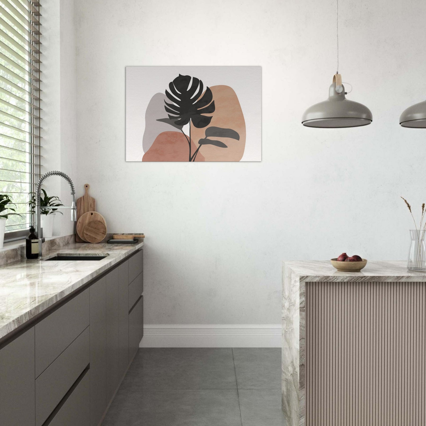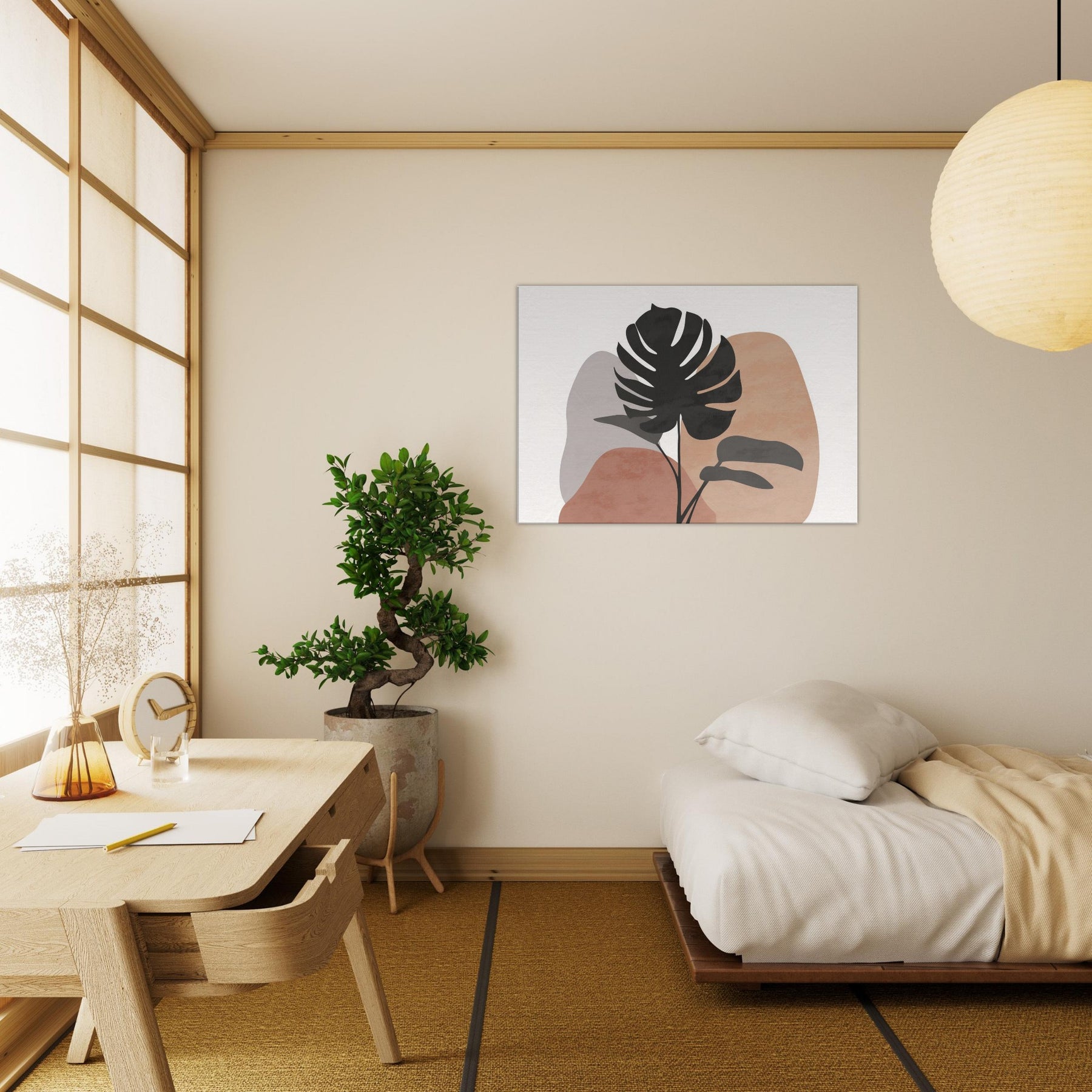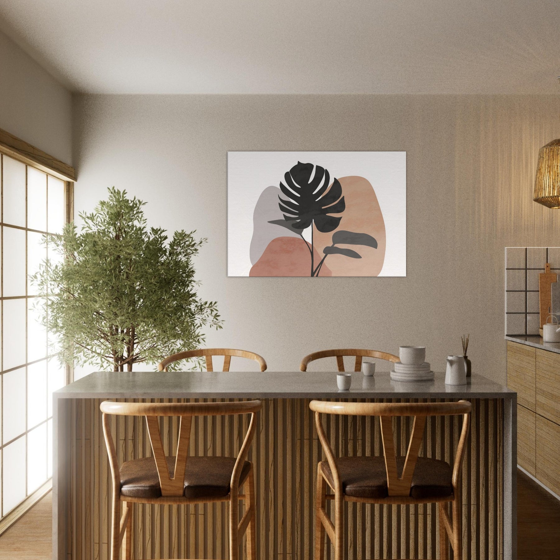 Calm, sunlit air meets quiet lines in this minimalist Monstera study. A single tropical silhouette rises against soft, earthy hues, inviting a breath of nature into your living space. The Monstera's sculpted form feels both bold and serene, balancing modern decor with organic warmth. Hang it above a sofa or console to channel effortless tranquility, as if a forest breeze paused in your room.