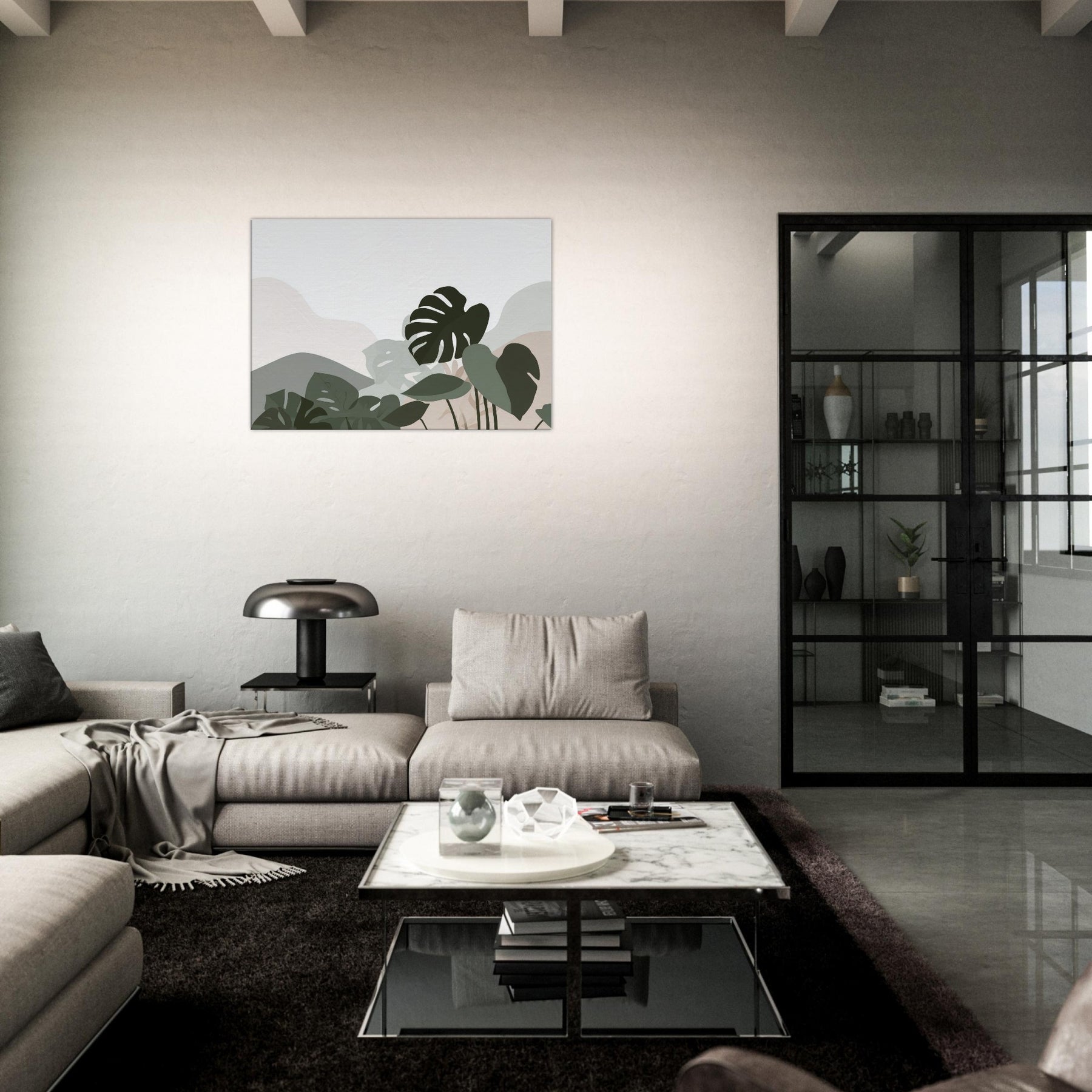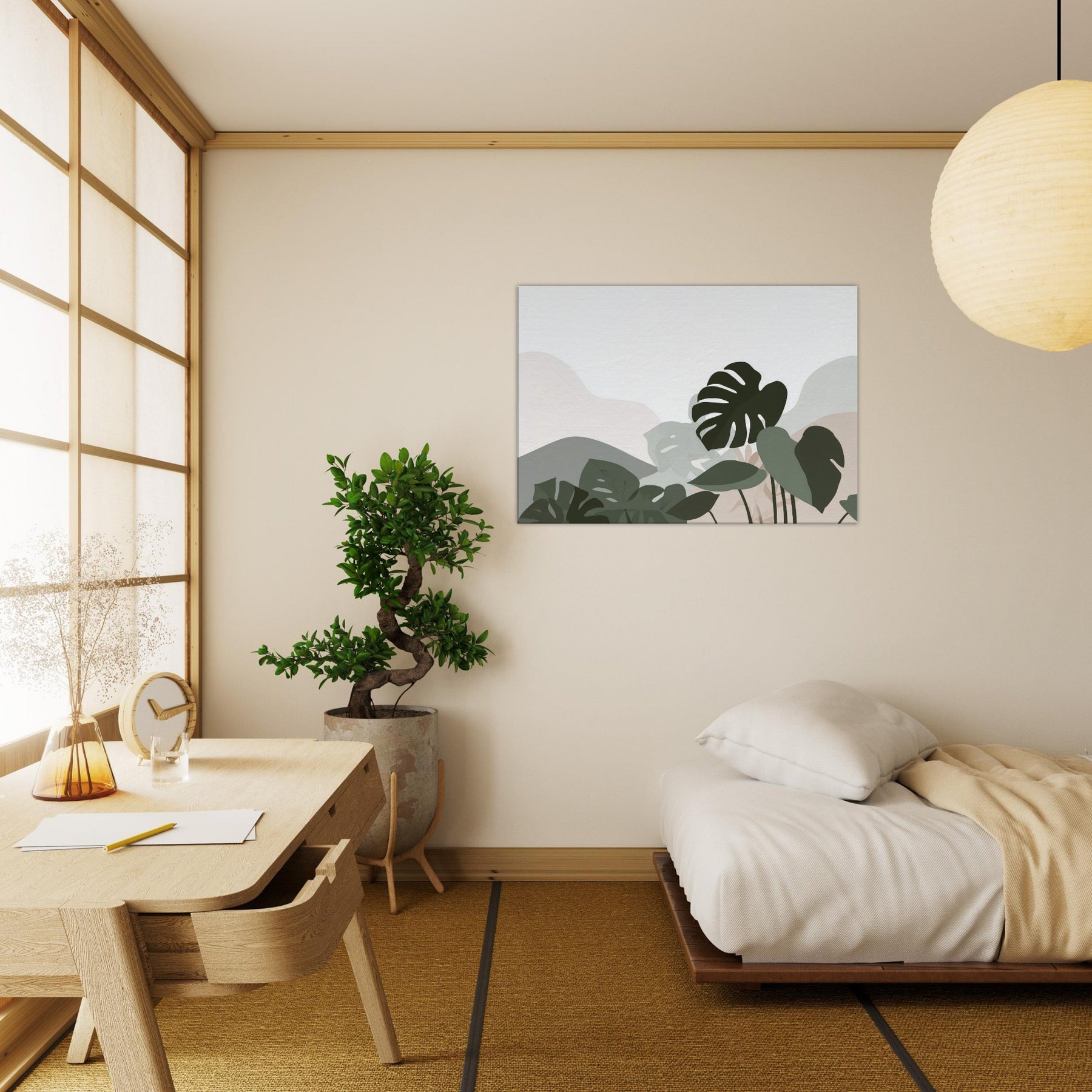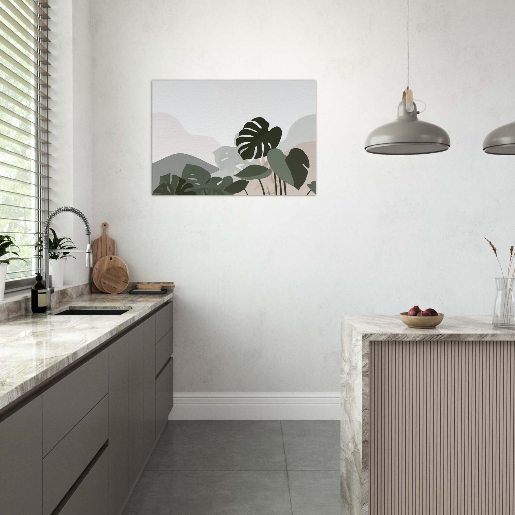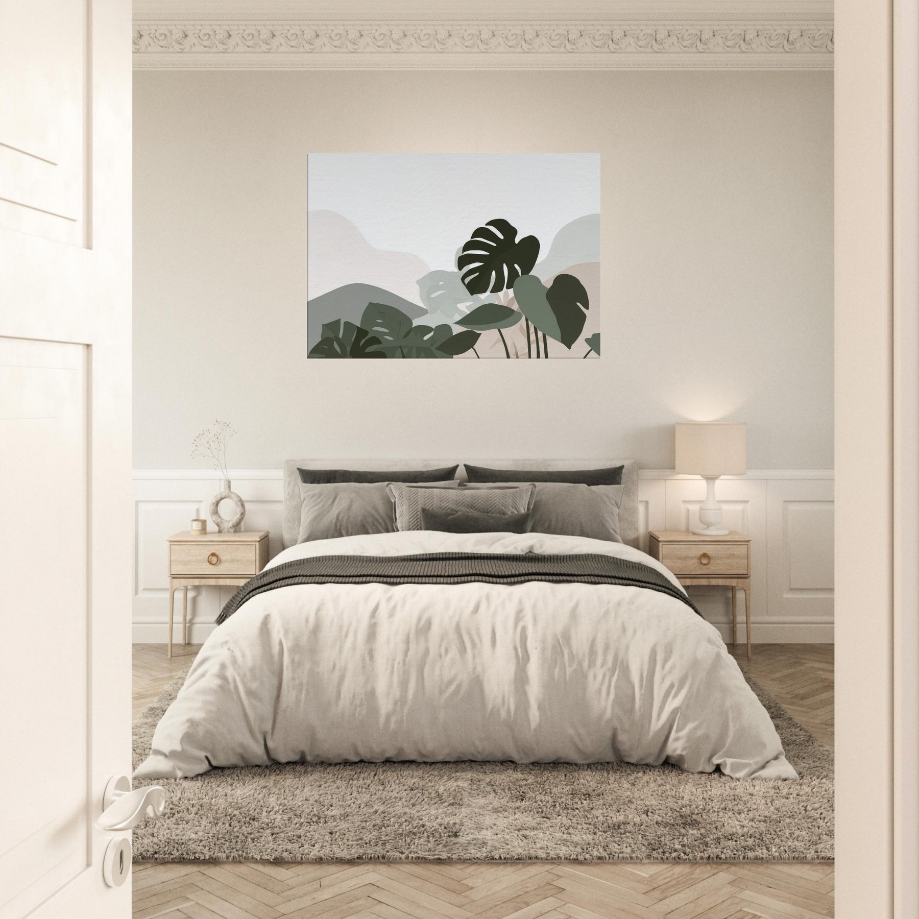 Monstera Quietude invites calm into any room, a minimalist ode to nature carved in soft, overlapping silhouettes. The Monstera leaves drift across a cool, neutral canvas, their shapes reduced to pure gesture and quiet tension. Light plays through the negative spaces, casting a tranquil atmosphere that enhances a living room, bedroom, or study. The restrained palette of sage, olive, and whisper soft beige offers an elegant breath of greenery without overpowering, making the space feel open, serene, and effortlessly refined.