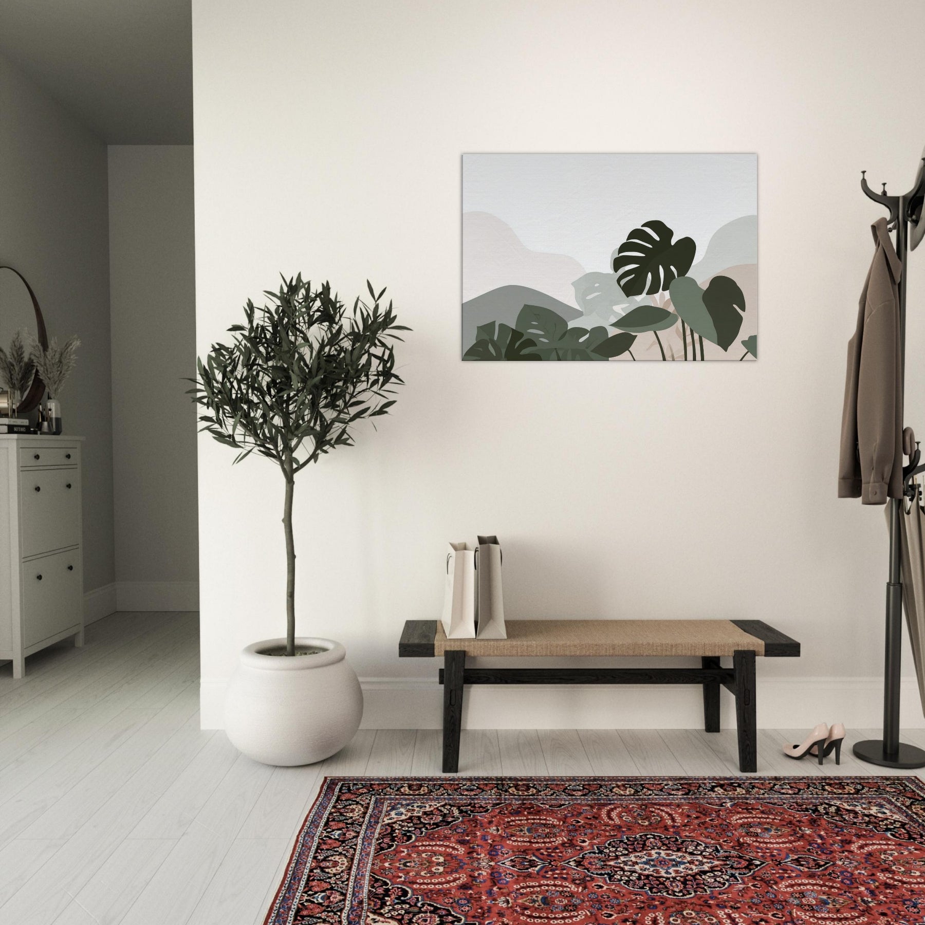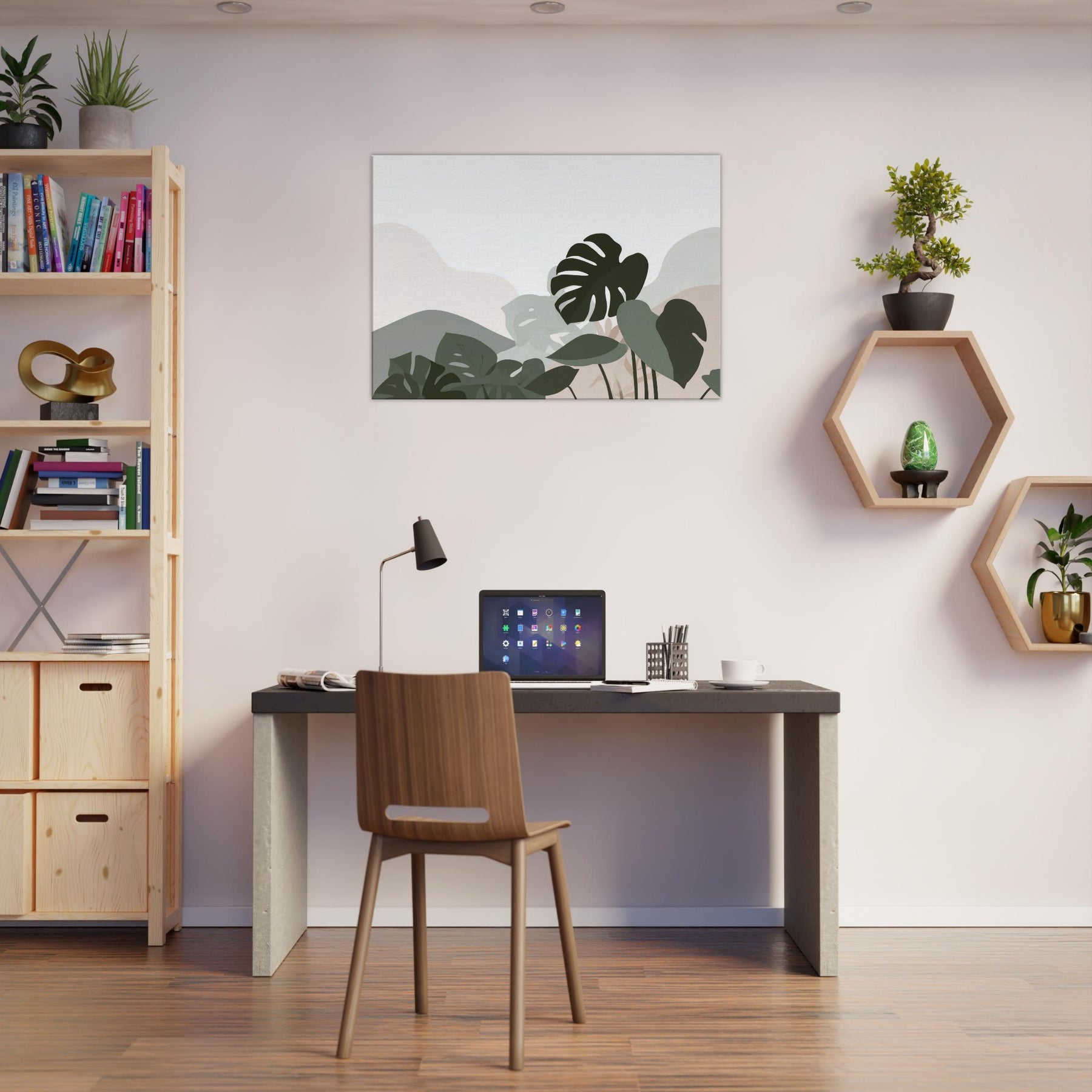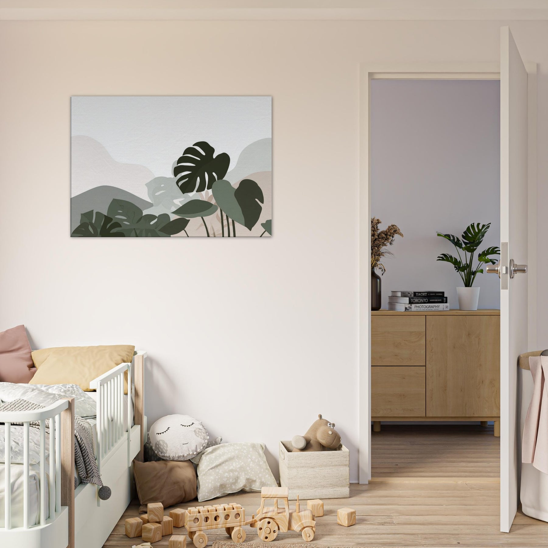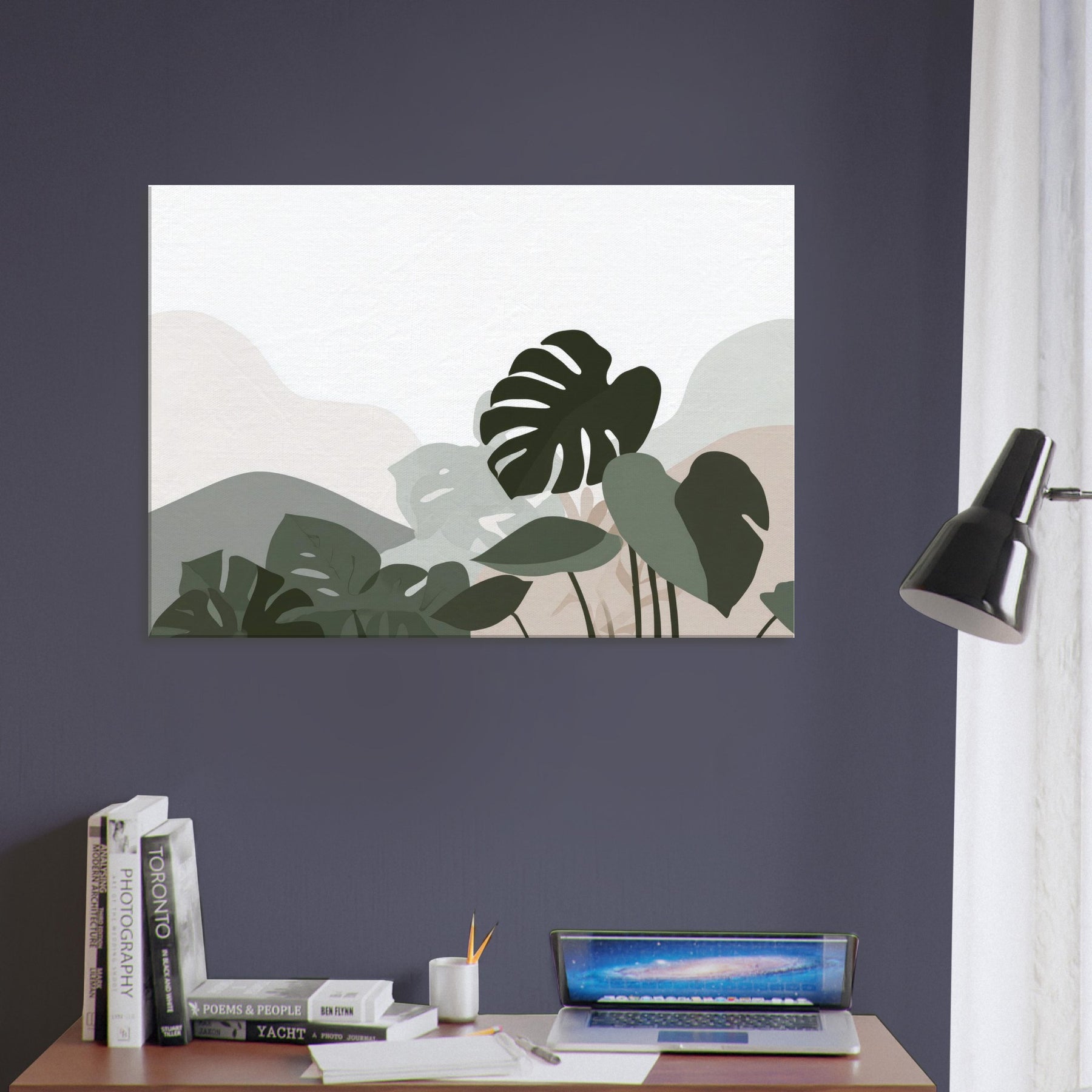 Monstera Quietude invites calm into any room, a minimalist ode to nature carved in soft, overlapping silhouettes. The Monstera leaves drift across a cool, neutral canvas, their shapes reduced to pure gesture and quiet tension. Light plays through the negative spaces, casting a tranquil atmosphere that enhances a living room, bedroom, or study. The restrained palette of sage, olive, and whisper soft beige offers an elegant breath of greenery without overpowering, making the space feel open, serene, and effortlessly refined.