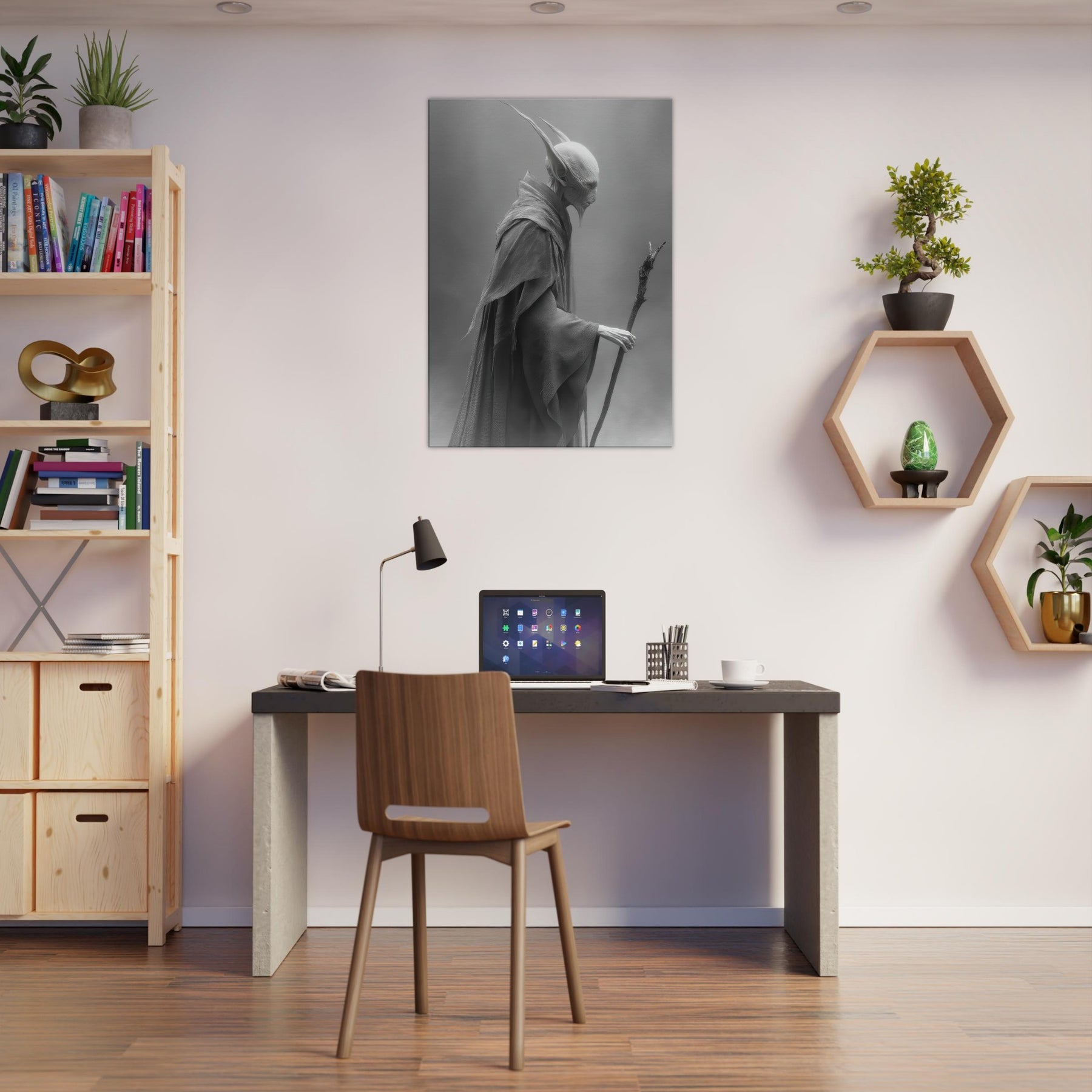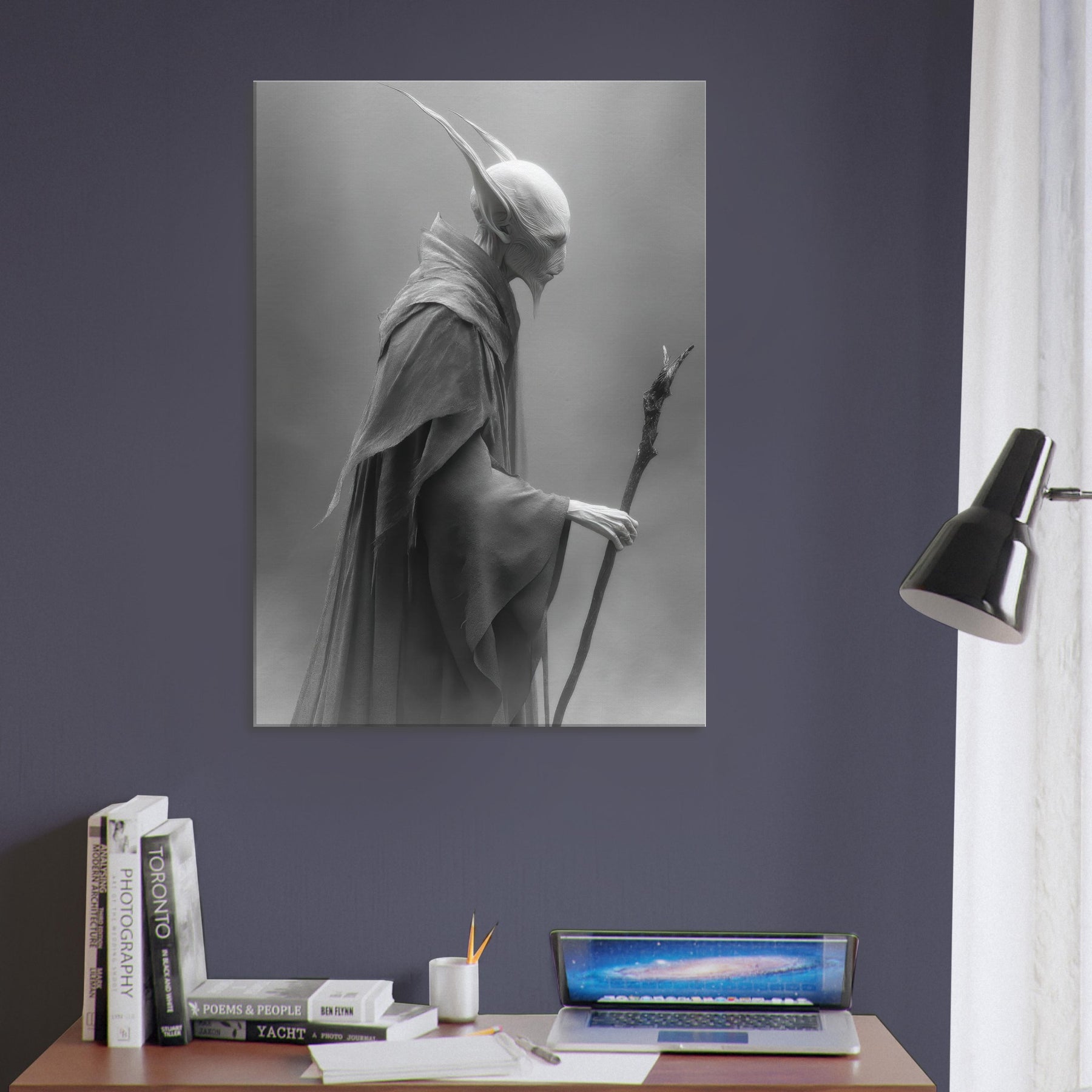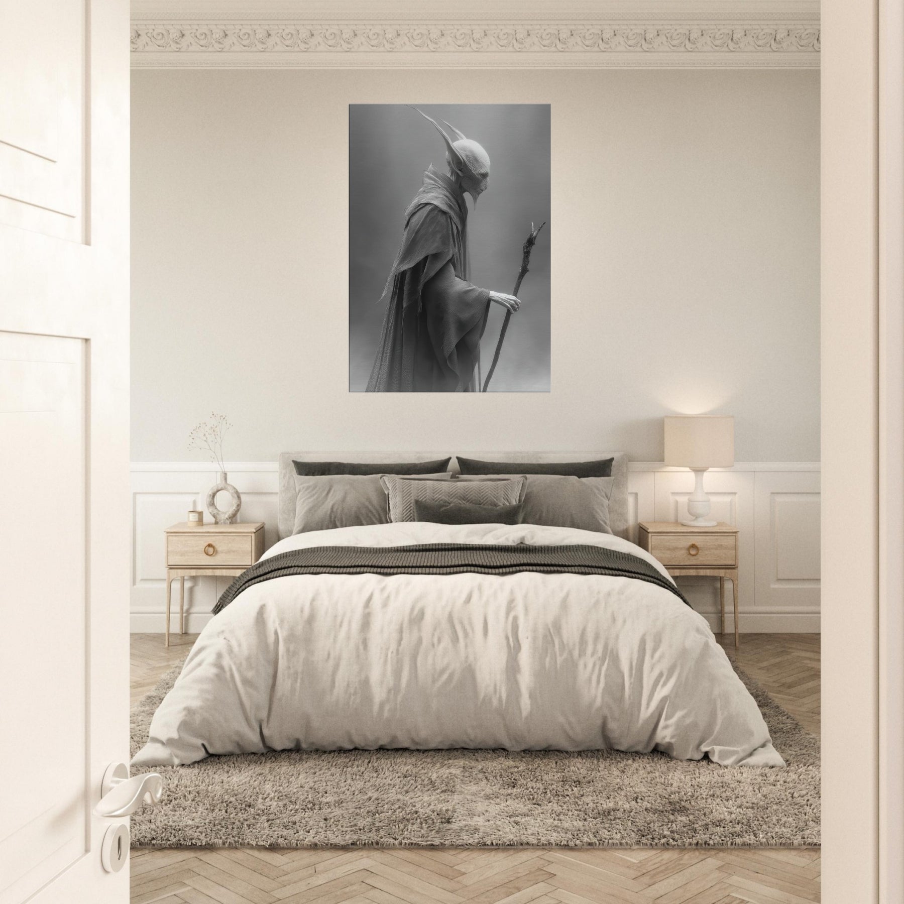 This black and white portrayal invites quiet contemplation, turning a wall into a doorway to myth. Hang it to conjure a dusky, dreamlike atmosphere perfect for a reading nook, meditation corner, or refined living room where every shadow feels intentional and calm.