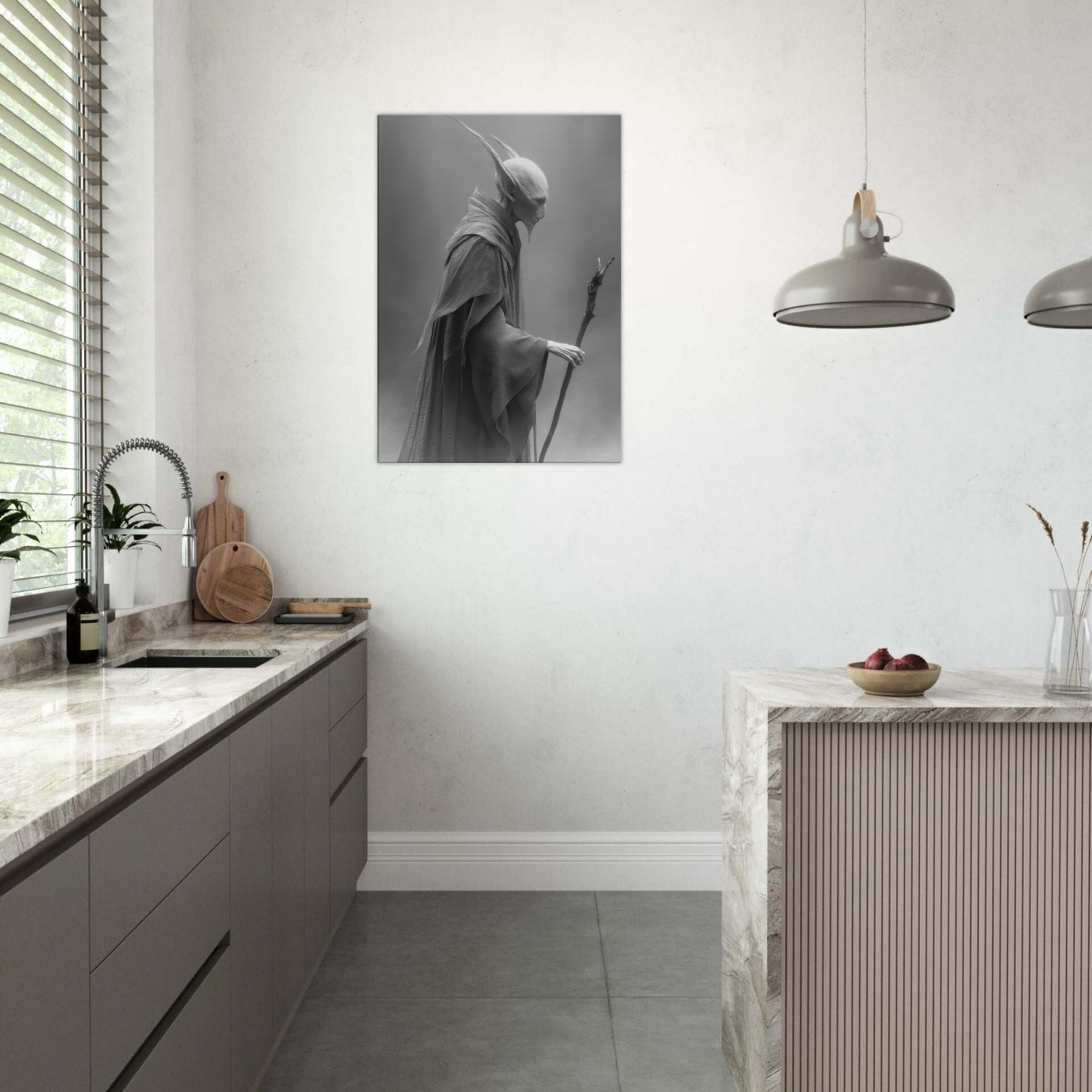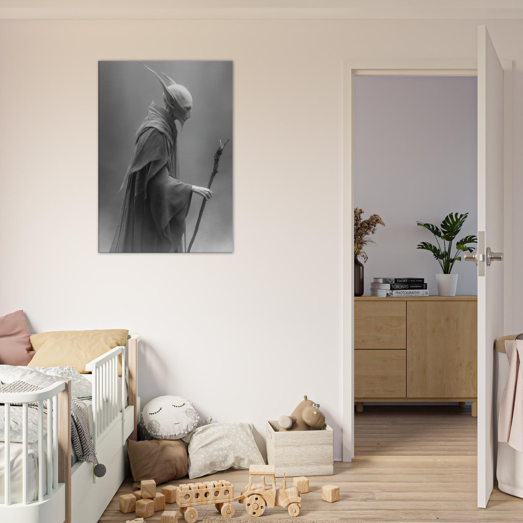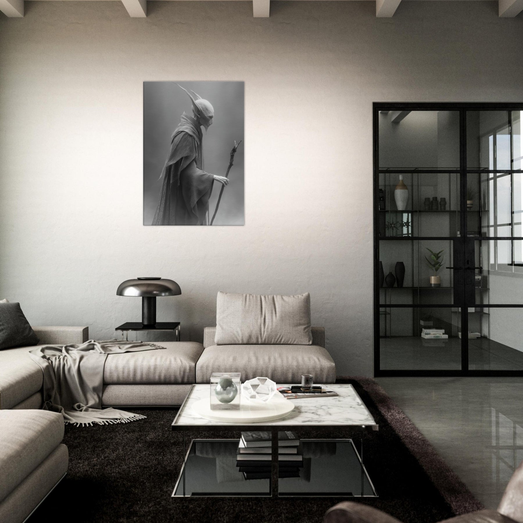 This black and white portrayal invites quiet contemplation, turning a wall into a doorway to myth. Hang it to conjure a dusky, dreamlike atmosphere perfect for a reading nook, meditation corner, or refined living room where every shadow feels intentional and calm.