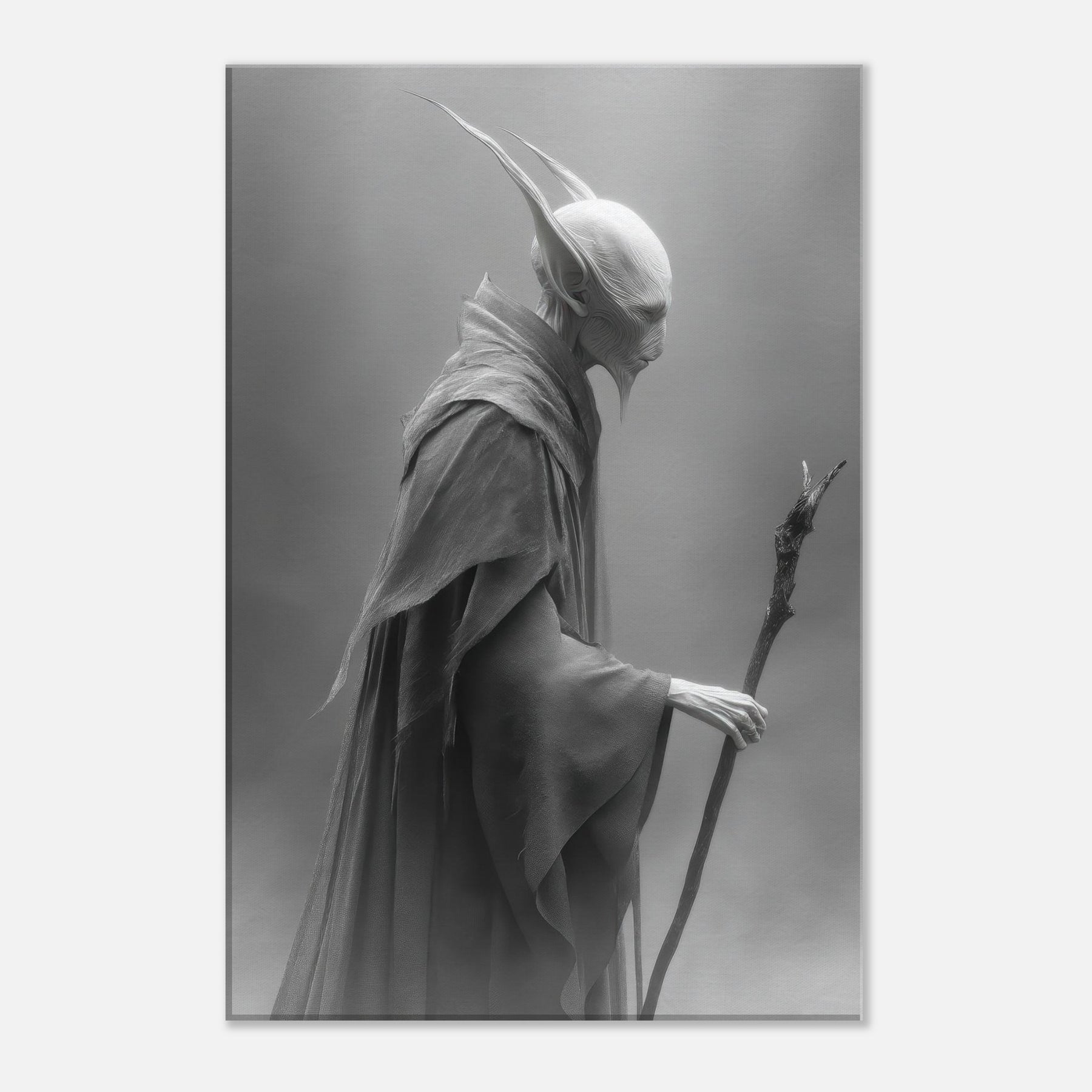 An arresting study in restraint and presence, it stands in a misty hush of grayscale. The sculpted lines sculpt the air, while the flowing cloak suggests wind and memory.