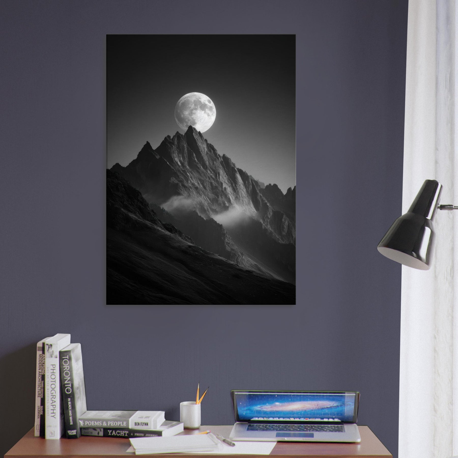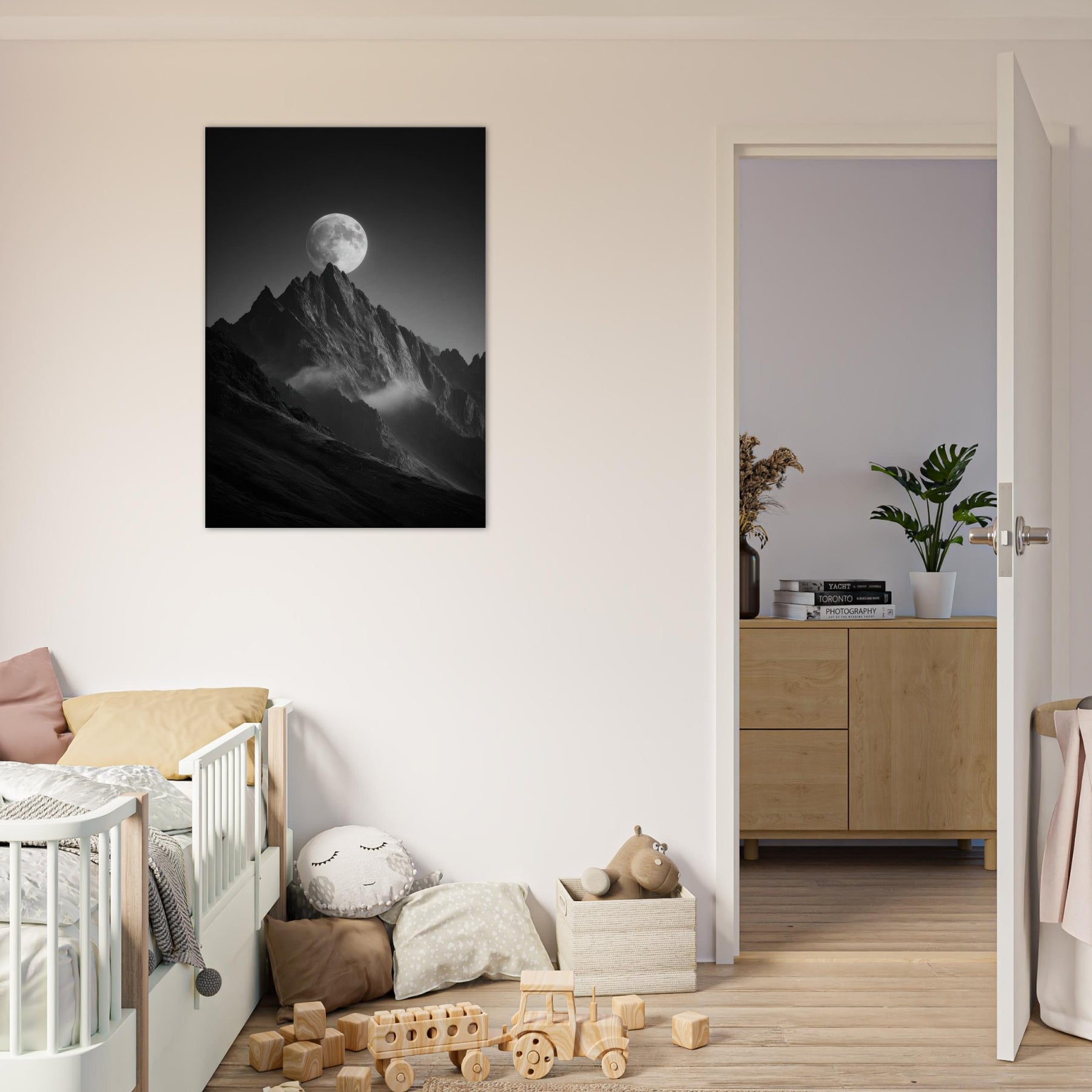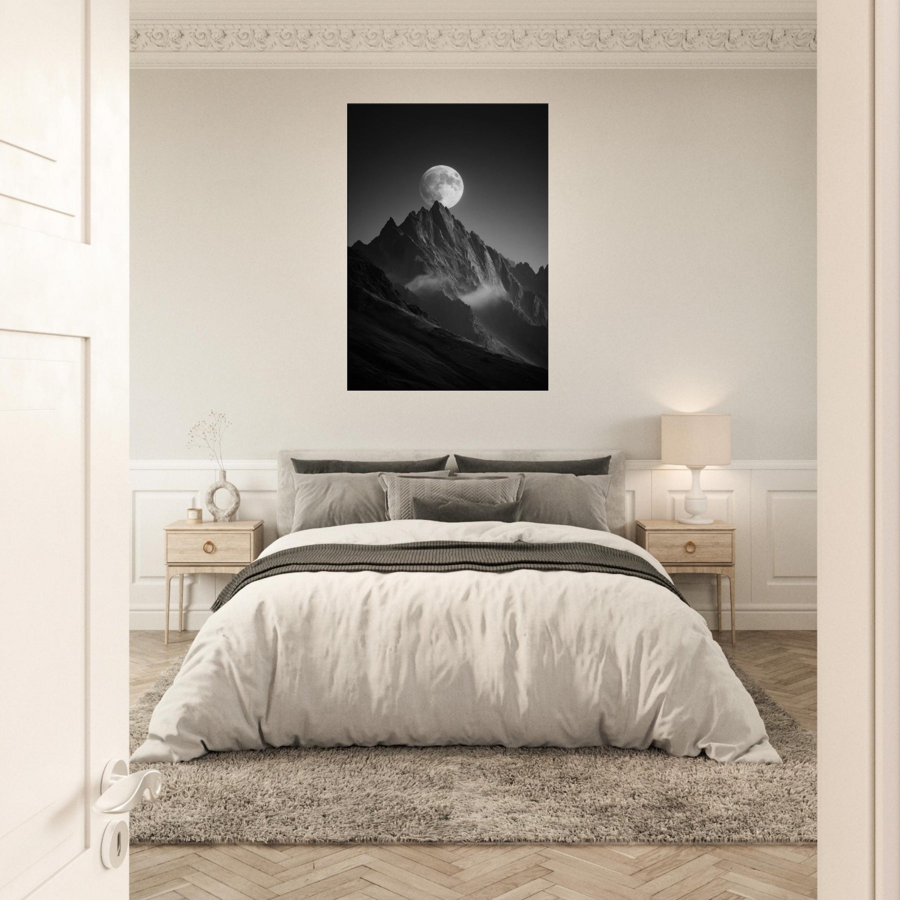 Unfolds in quiet grayscale, a nocturnal that invites contemplation. The luminous moon hovers above jagged peaks, casting a surreal, calming glow that steadies the room. In black and white, the scene breathes mystery and stillness, turning a wall into a window to the night.