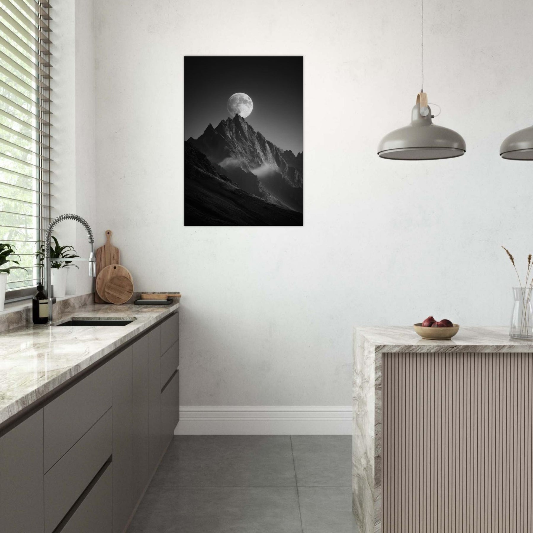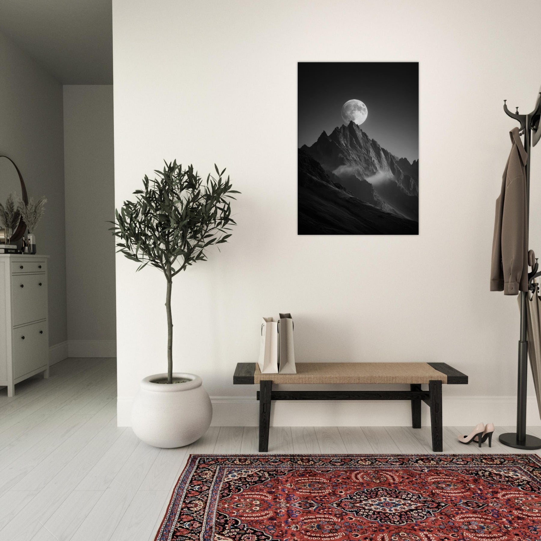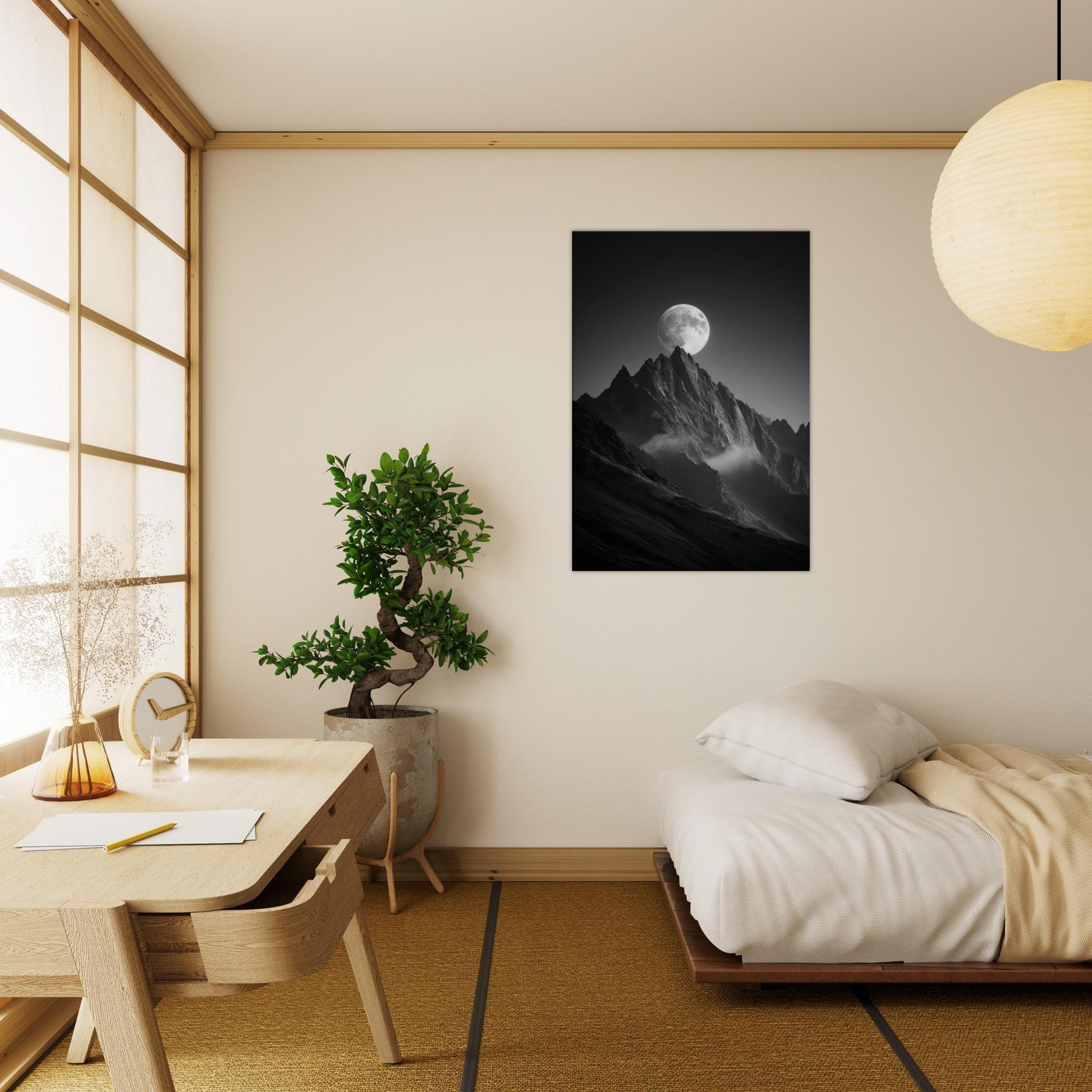 Unfolds in quiet grayscale, a nocturnal that invites contemplation. The luminous moon hovers above jagged peaks, casting a surreal, calming glow that steadies the room. In black and white, the scene breathes mystery and stillness, turning a wall into a window to the night.
