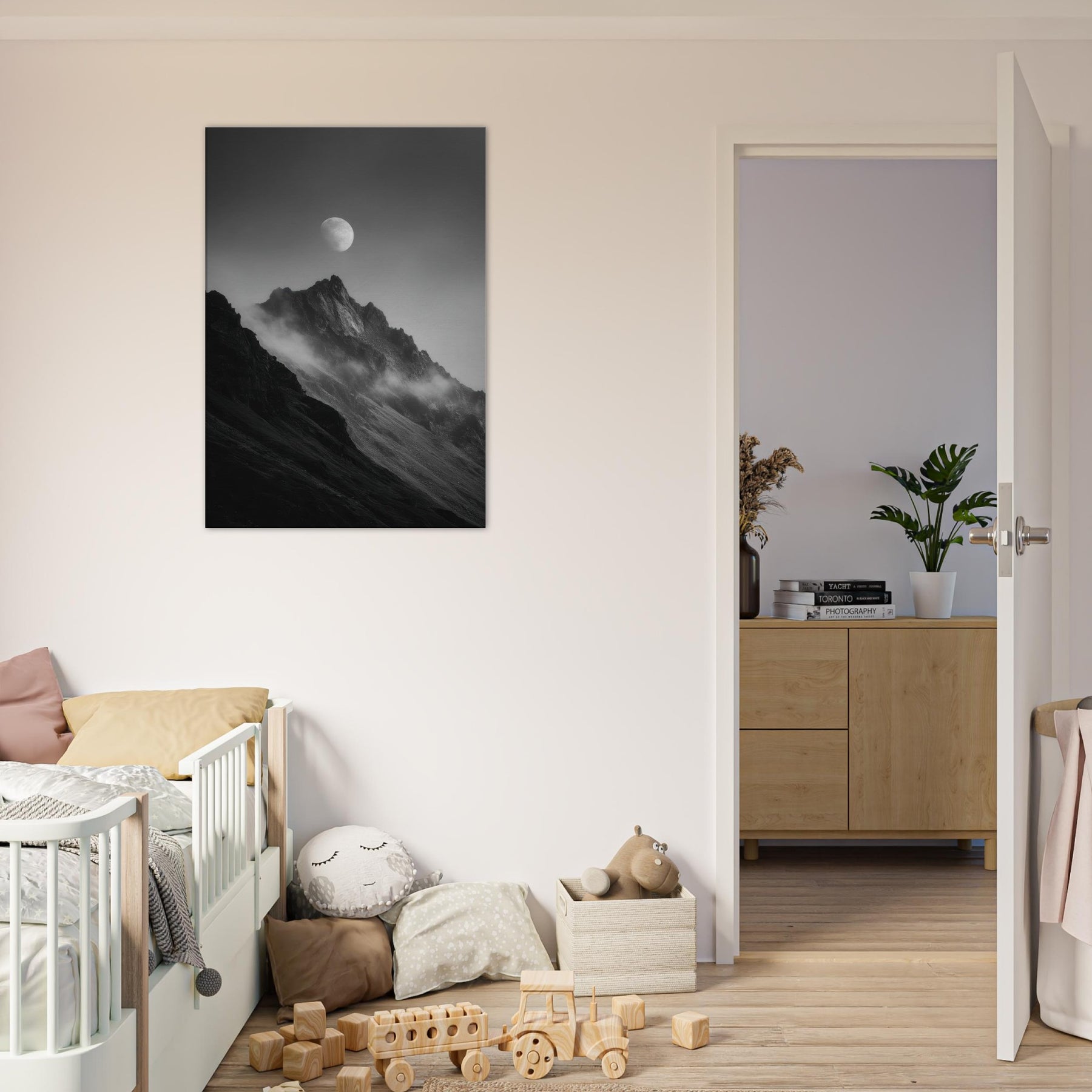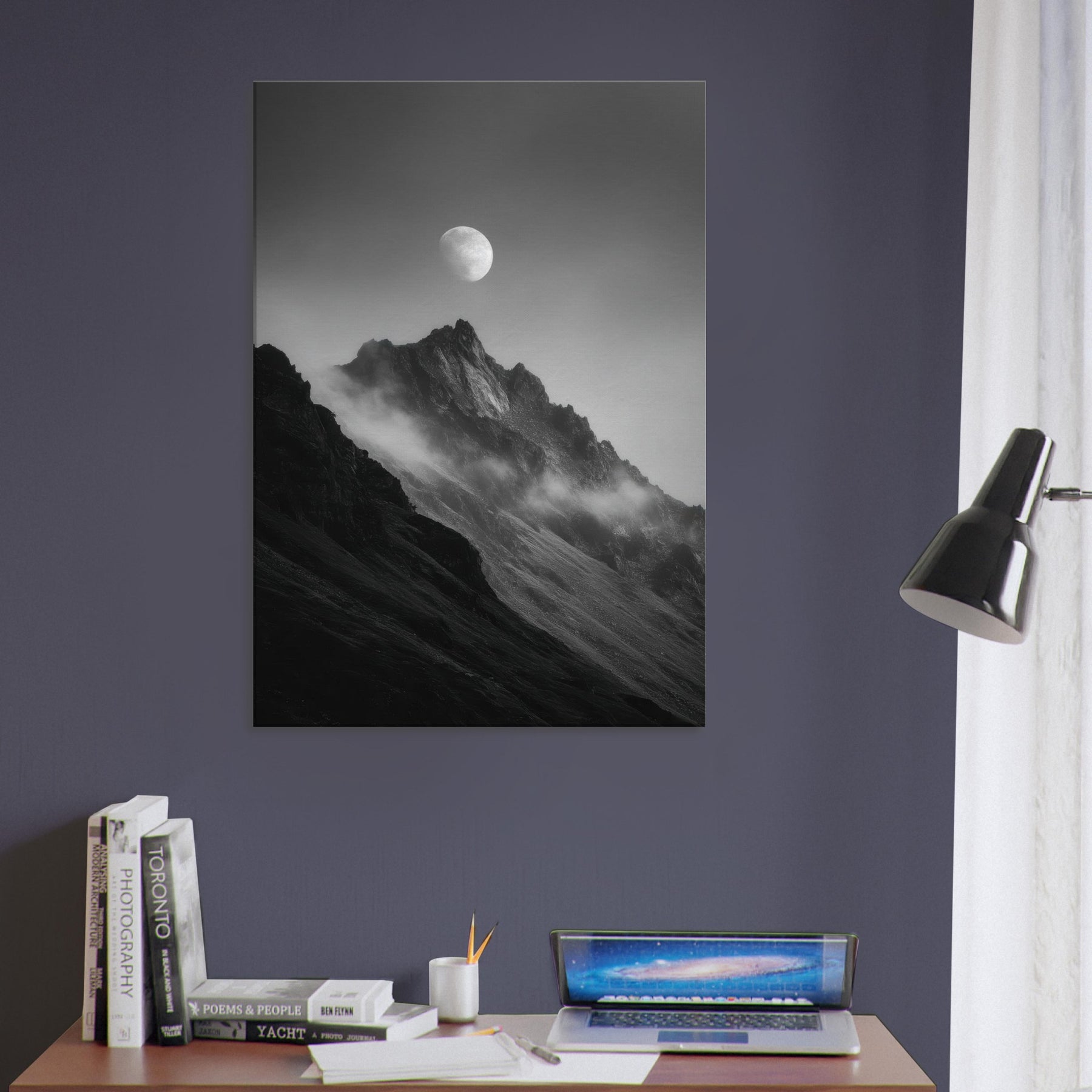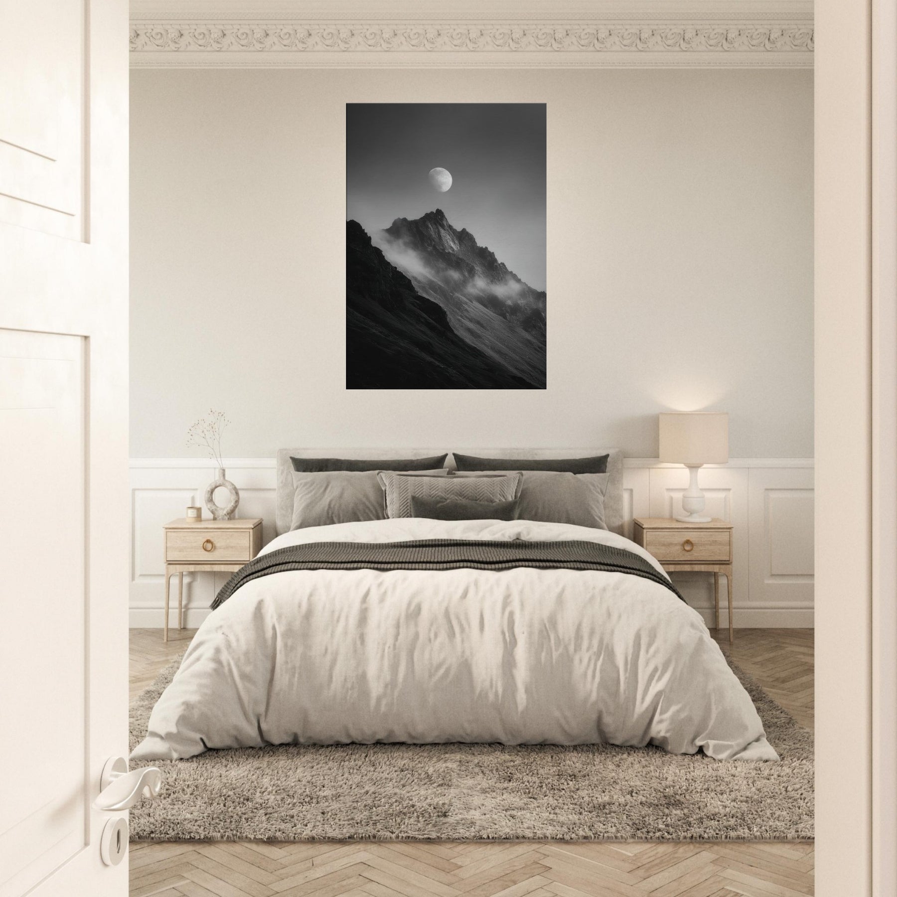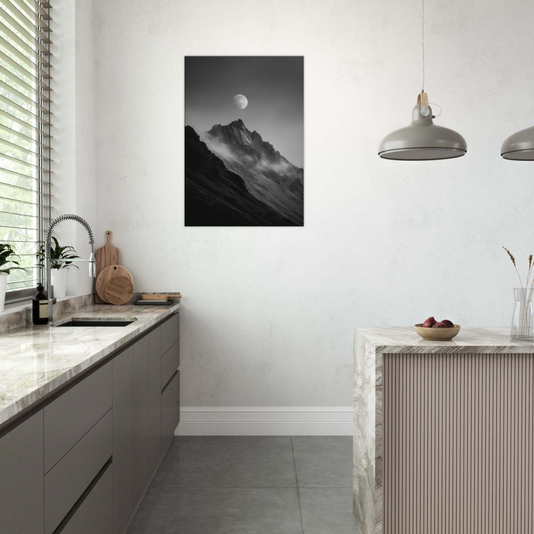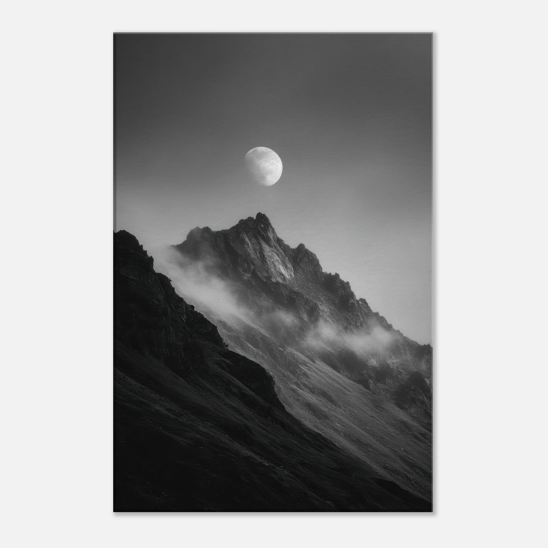 Moon Over Mountains unfolds in monochrome, a hushed dialogue between rock and sky. The moon hovers above jagged peaks, casting a quiet lantern over the slopes as mist slips along the ridges. This minimal composition invites contemplation, turning any wall into a window of stillness perfect for a living room, study, or hallway. Its black and white tones echo candlelight and snowfall, enhancing textures and shadows, while the serene motif wins you a calm, mystical focal point that breathes air and atmosphere into your space. The central subject is Moon Over Mountains (Minimal).