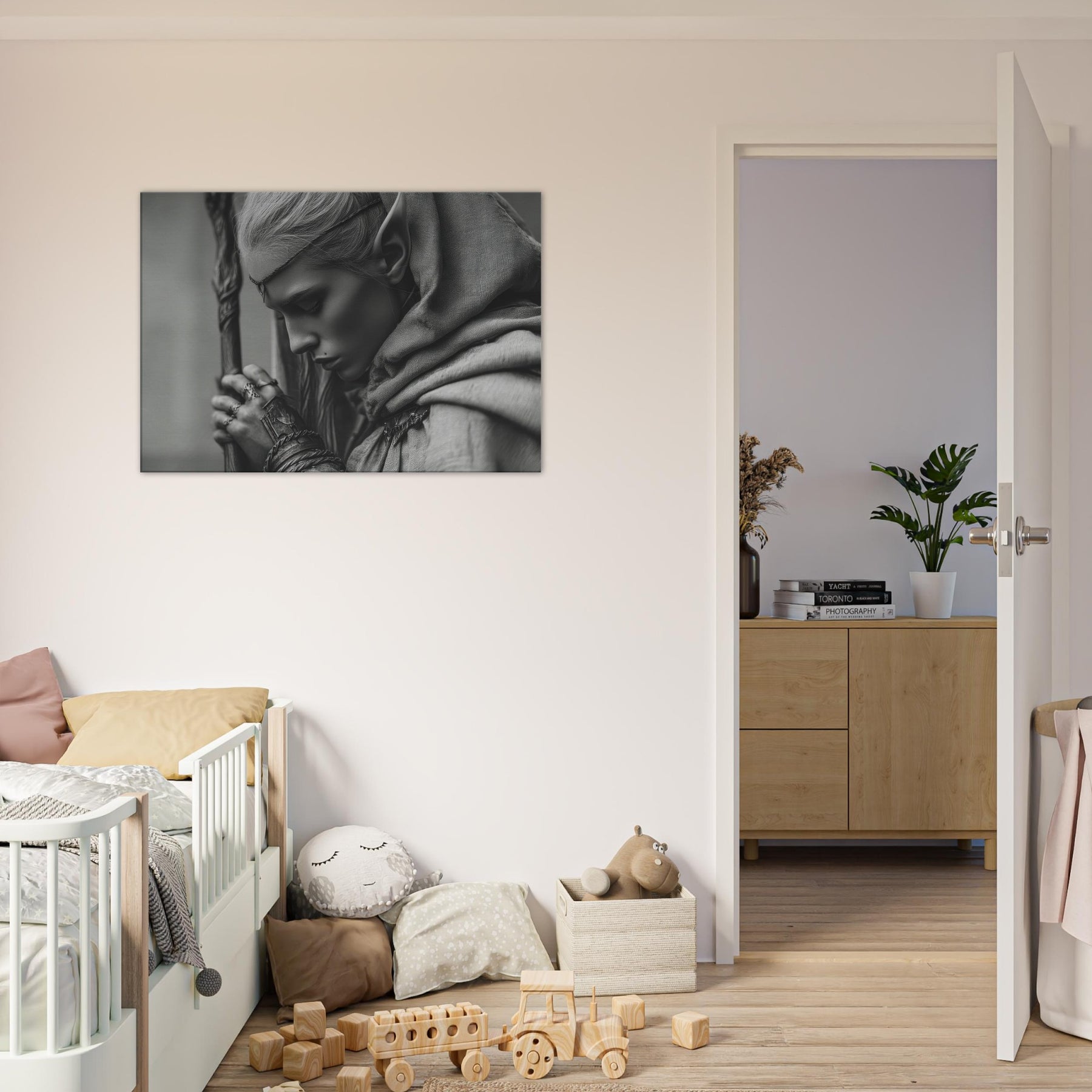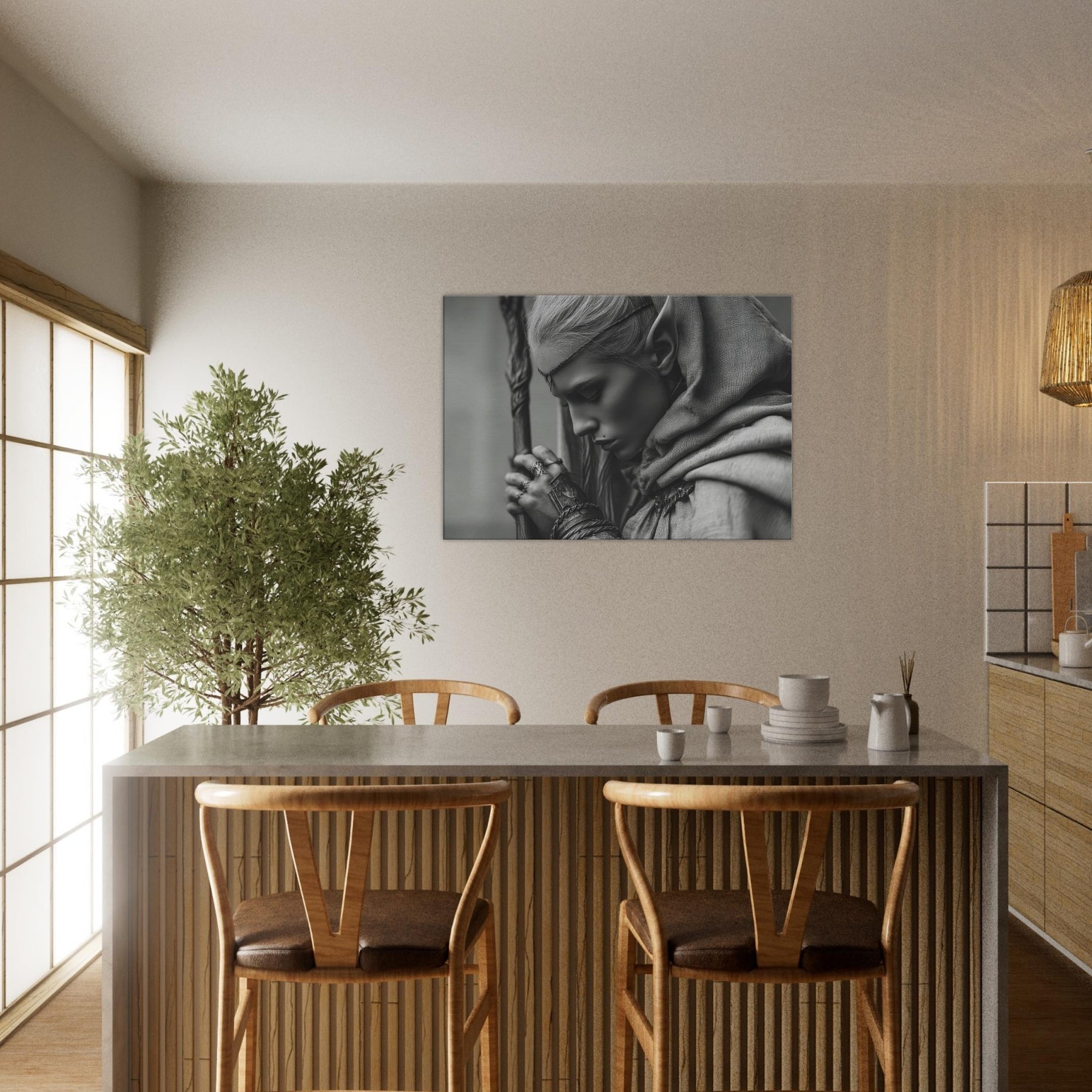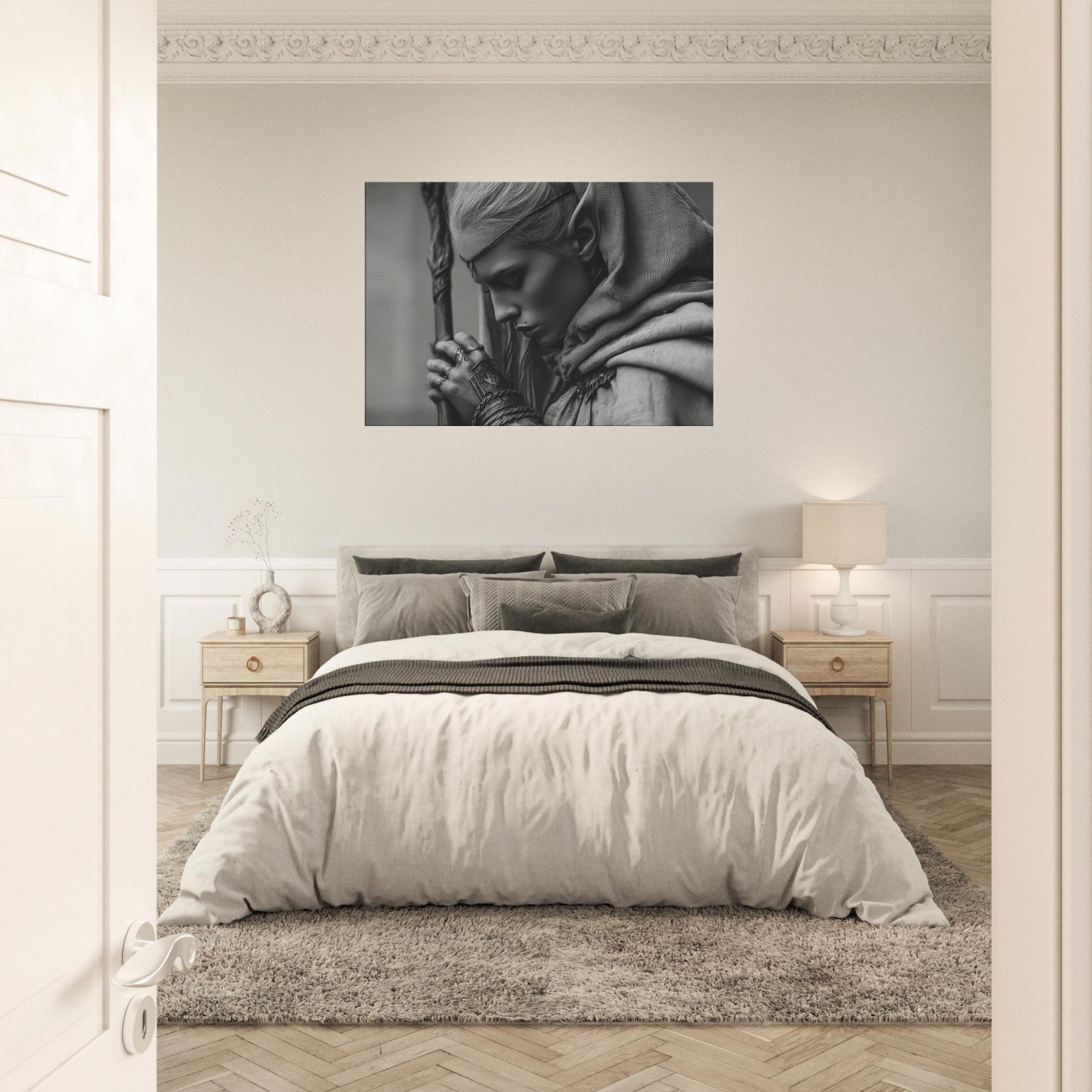 Immerse your space in a quiet, moonlit tension with this artwork in monochrome, where shadow and light trace every contour. The minimalist lines invite stillness, while the subtle textures evoke ancient forests and whispered runes.
