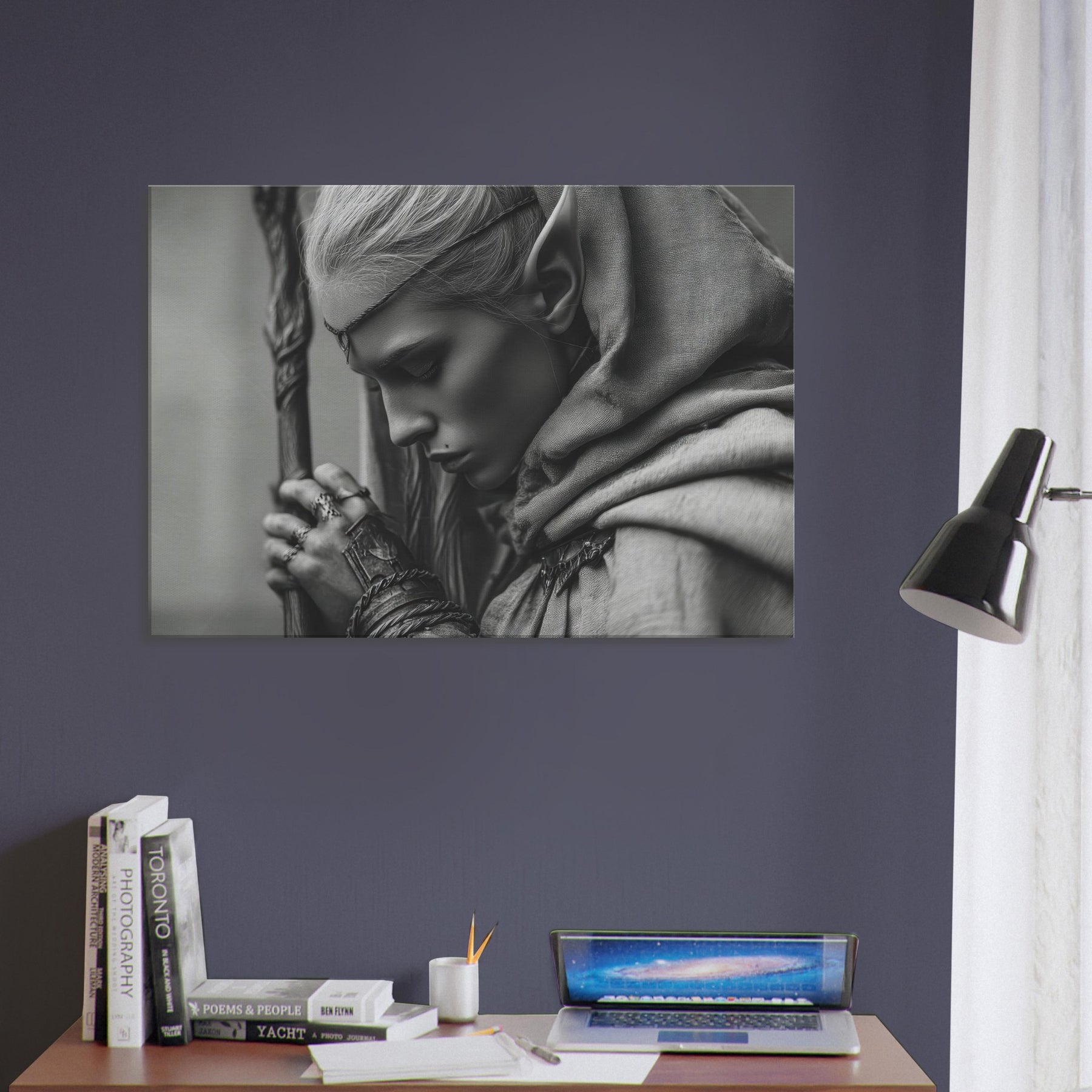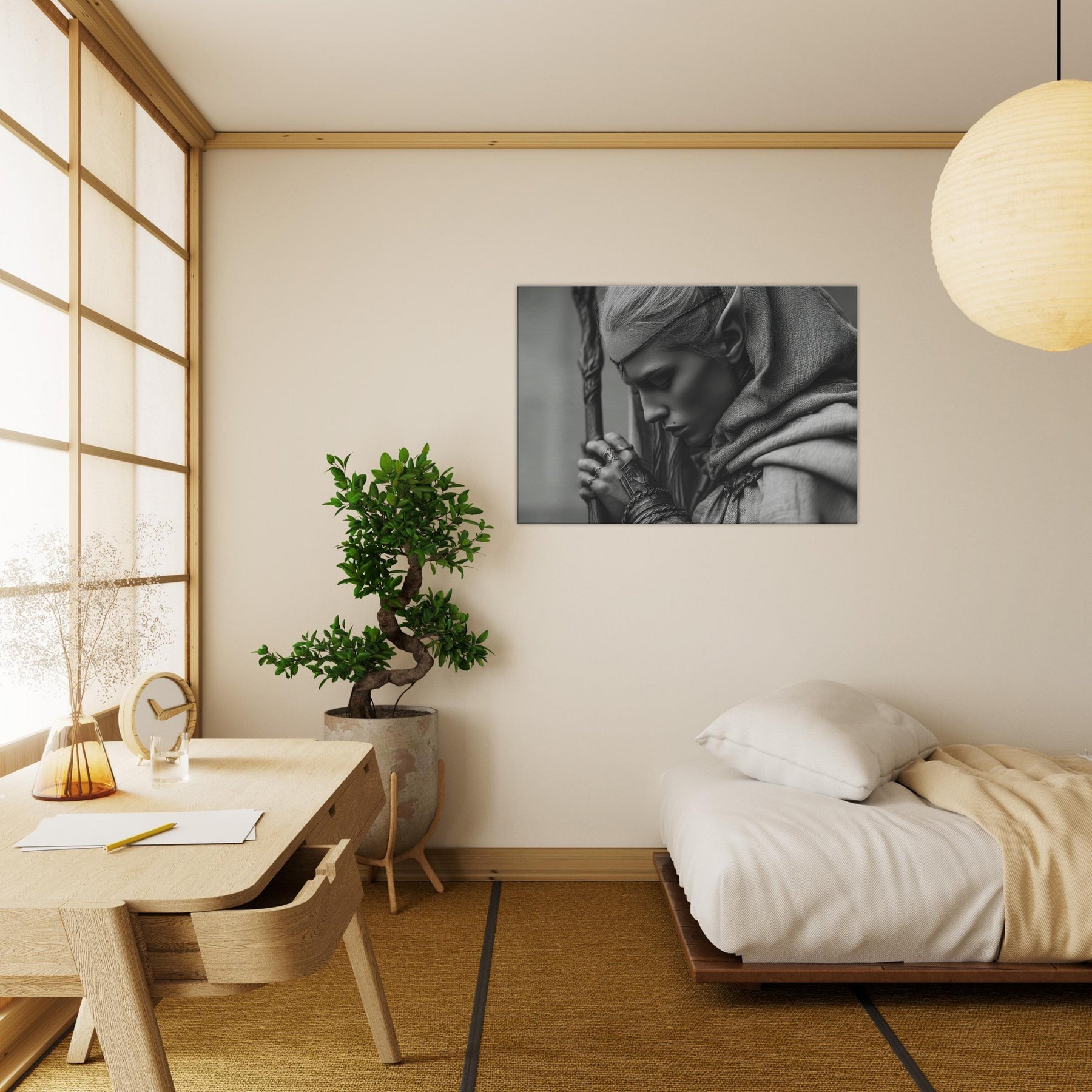 Framed in clean simplicity, the artwork becomes a contemplative focal point perfect for a living room corner, a bedside niche, or a study wall. Its ethereal presence softens hard surfaces and invites slow, mindful moments amid everyday glow.