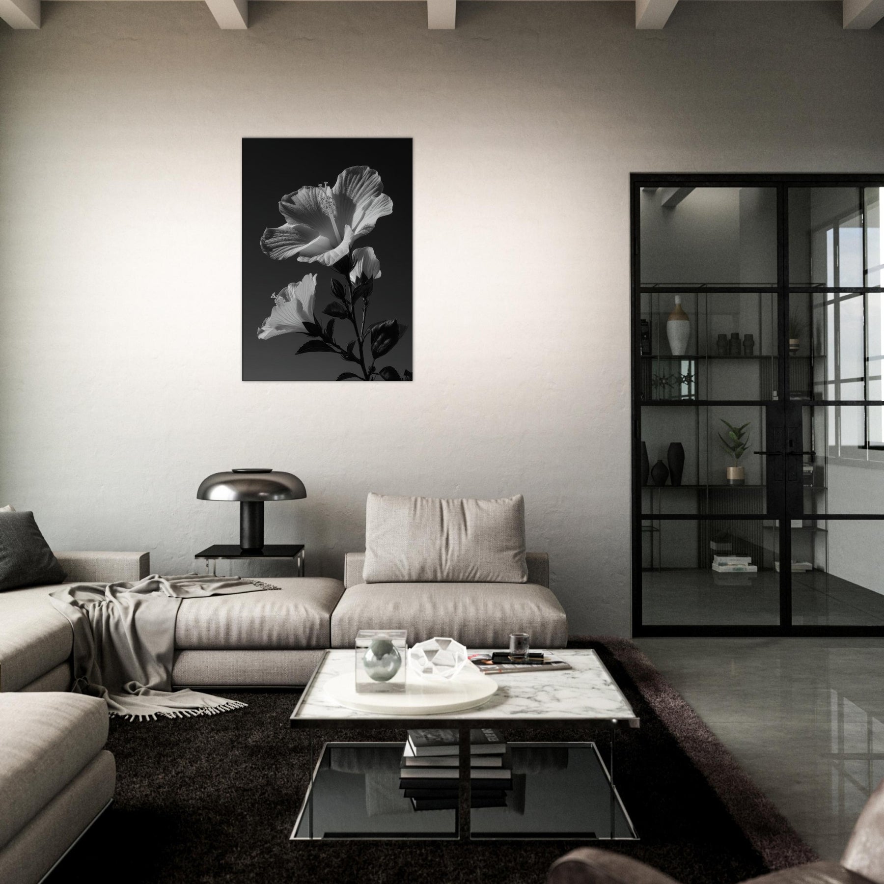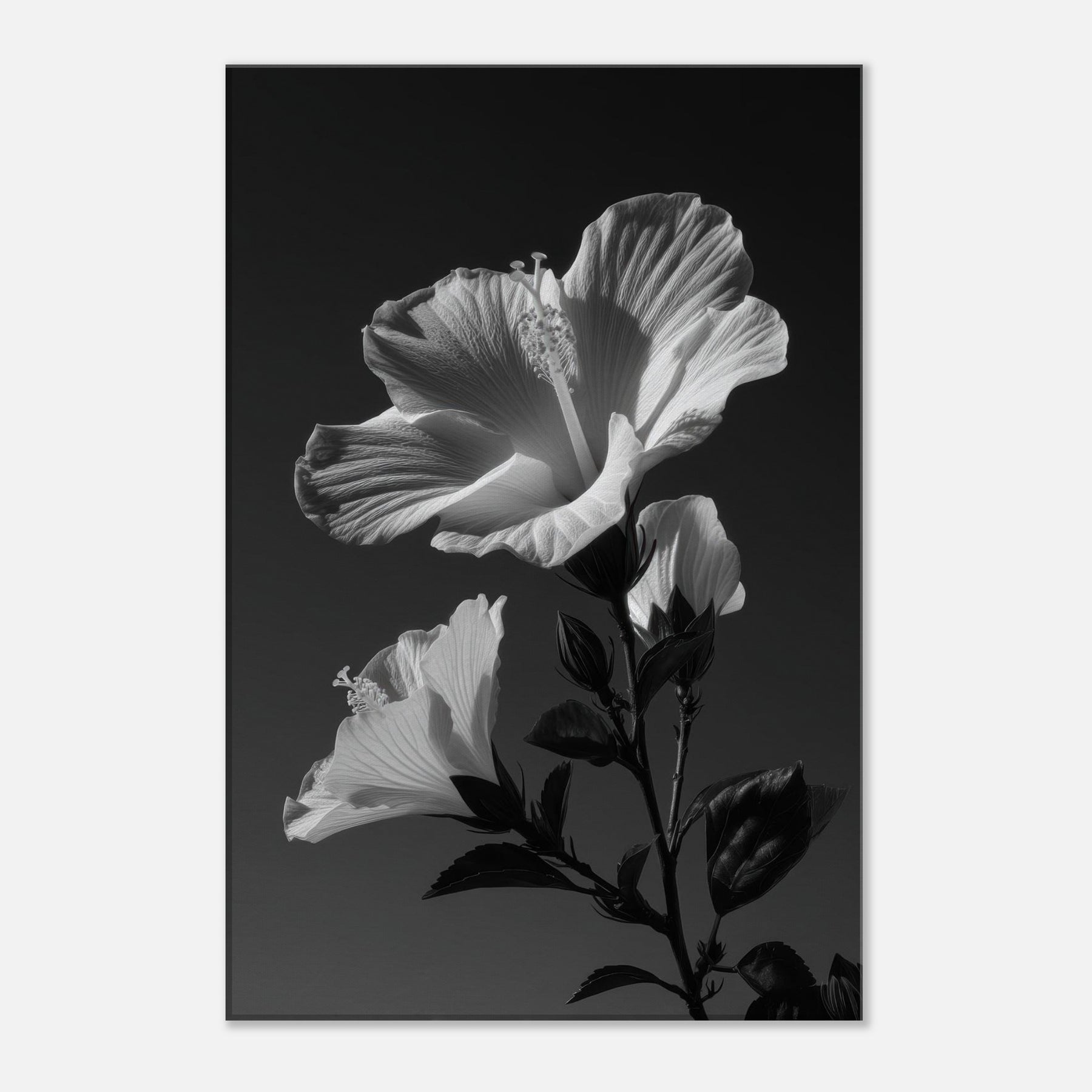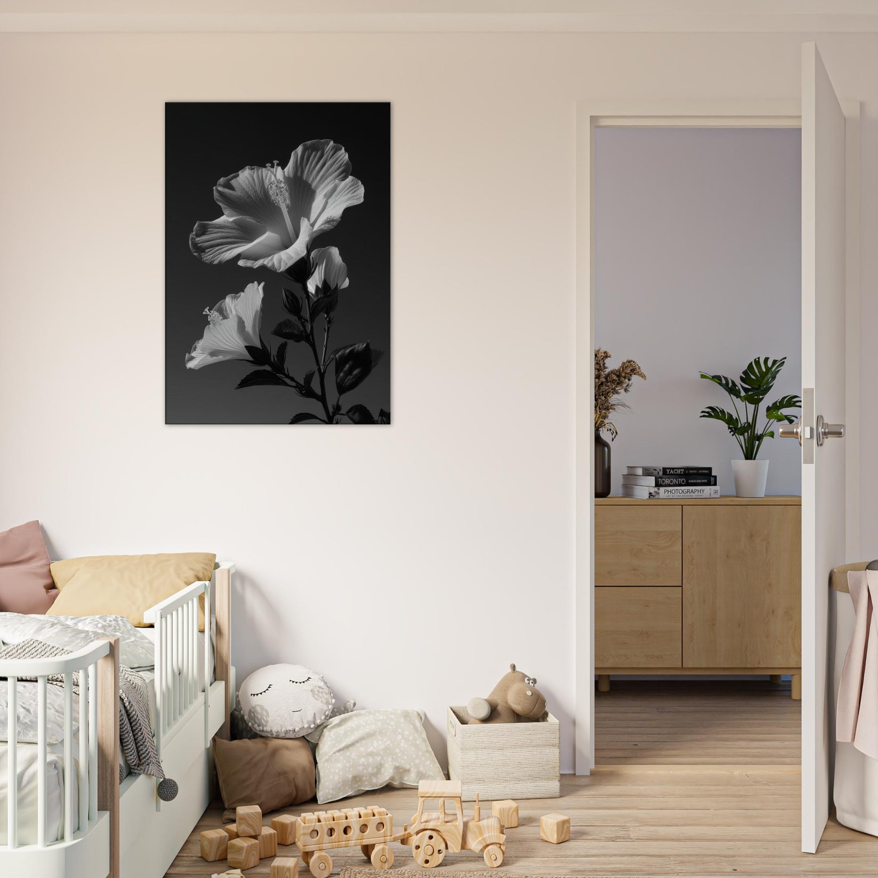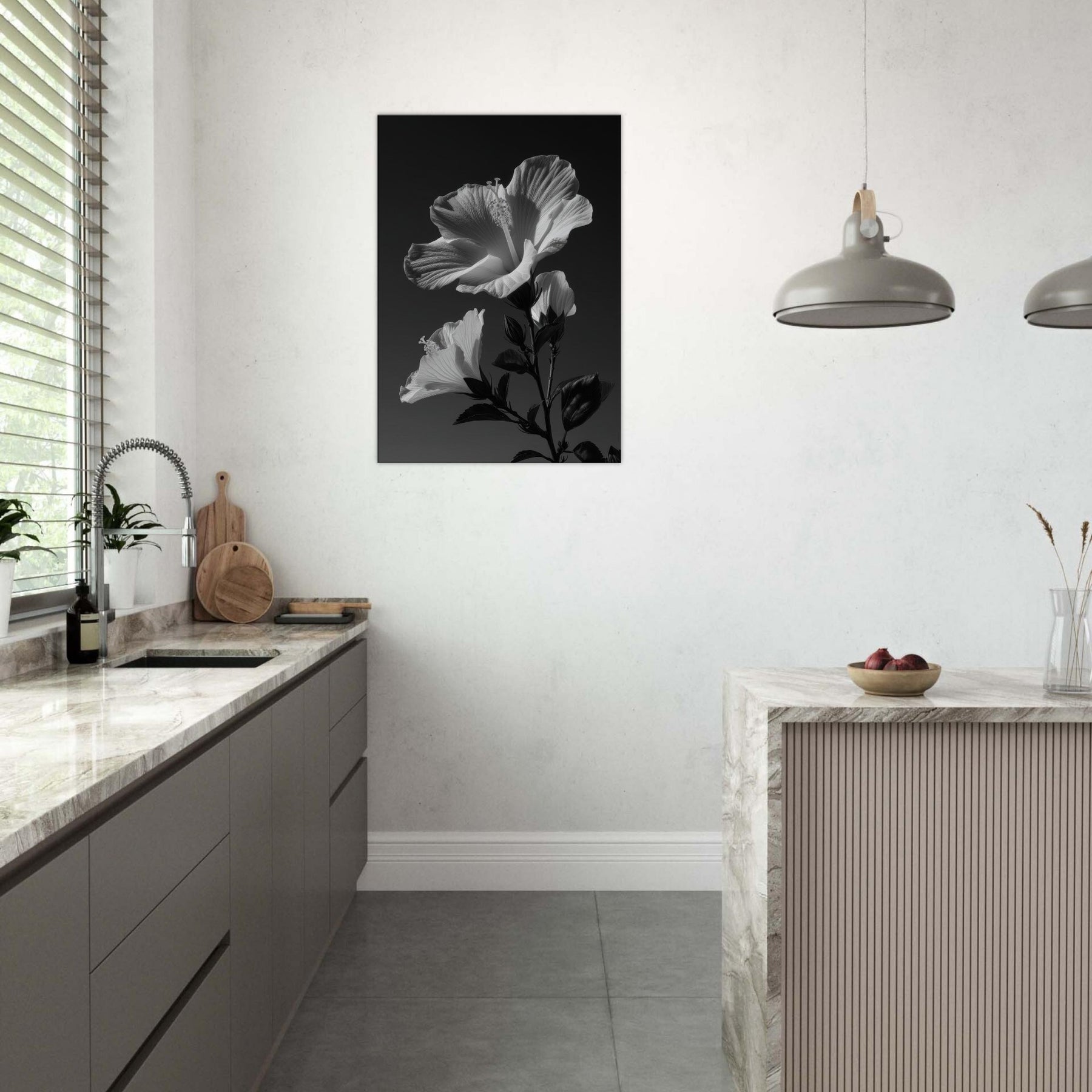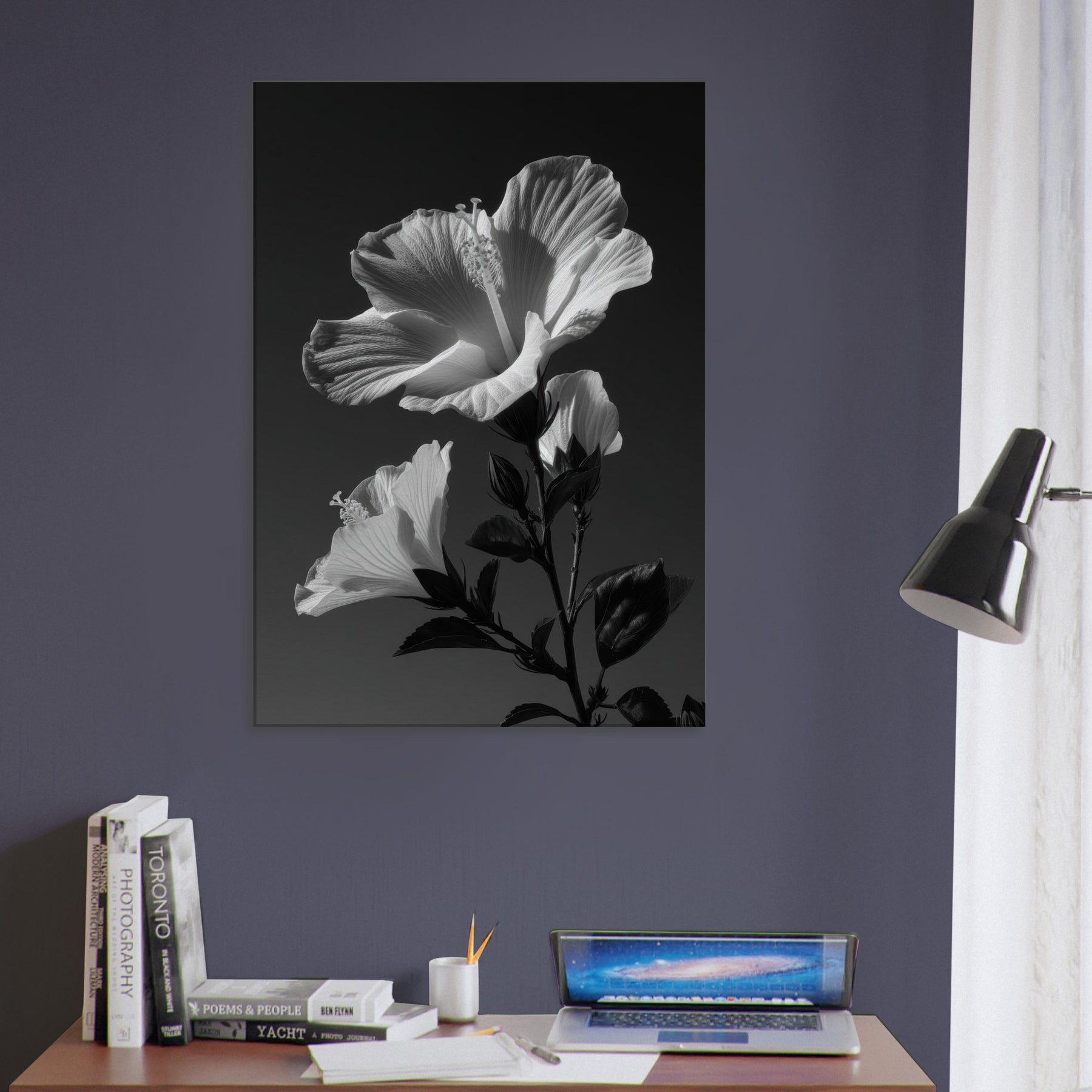 An arresting study of the Hibiscus in stark black and white, this wall art captures the flower's curving petals and quiet poise. The contrast between luminous whites and ink dark stems lends a calm, nocturnal glow to any room, inviting a moment of stillness amid daily activity. Hang it in a living room, hallway, or bedroom to lend botanical grace and a contemporary, gallery like atmosphere that elevates light, shadow, and texture.