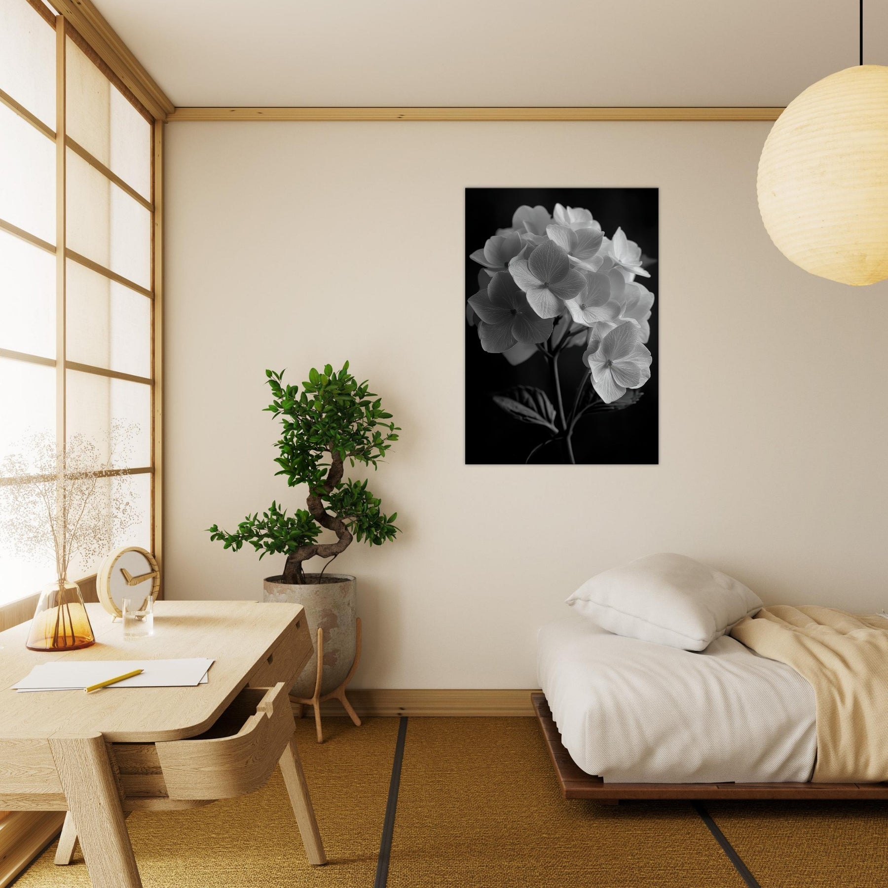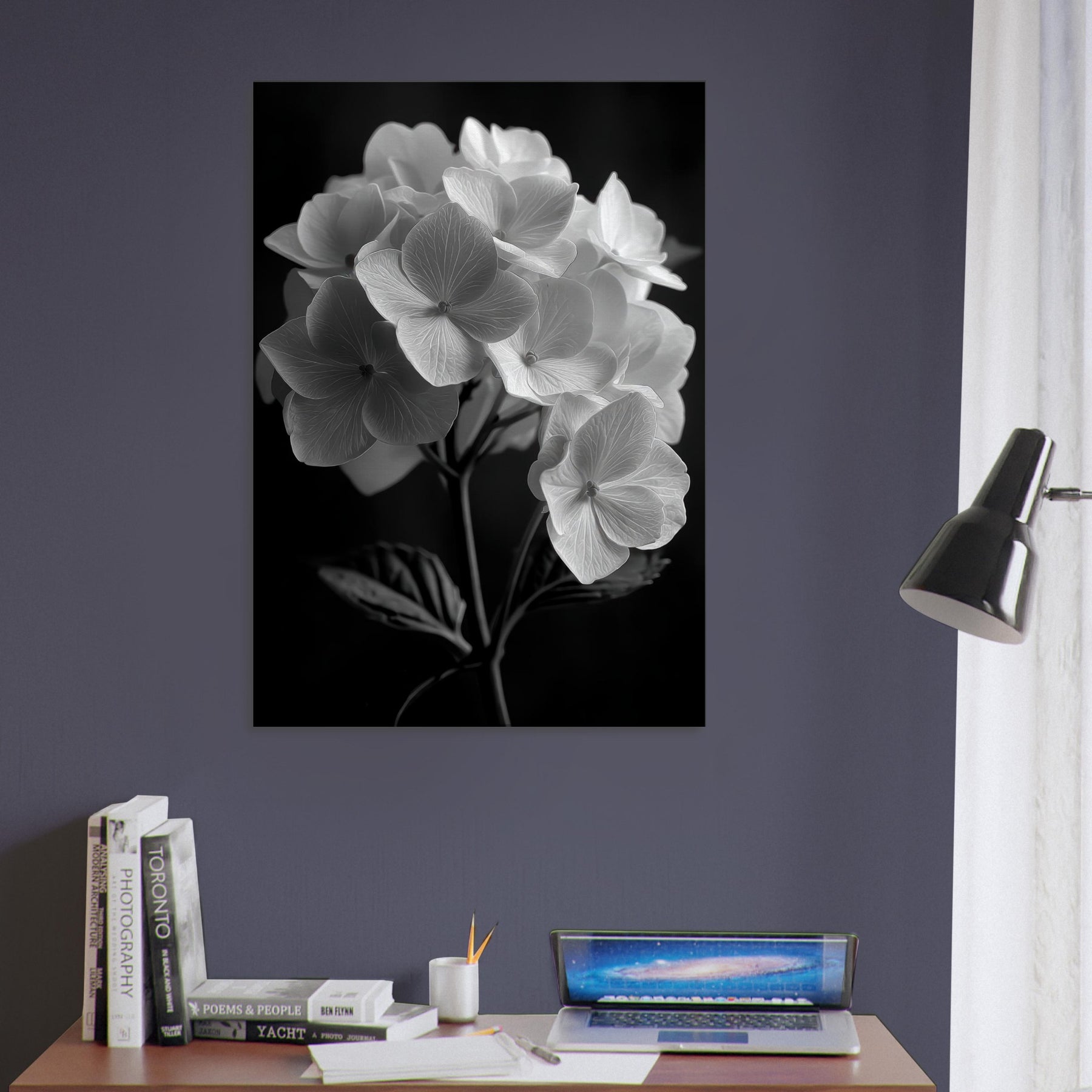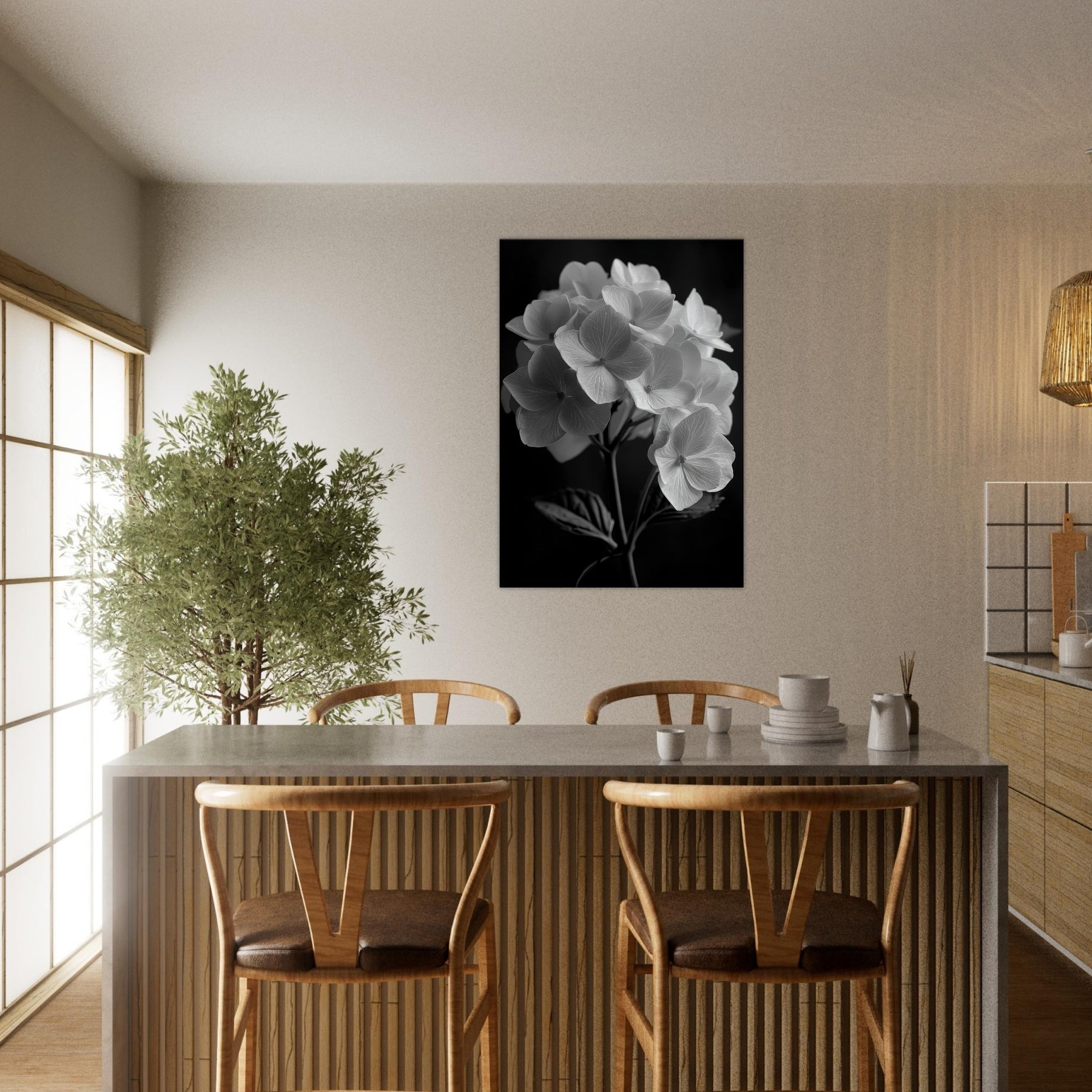 Like a quiet conversation between light and shadow, this Hydrangea study renders every petal in lyrical grayscale. The primary subject blooms against a velvet backdrop, inviting a calm, almost meditative atmosphere into any living space. Its subtle contrast and delicate veining lend a sculptural quality that enhances a sofa corner or a dining wall with timeless grace. Natural yet refined, this piece pairs beautifully with minimalist palettes, soft textures, and quiet evenings, turning ordinary rooms into serene retreats.