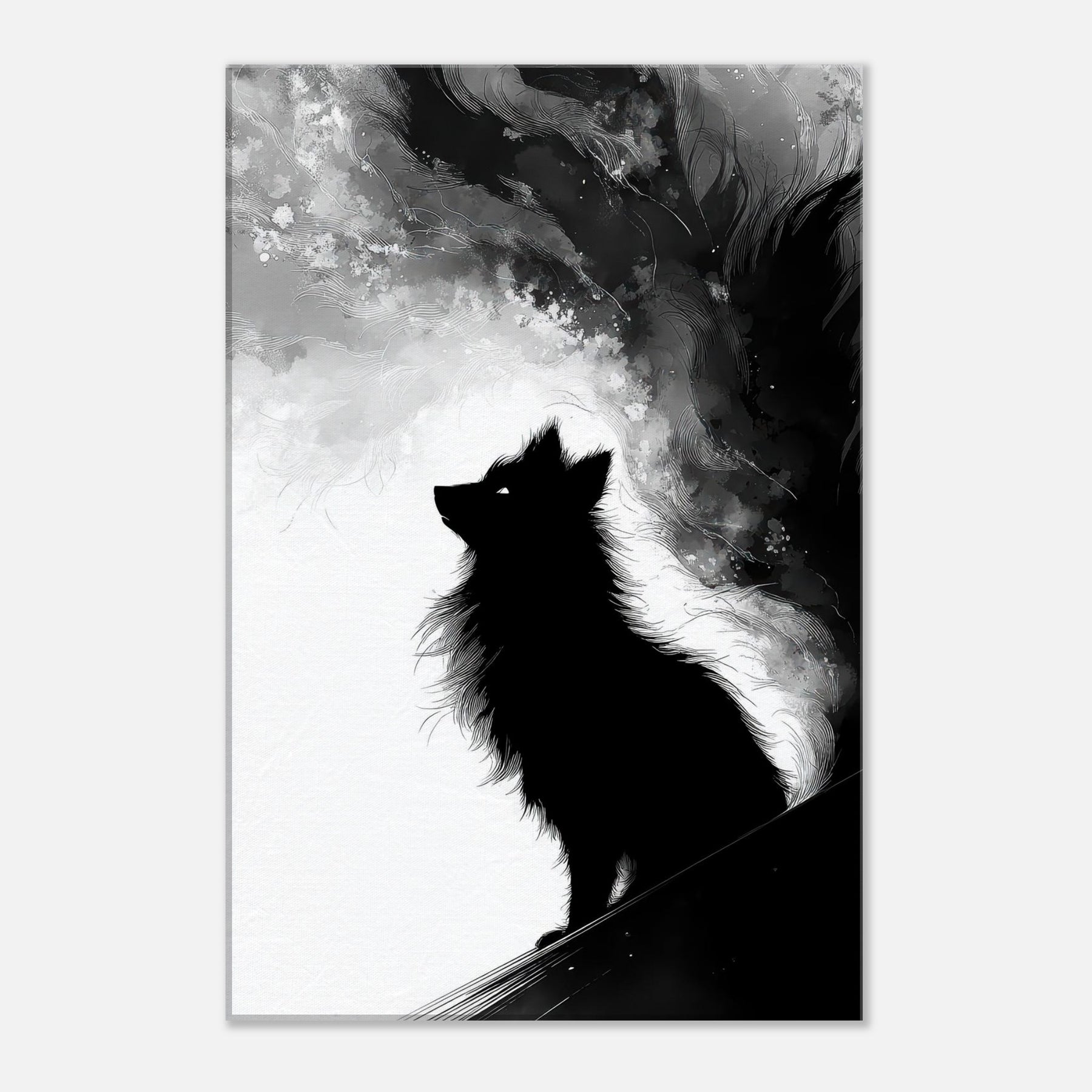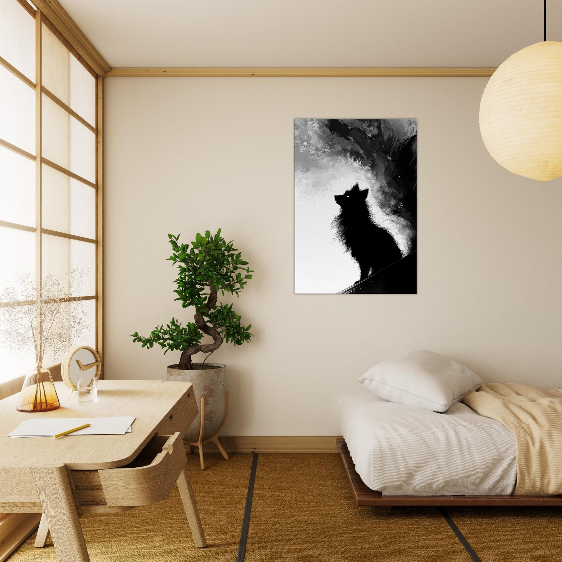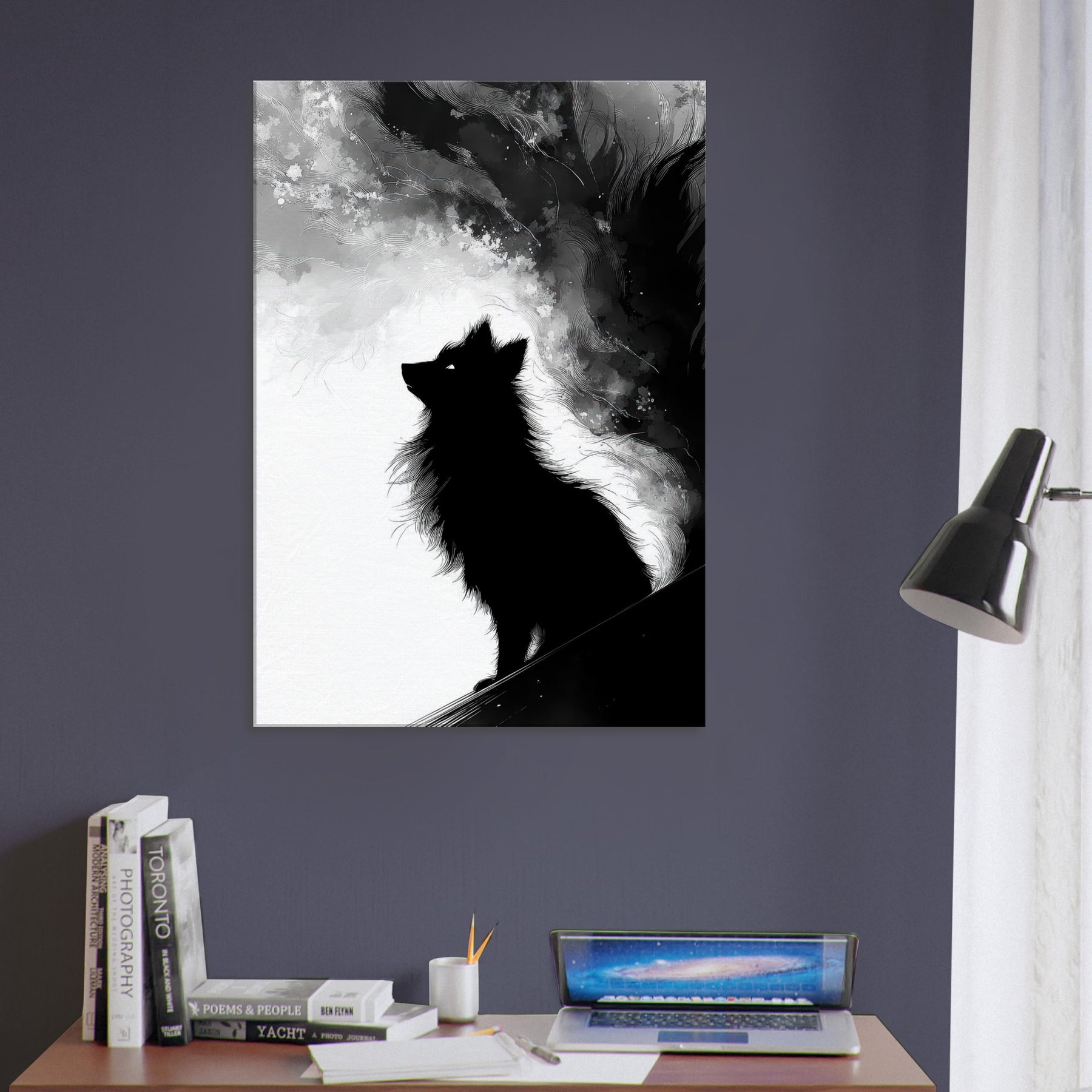 Let your walls reveal a whisper of myth with this black and white Kitsune silhouette, where fur and cloud like swirls blend into haunting negative space.