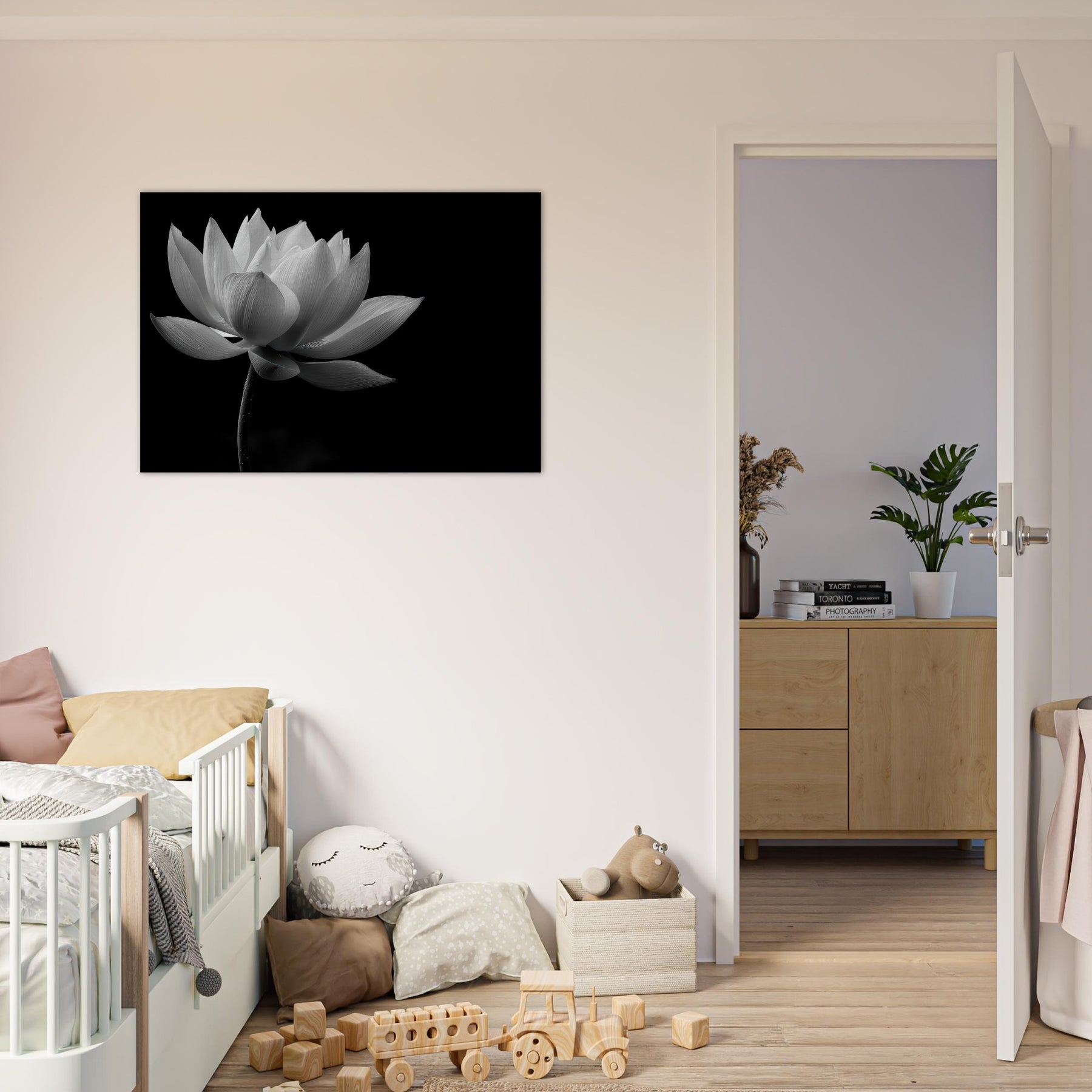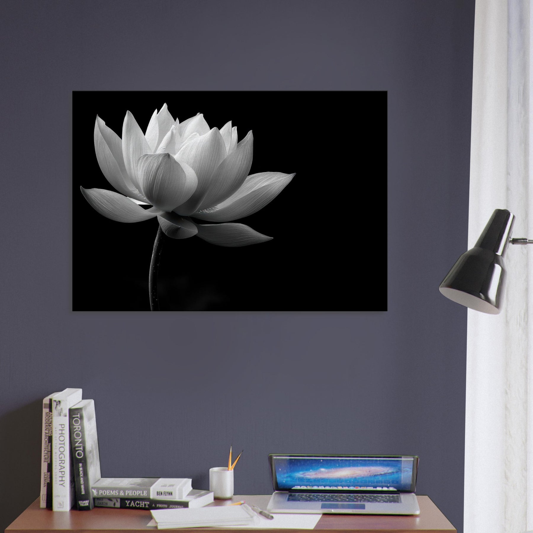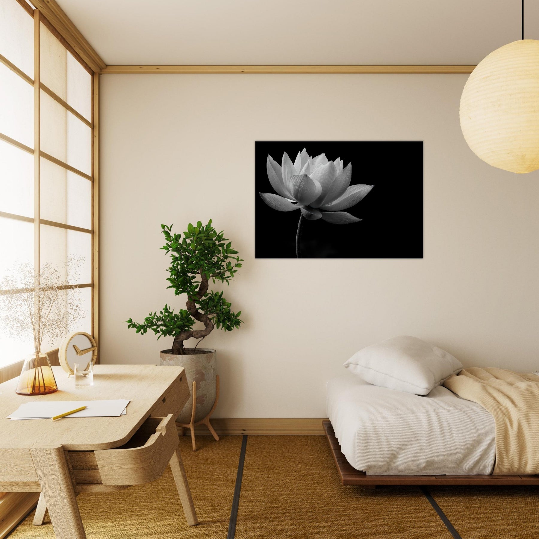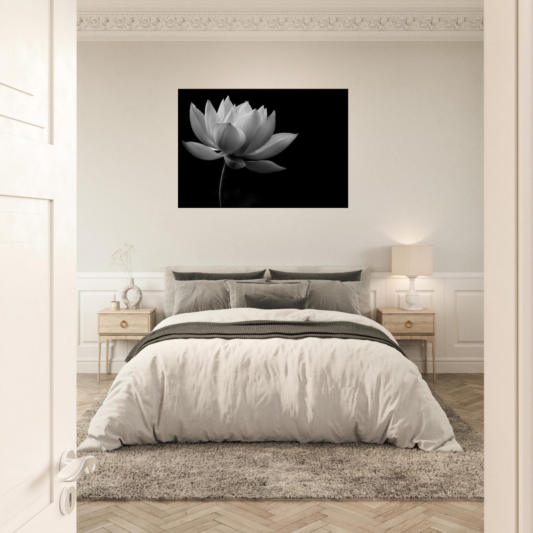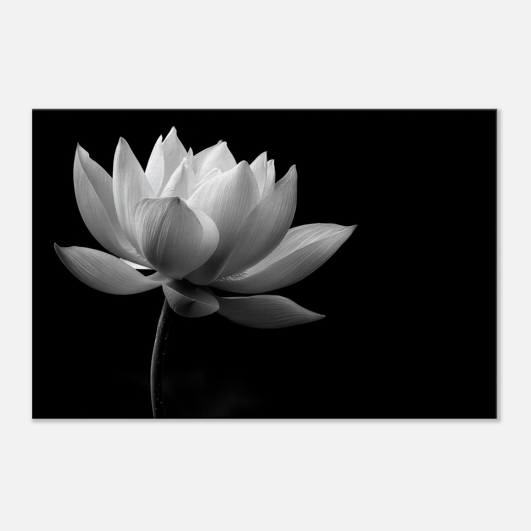 This black and white lotus photograph invites quiet reflection, turning a room into a sanctuary of balance and grace. The Lotus unfurls with cinematic clarity, its petals brushed by light that feels almost tactile, while deep shadows anchor the scene in timeless stillness.