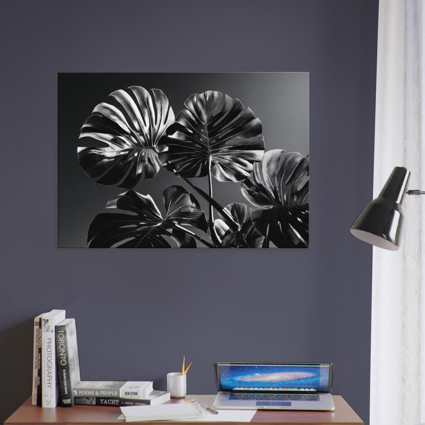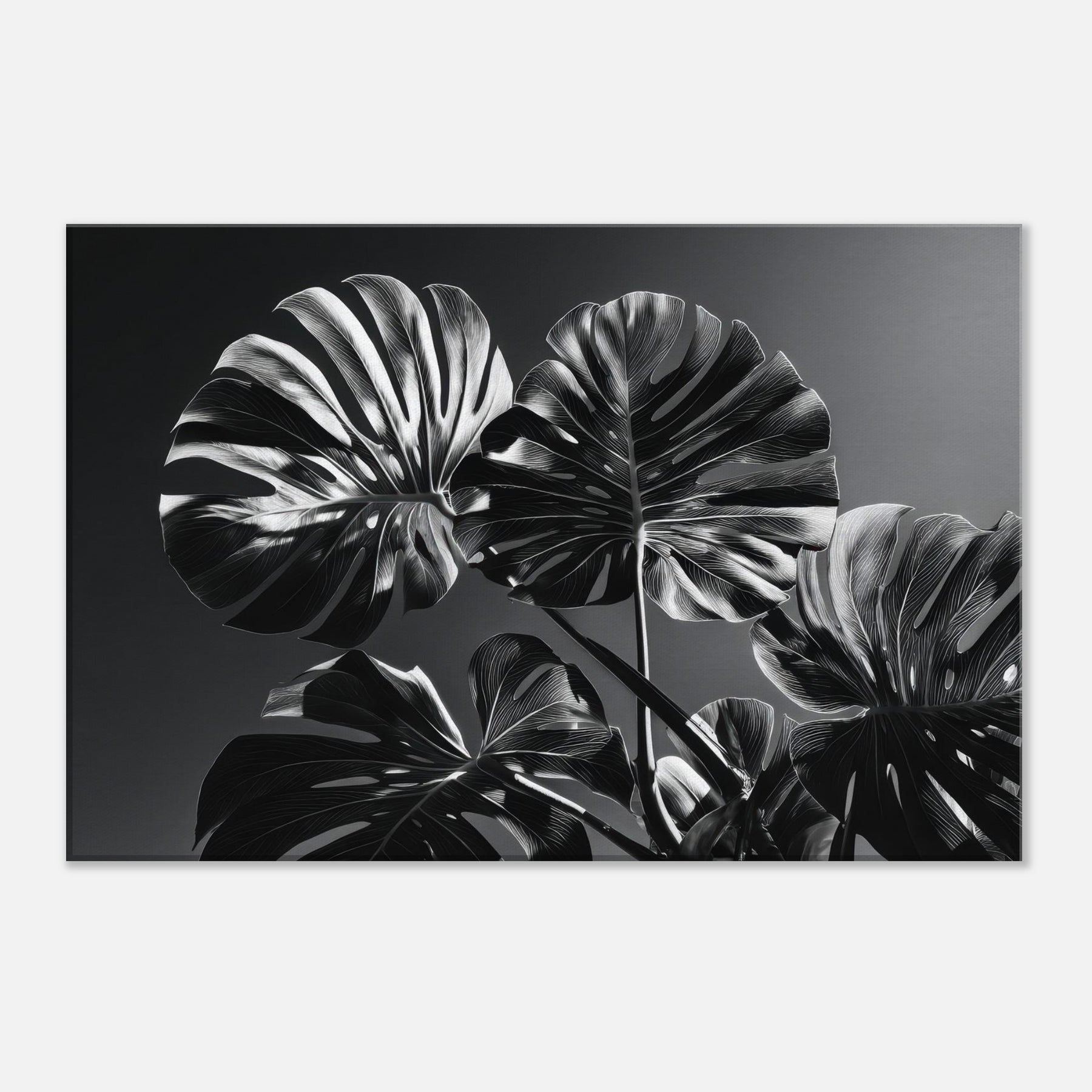 Monstera unfurls in a quiet, architectural sweep of light and shadow. This black and white study distills nature into sculpted curves and crisp veins, inviting stillness and focus.