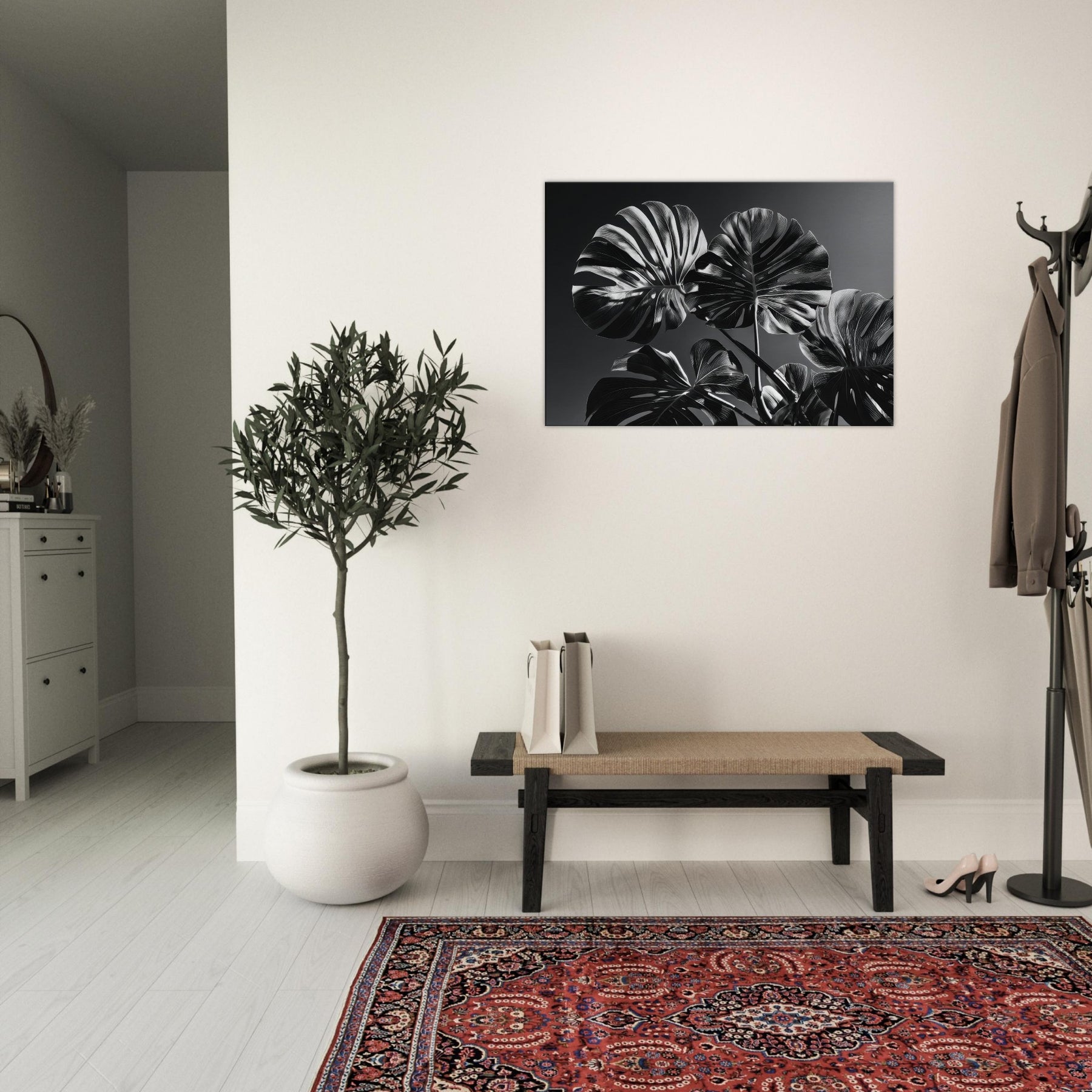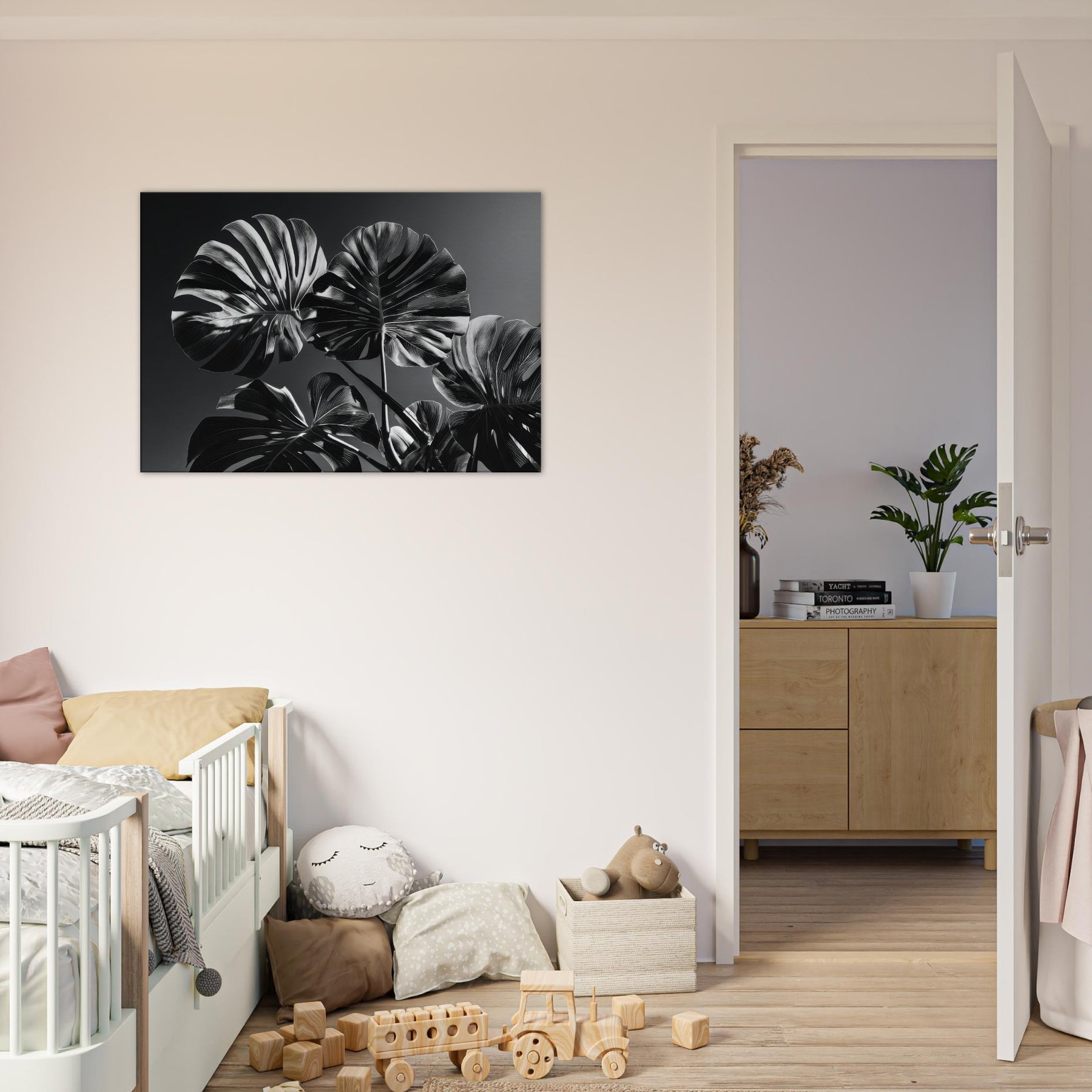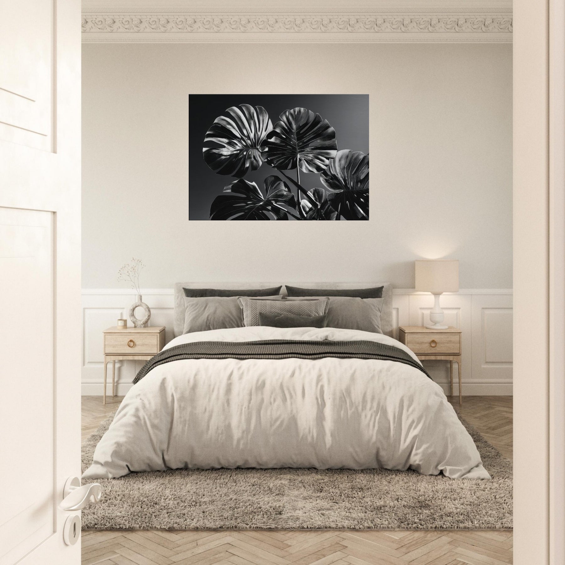 Hang it where daylight meets charcoal shadows to transform a living room into a gallery of calm, where Monstera radiates modern elegance. The piece breathes texture and depth, echoing organic warmth while maintaining a refined, minimalist mood. It pairs with neutral palettes, enriching walls with timeless, nature inspired drama.