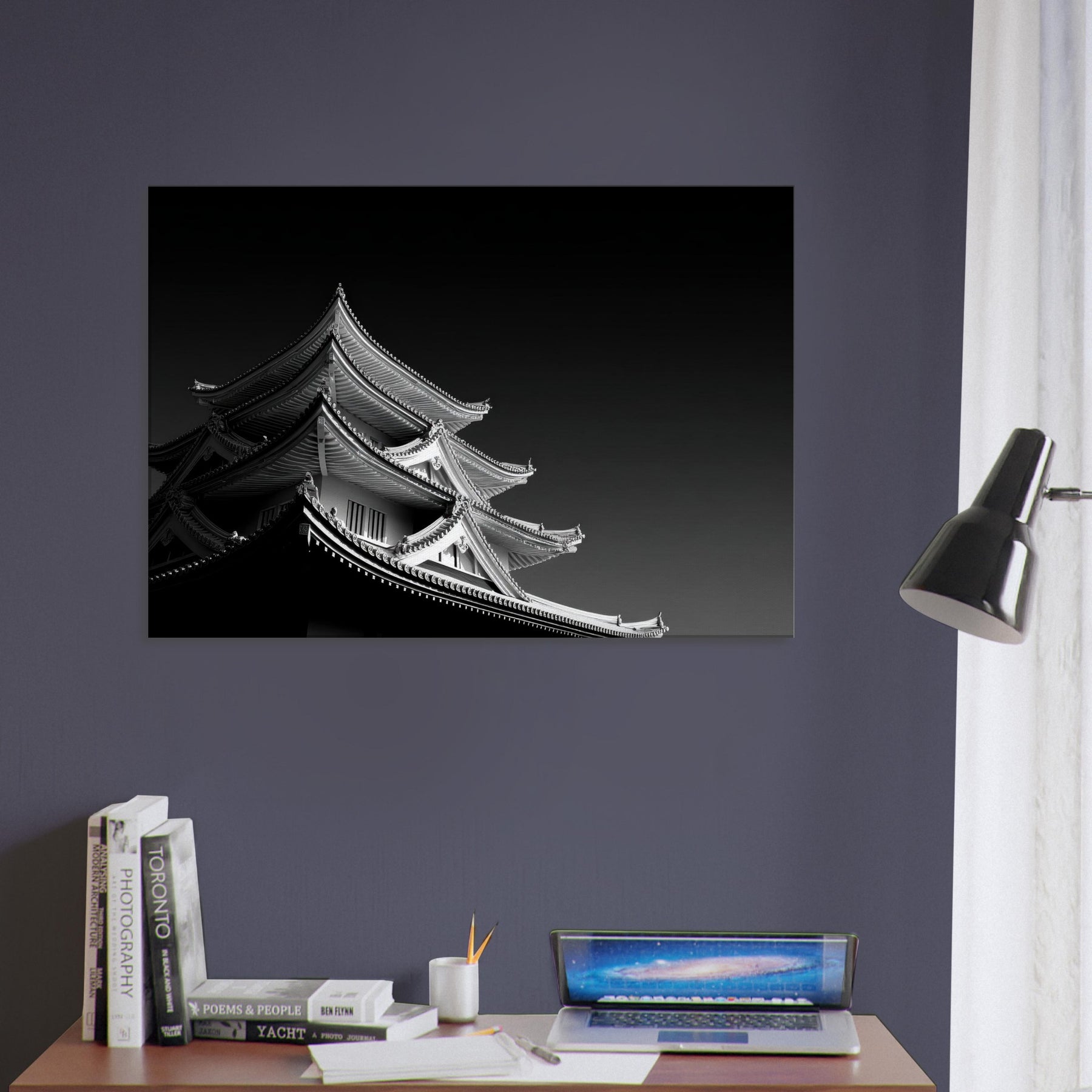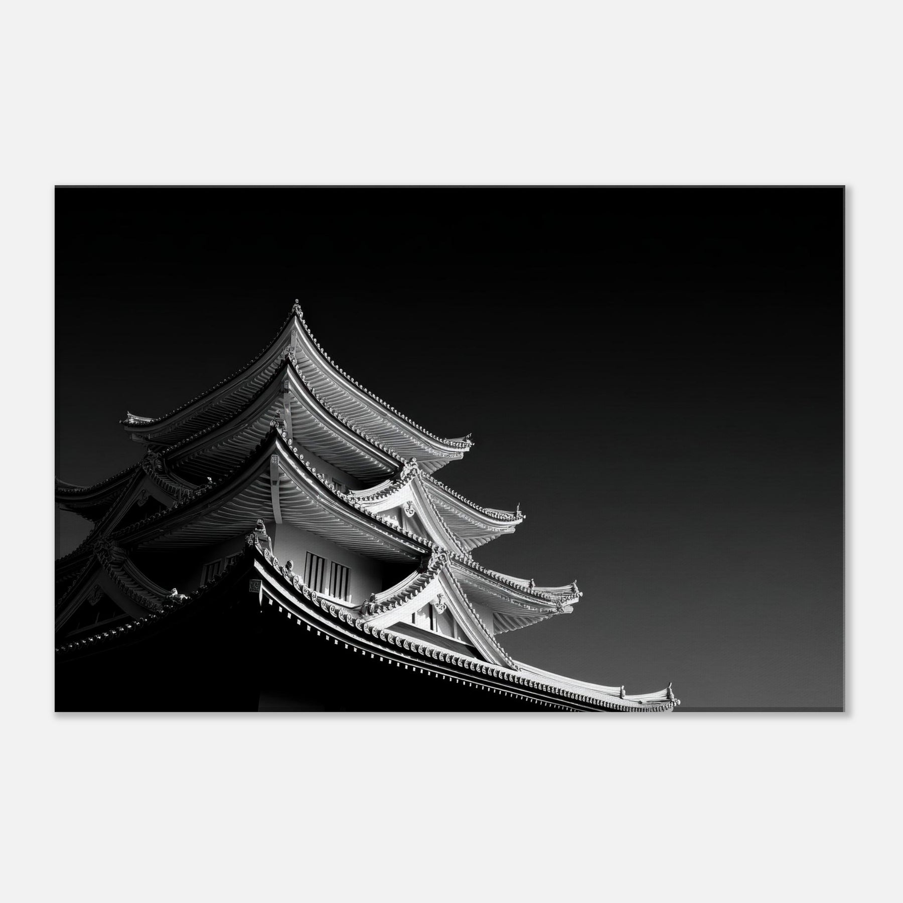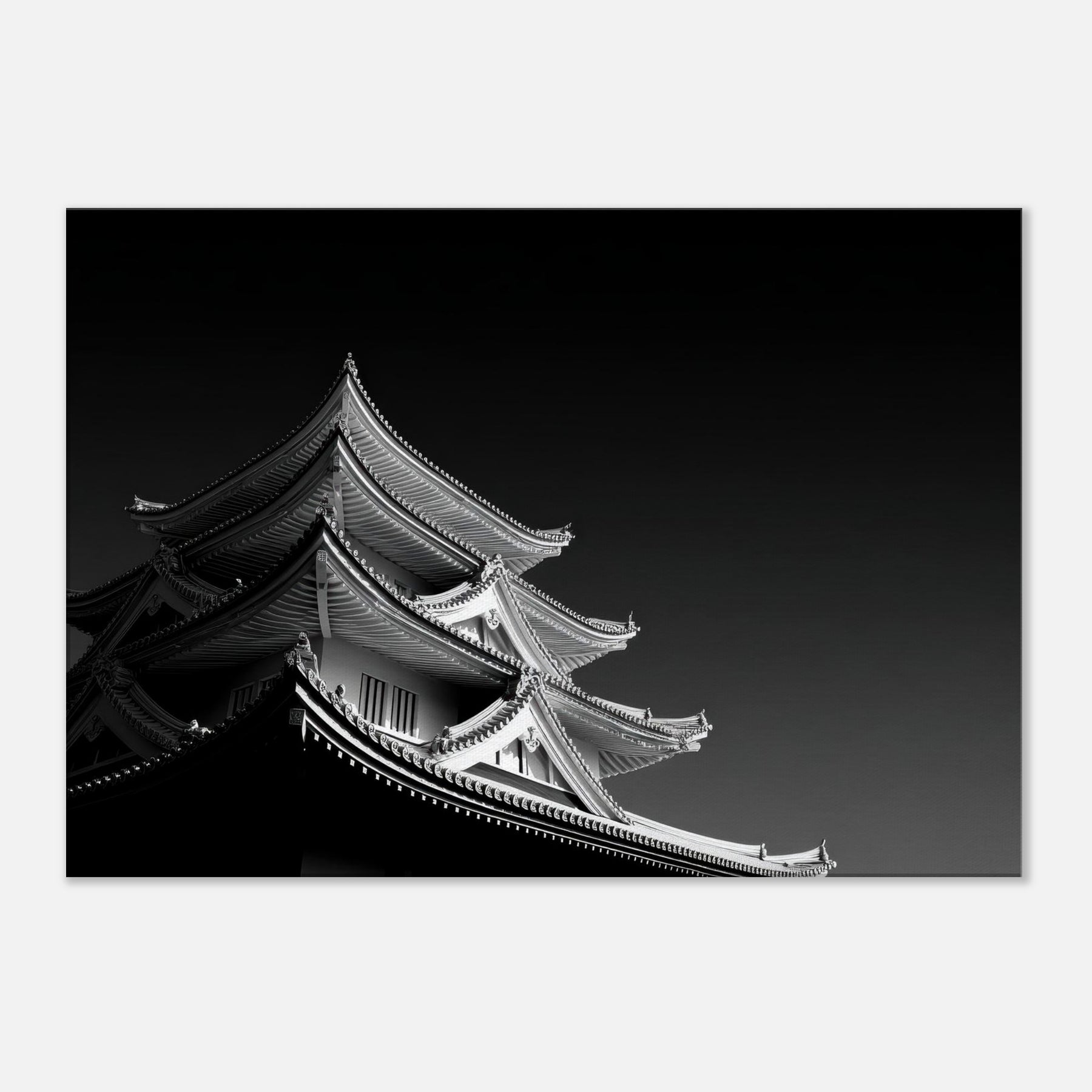 Pagoda Roofline takes center stage in a black and white study where layered eaves rise like a quiet chorus against a velvet dusk. The grayscale shifts from ink dark shadows to soft ivory, creating a mood of quiet ceremony and refined urban poetry.