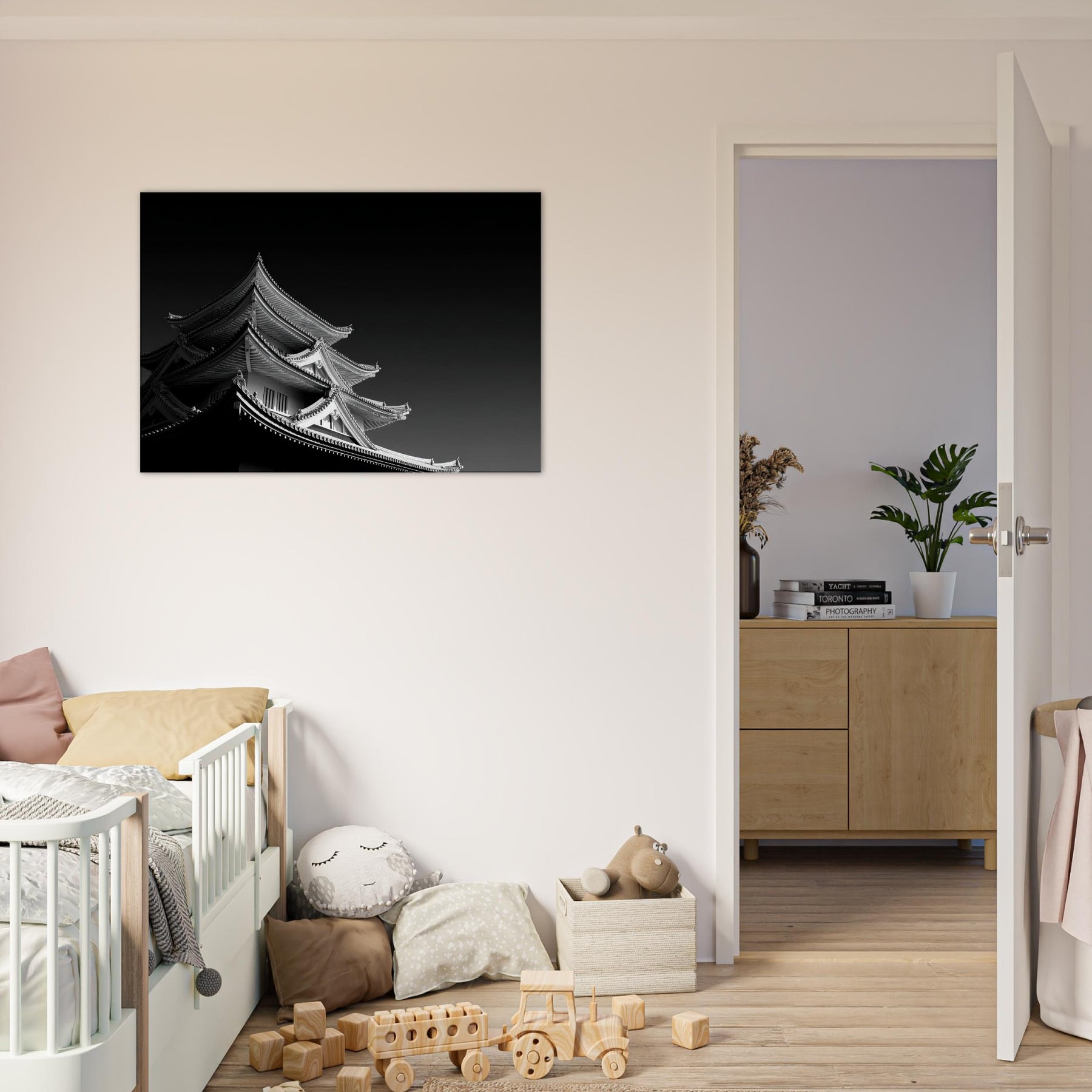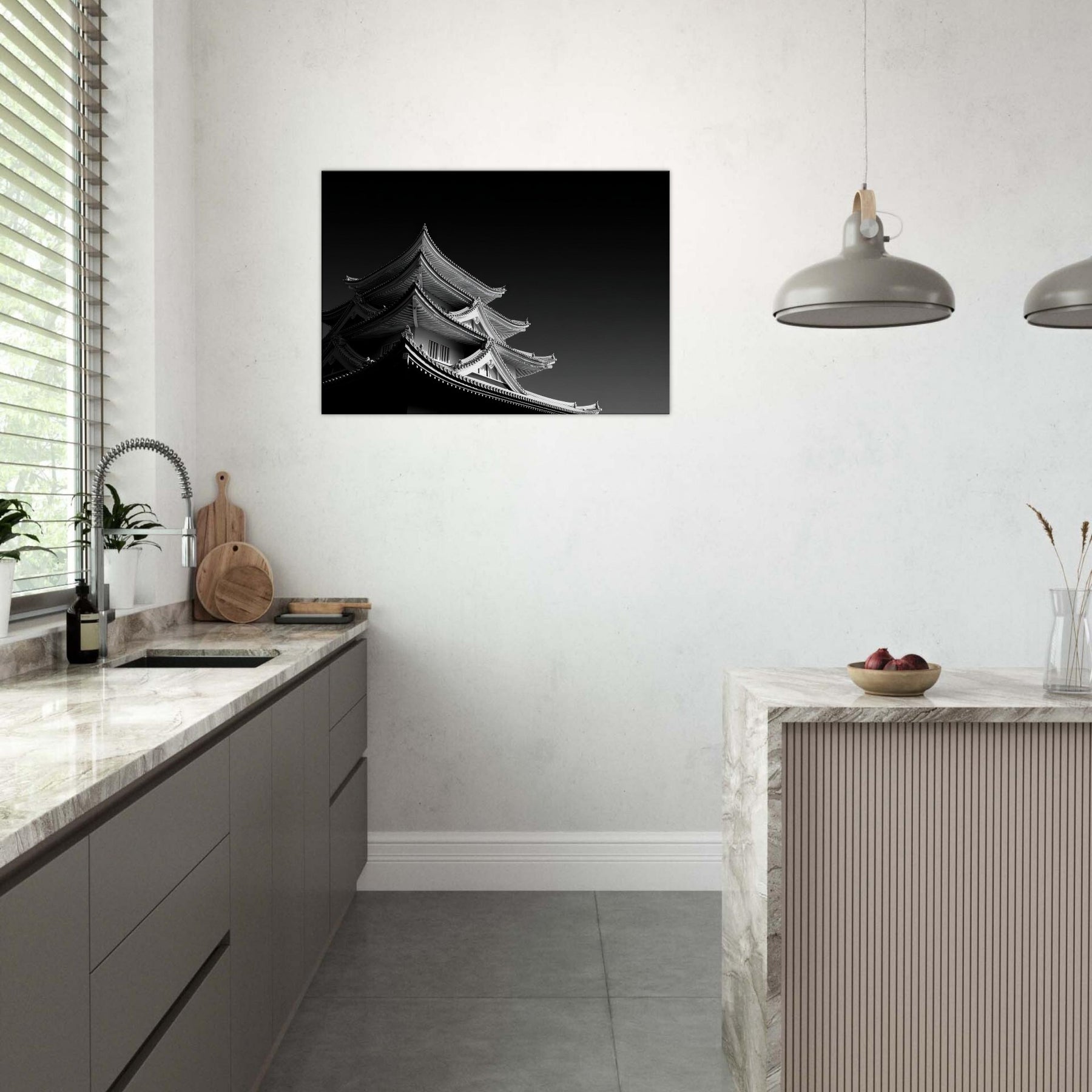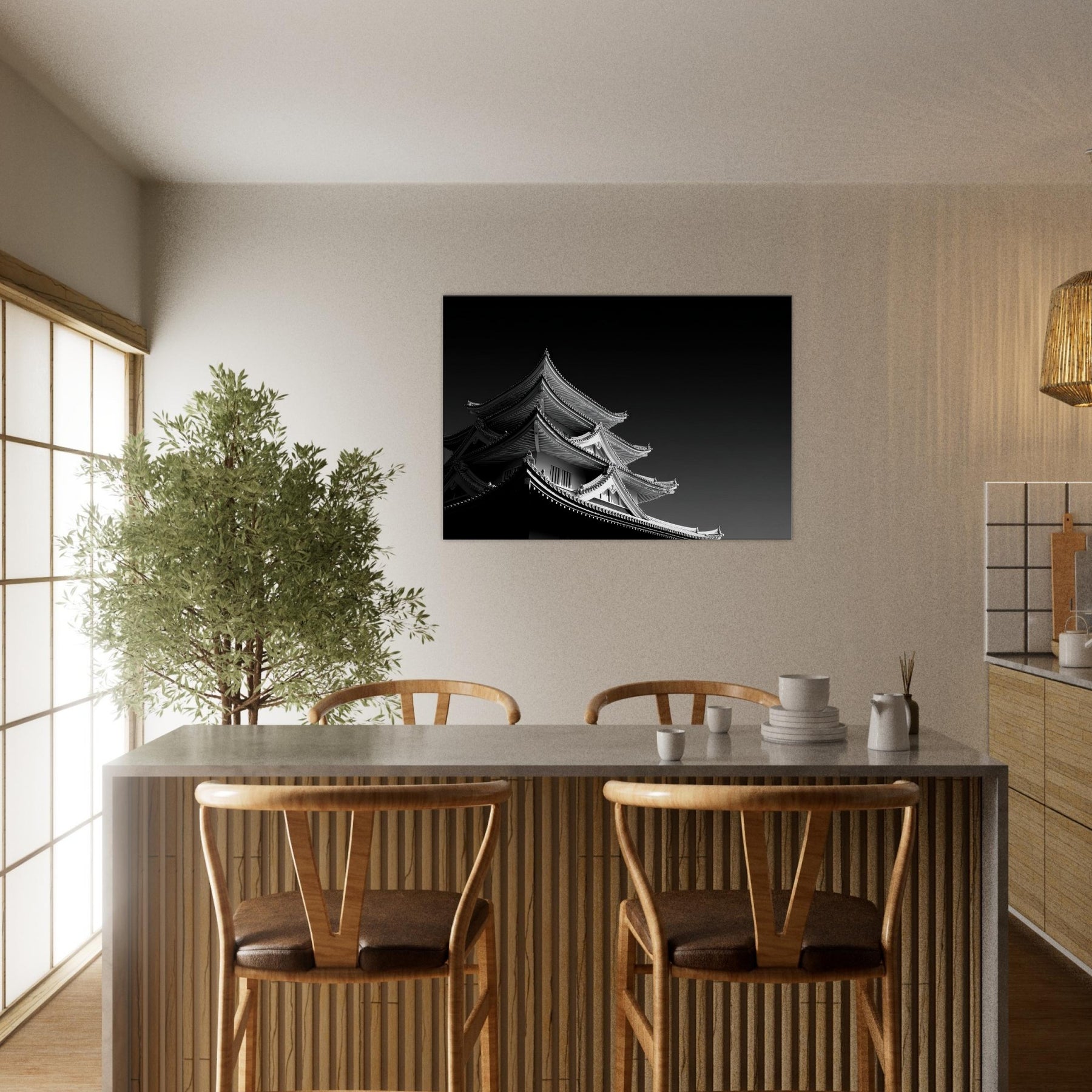 Pagoda Roofline takes center stage in a black and white study where layered eaves rise like a quiet chorus against a velvet dusk. The grayscale shifts from ink dark shadows to soft ivory, creating a mood of quiet ceremony and refined urban poetry.