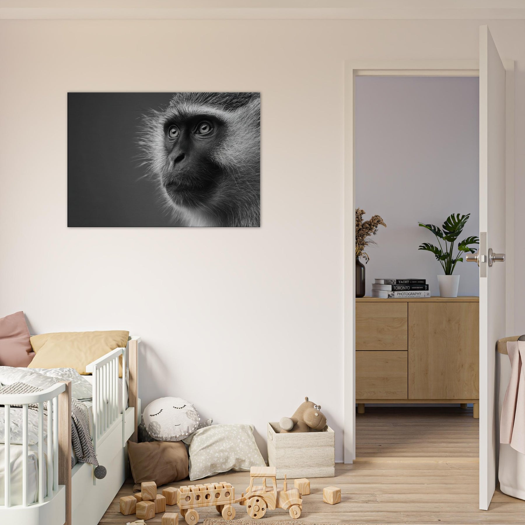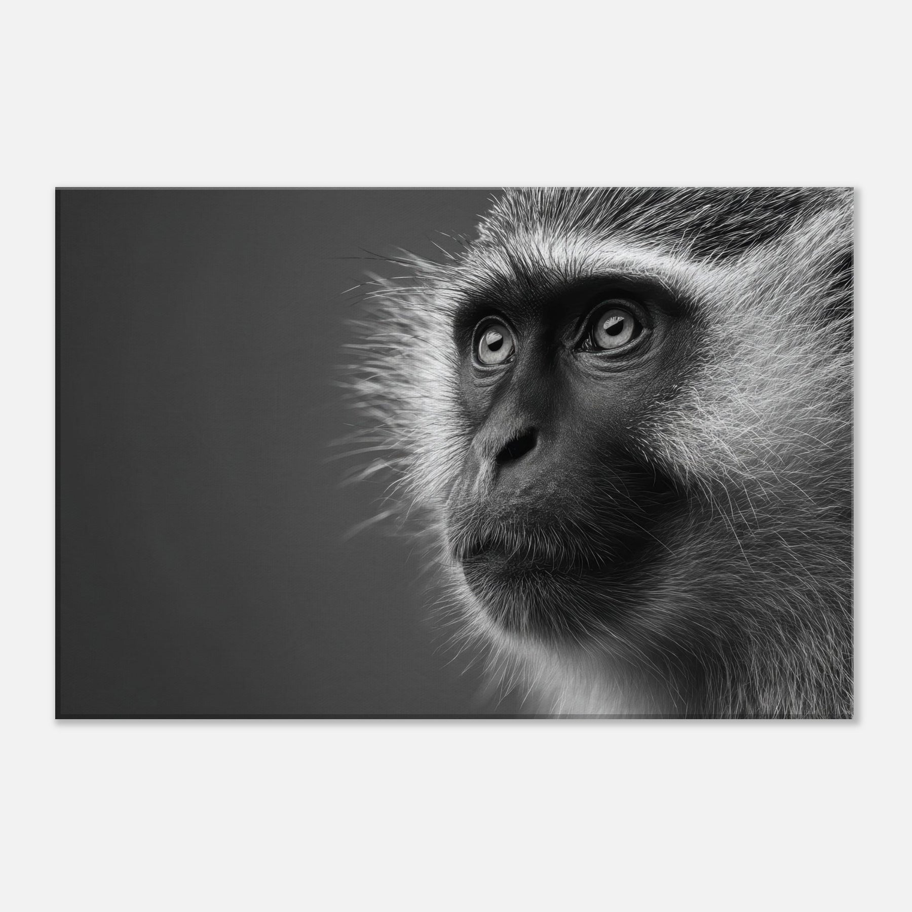 Like a quiet observer, this black and white study captures a monkey in a moment of stillness and curiosity.