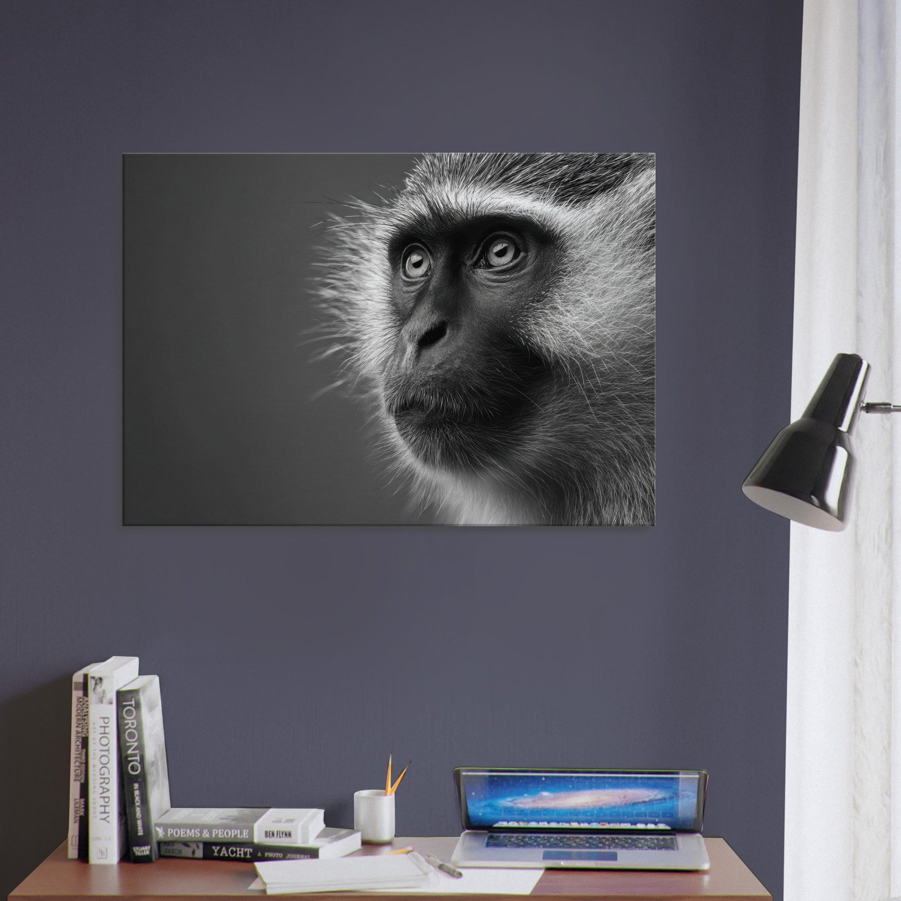 The high contrast fur, luminous eyes, and subtle texture invite the viewer to lean in, feeling the room's rhythm slow to a hushed tempo. Hung in a living room or hallway, it transforms walls into a gallery of restraint and drama, pairing timeless animal portraiture with contemporary monochrome mood to elevate any space.