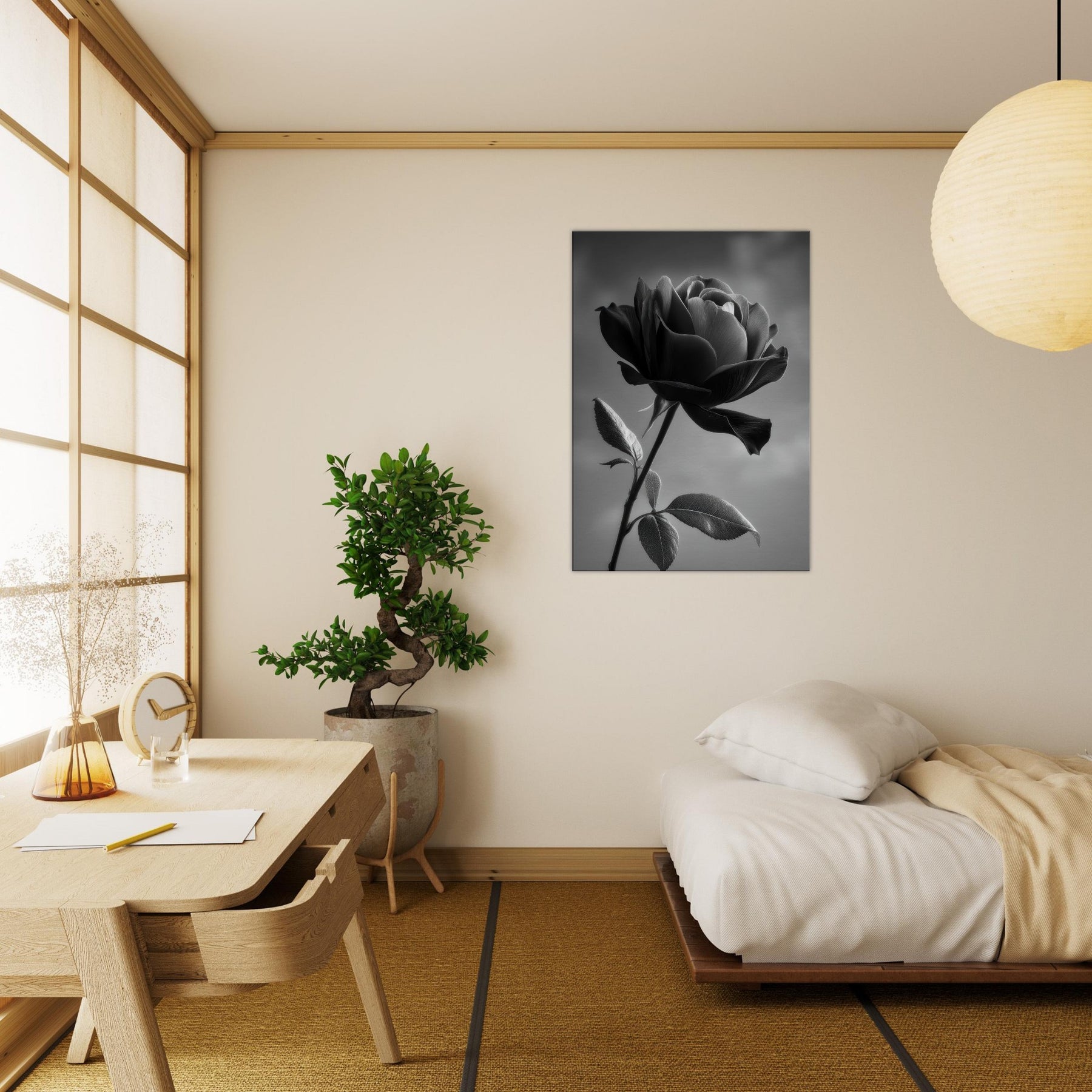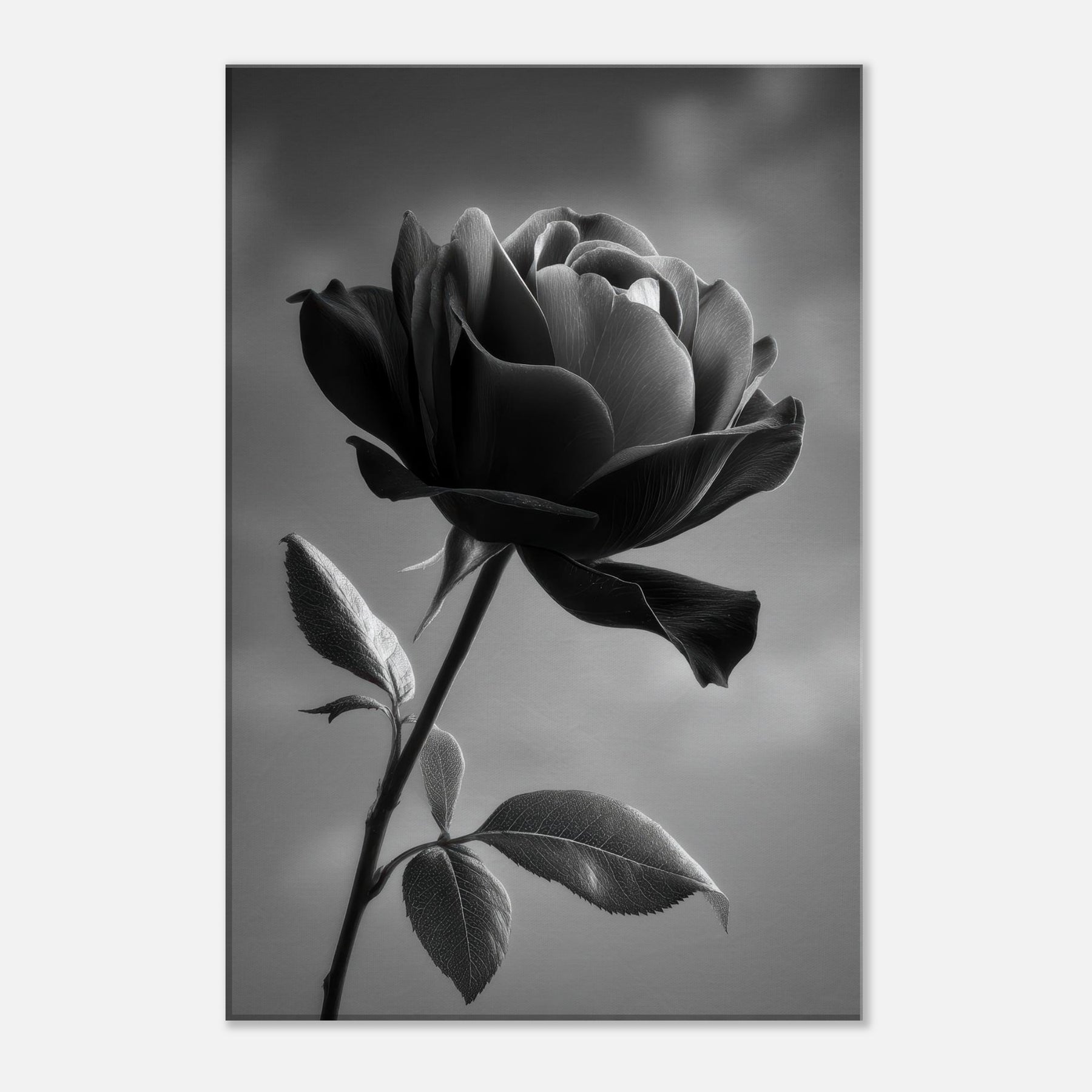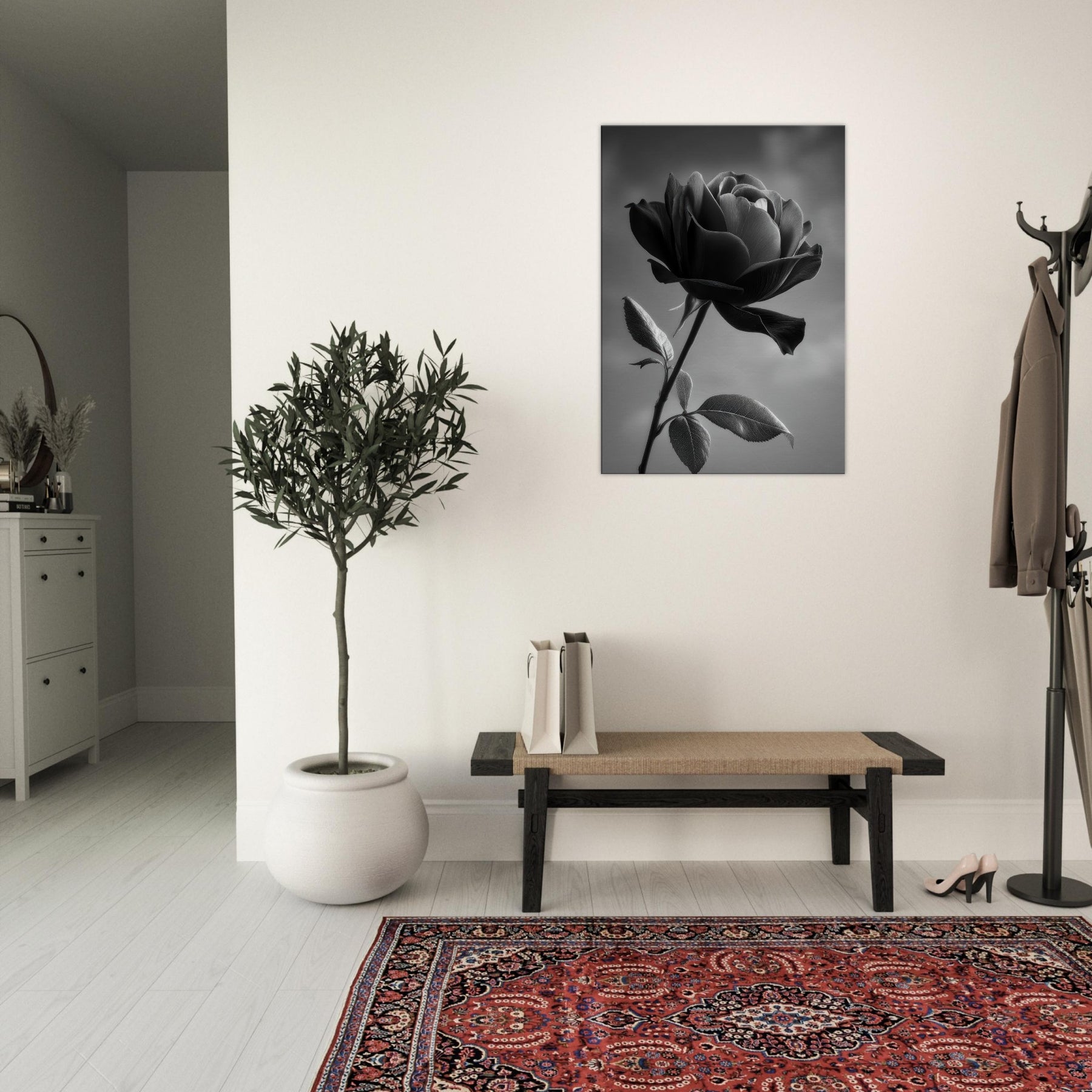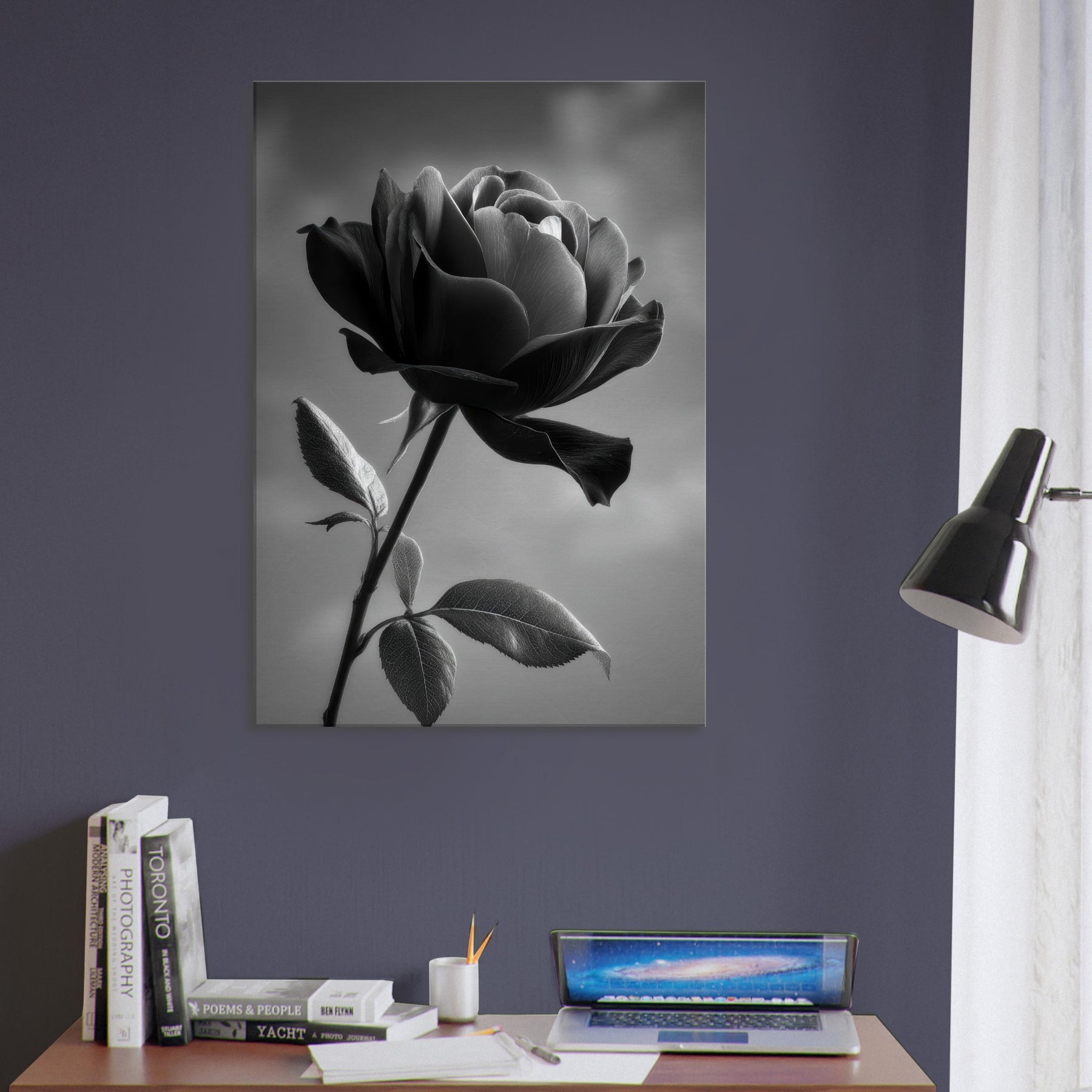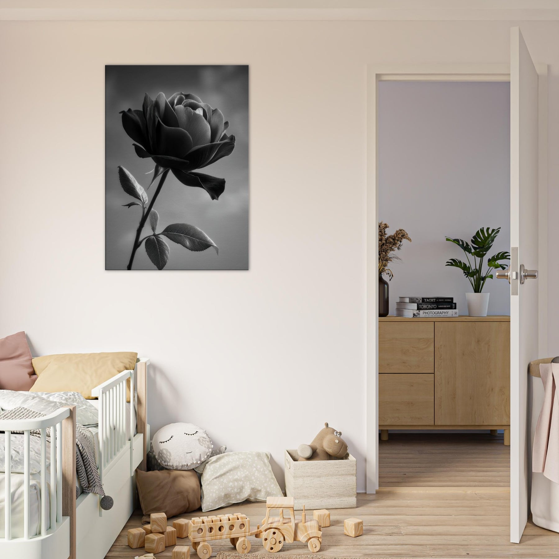 This Rose blooms in quiet majesty, its petals etched in grayscale with velvet shadows and silver light. The composition invites fingers to trace the soft curves, the slender stem, and the textured leaves, as if a breath of wind had paused mid fall. Perfect for a living room or bedroom, it brings calm, refined atmosphere, and a touch of nature’s stillness. A timeless accent that turns walls into a contemplative gallery.