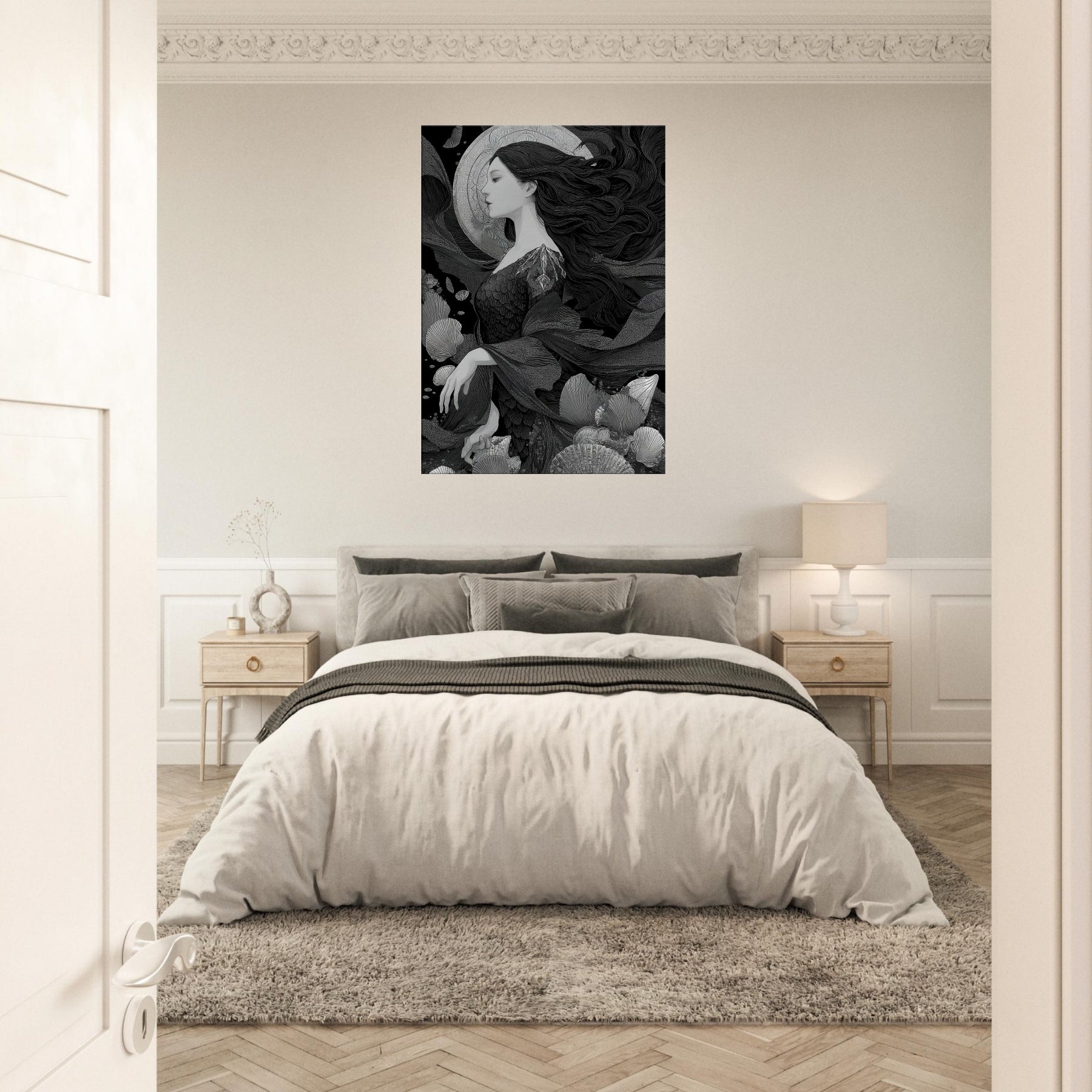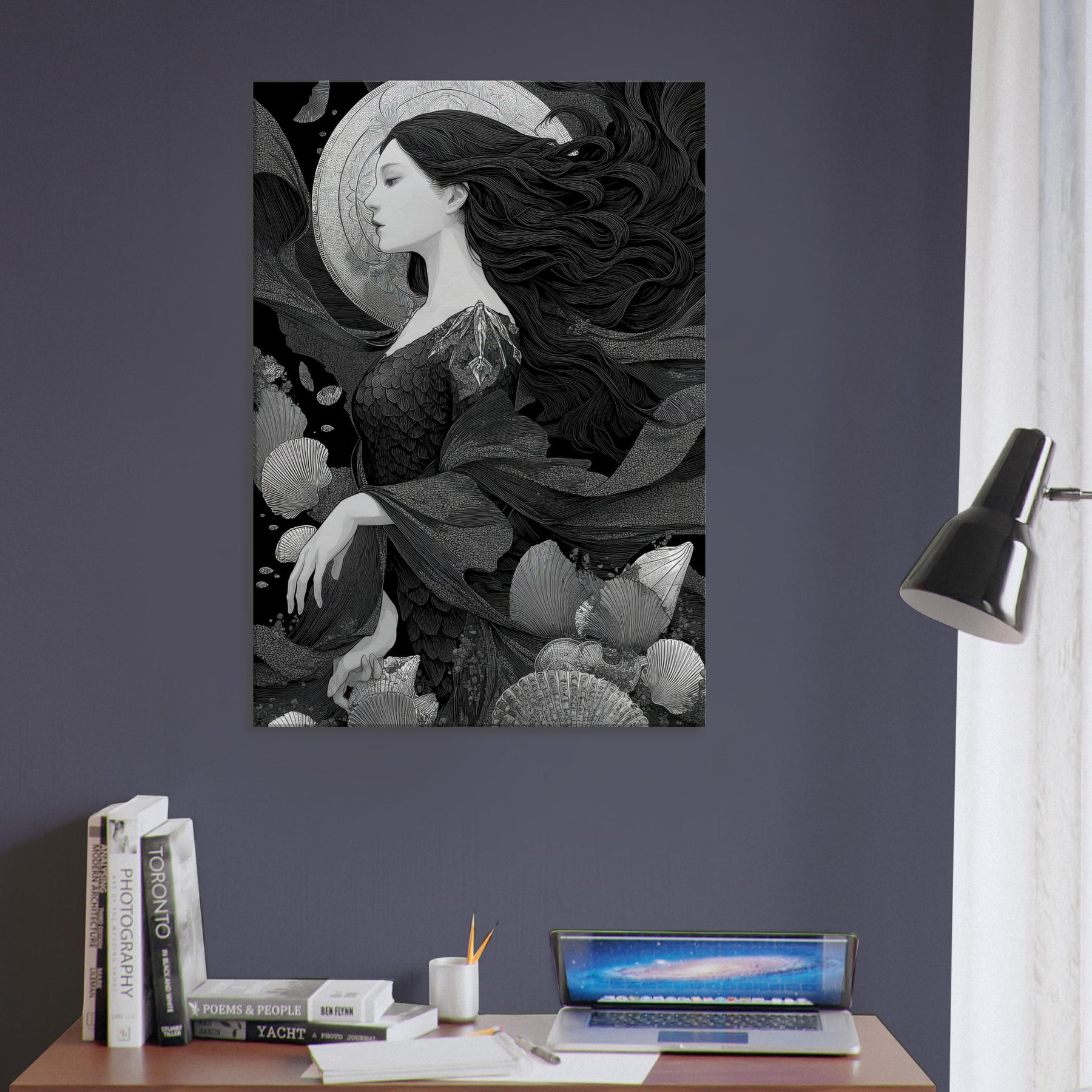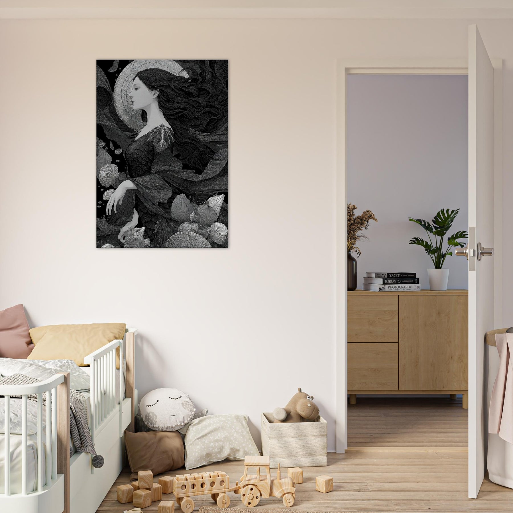 Immerse your room in an ocean of hush and wonder. The Enchanted Mermaid glides through a moonlit sea captured in black and white detail, where every scale and ripple reads as a whisper of wind, salt, and memory.