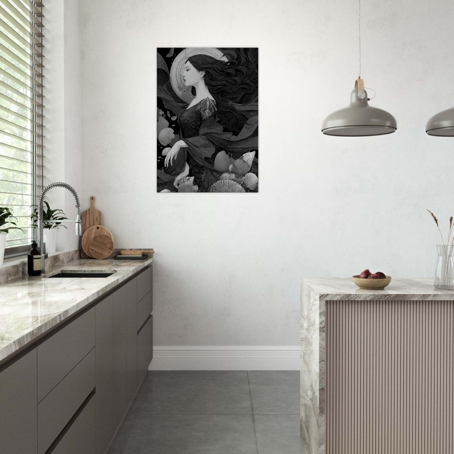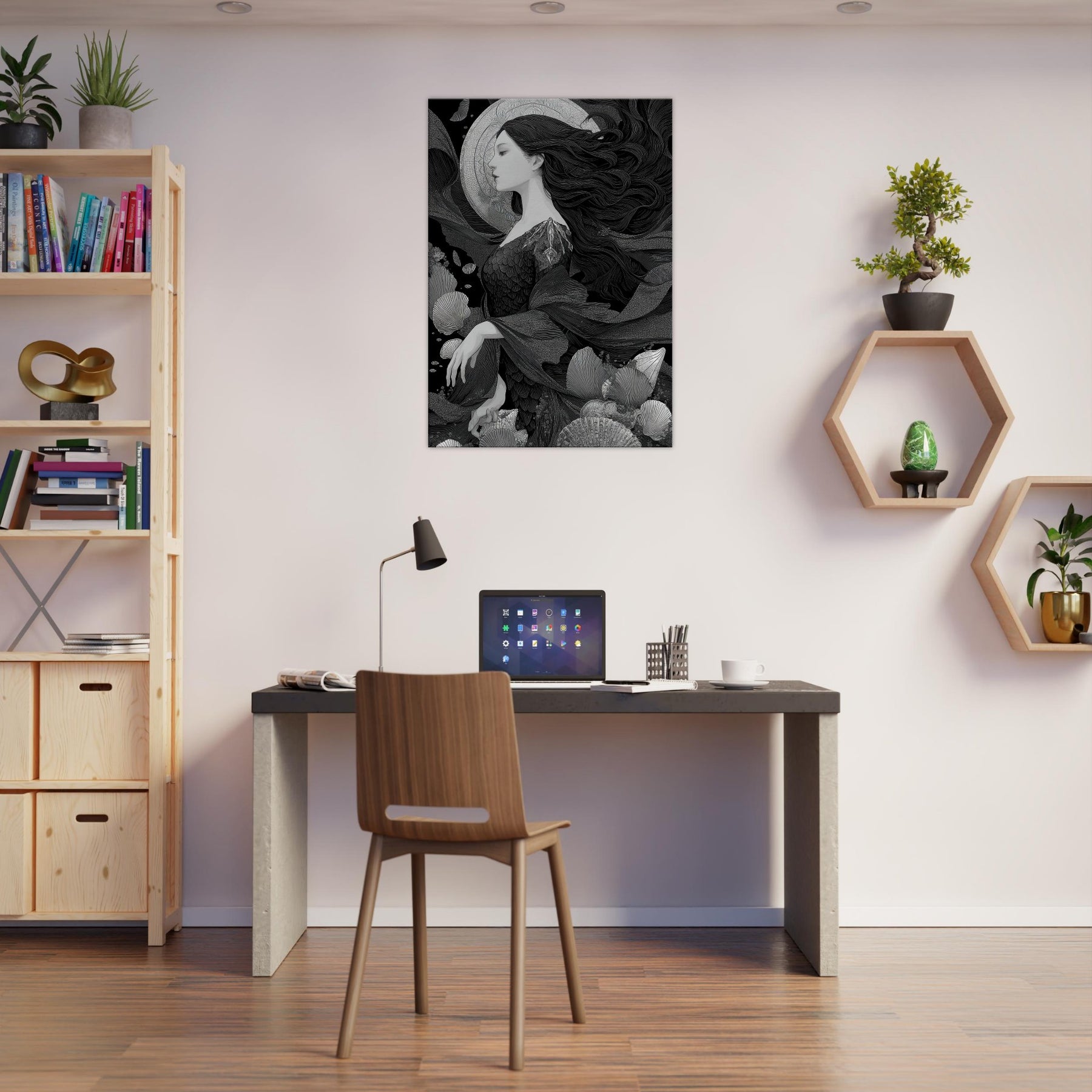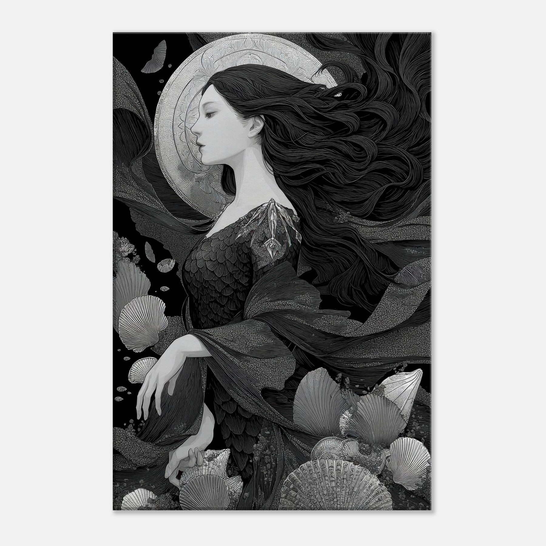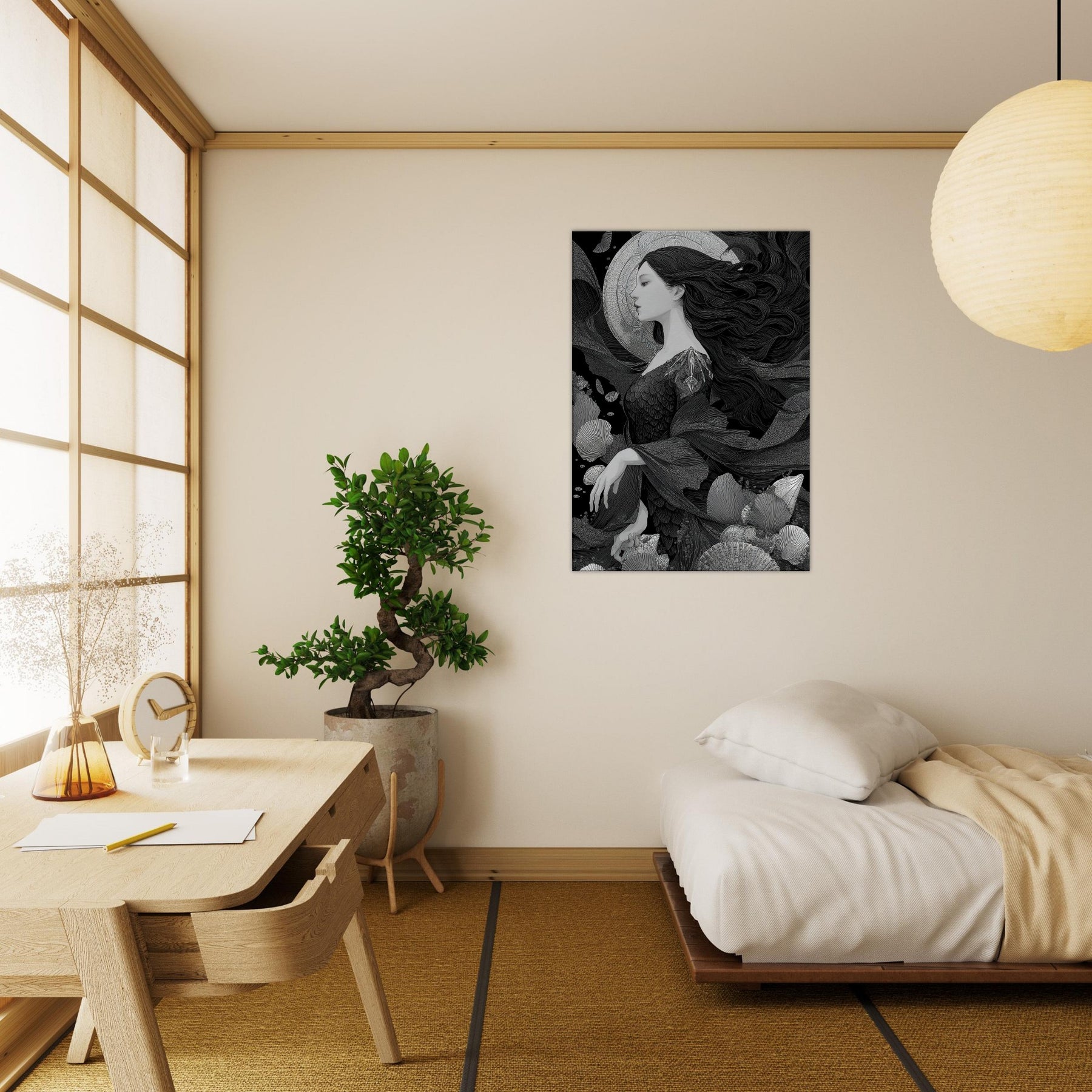 Immerse your room in an ocean of hush and wonder. The Enchanted Mermaid glides through a moonlit sea captured in black and white detail, where every scale and ripple reads as a whisper of wind, salt, and memory.