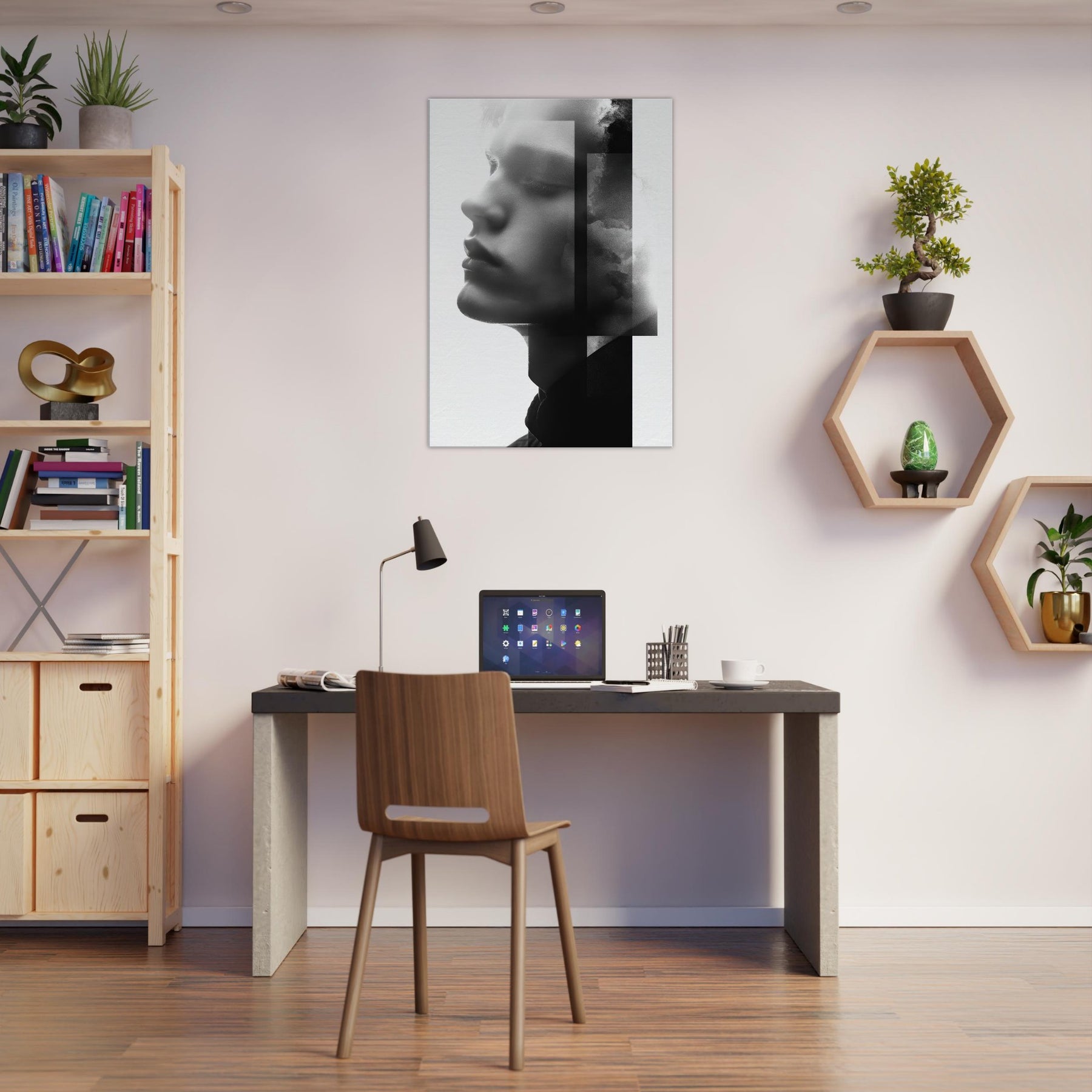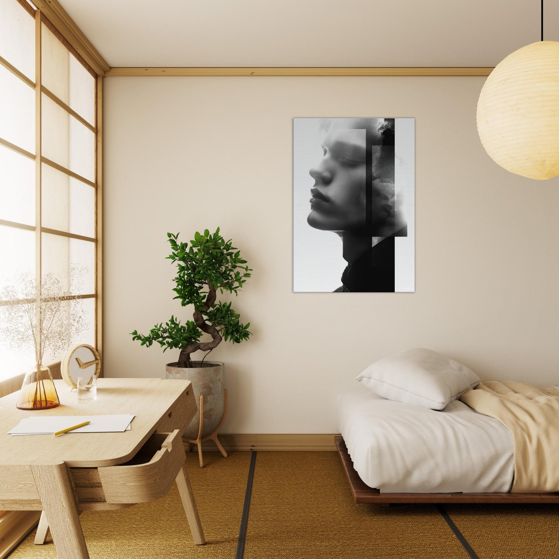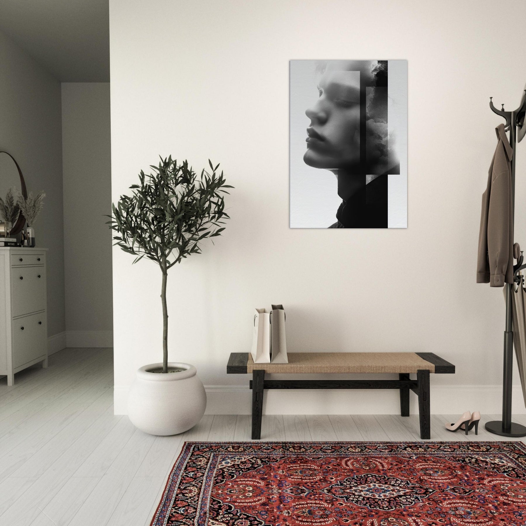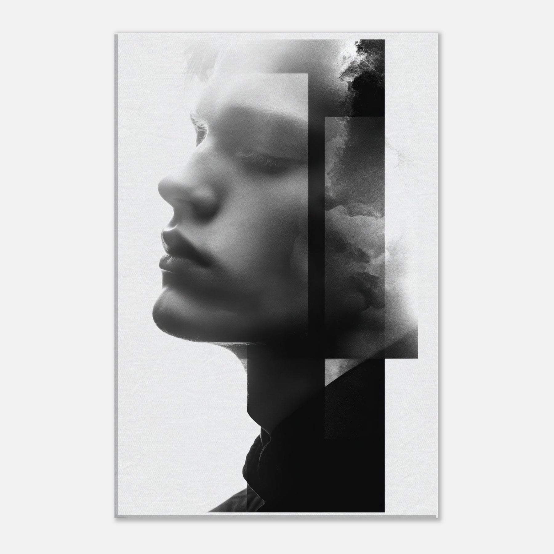 Color Field unfurls through a quiet profile, grayscale light bathing the face in suspended tension. The composition layers geometric panels with smoky textures, letting breath and shadow drift across the surface.