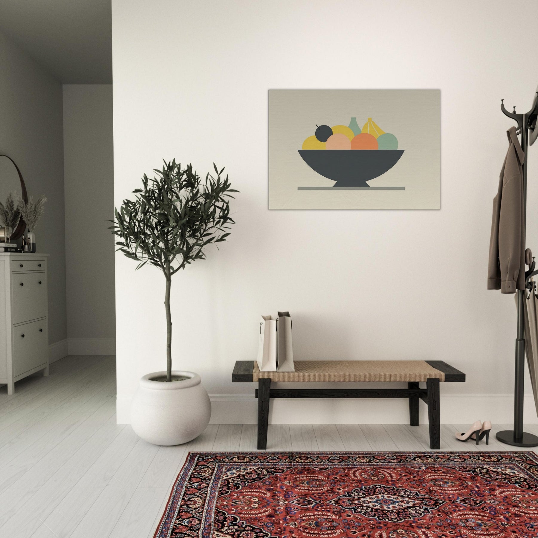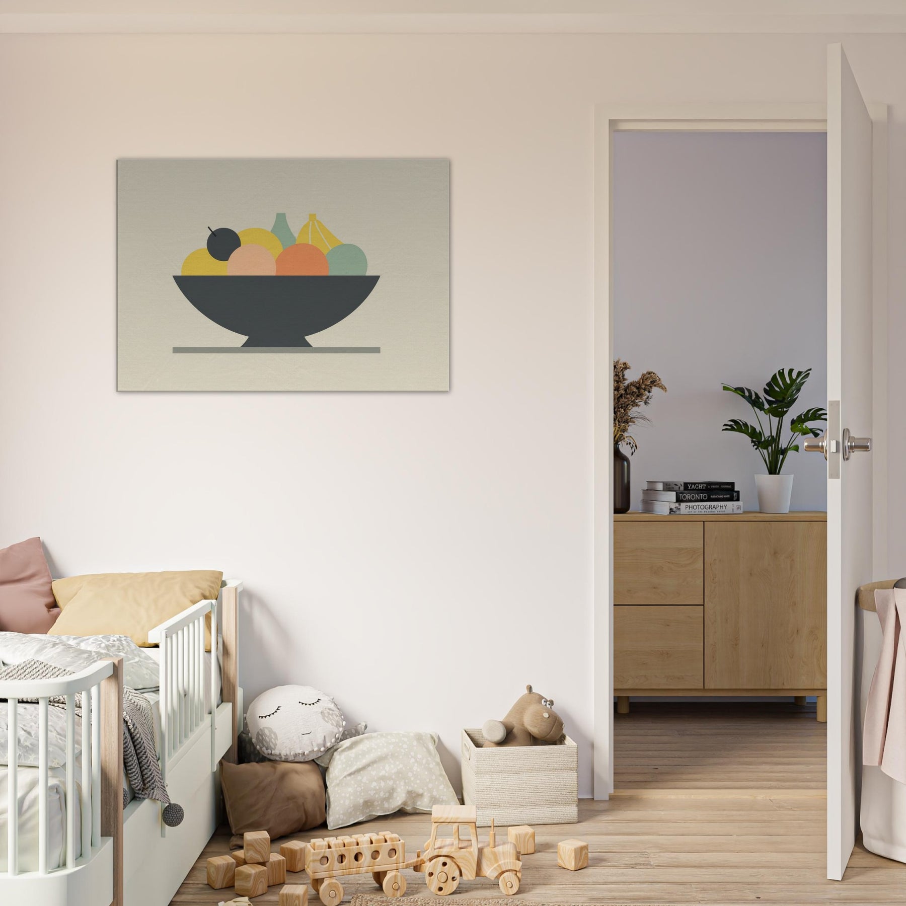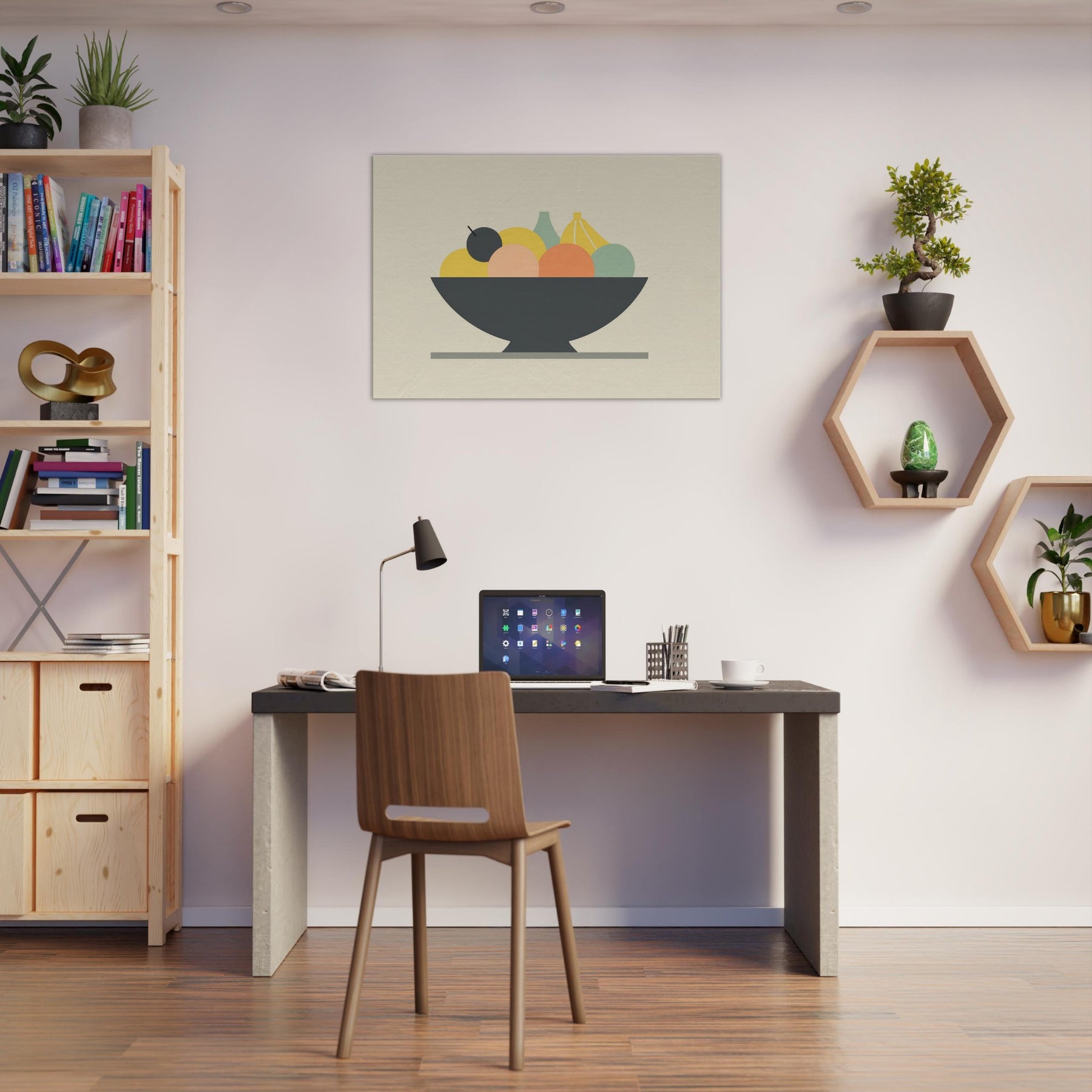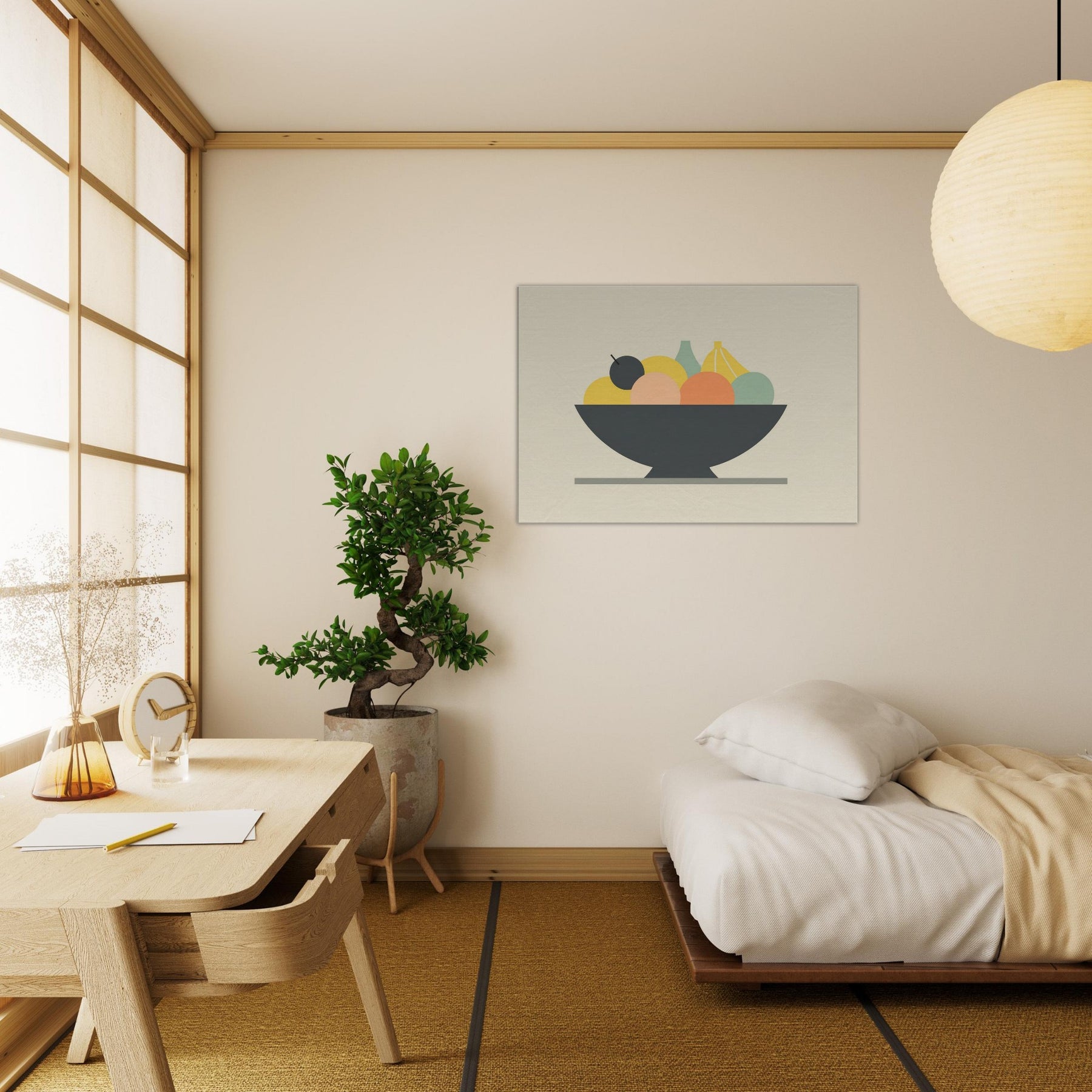 Like a quiet chord in a sunlit room, this work centers on the Fruit Bowl, the Primary Subject rendered in flat, unadorned shapes. The minimalist palette pearl background, charcoal bowl, soft yellows, tangerine, blush, sage evokes a serene still life that feels both timeless and contemporary. Its calm geometry invites gentle reflection, making a living space feel organized and breathable. Hang it where daylight can slide across the surface and let the colors bloom without crowding your space.