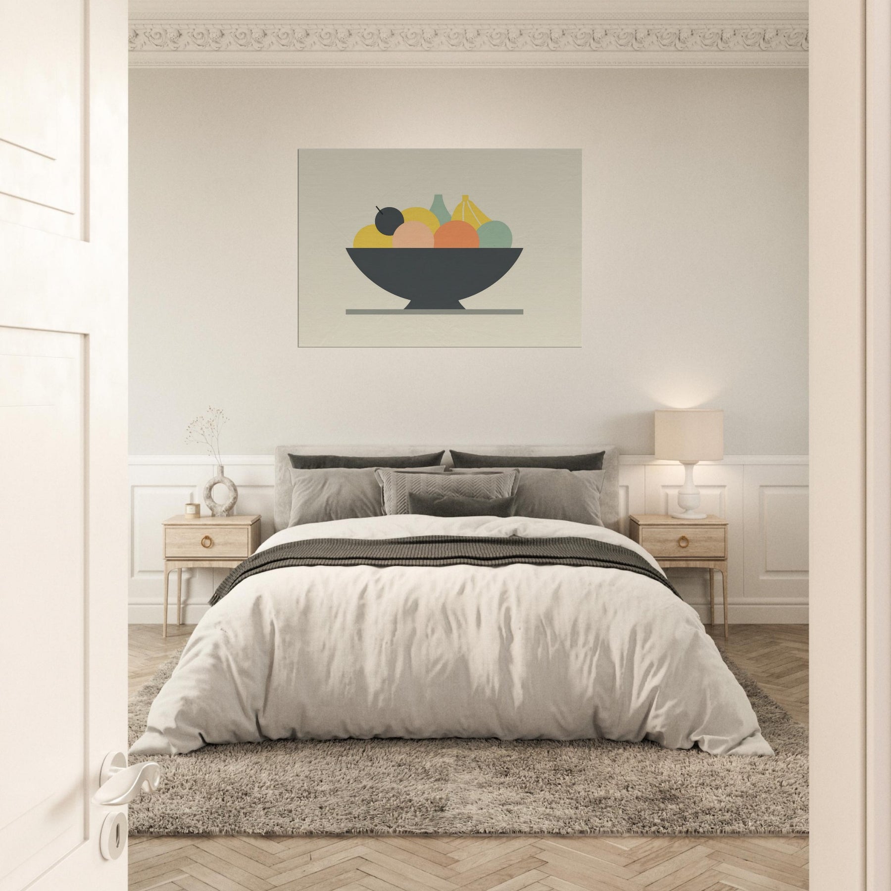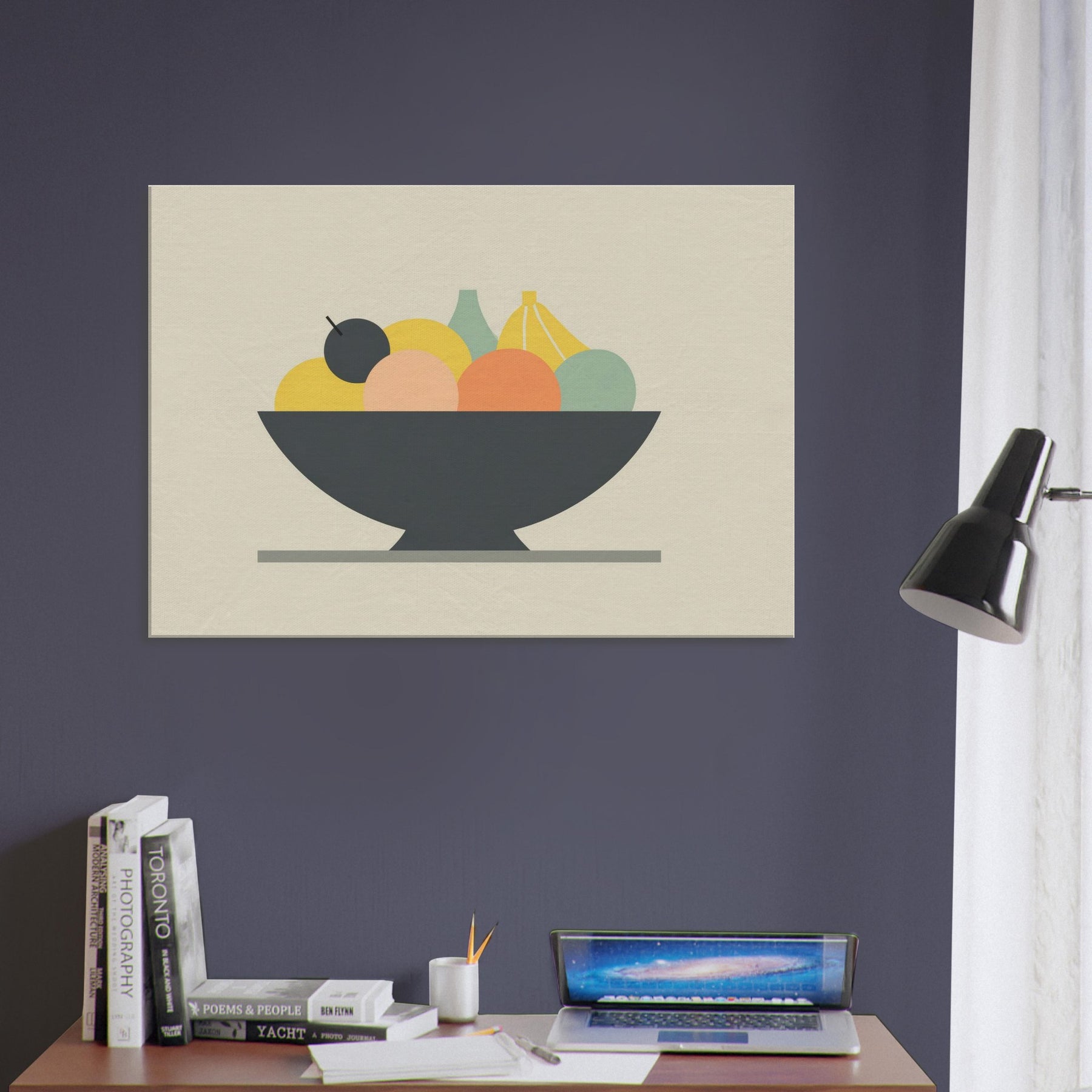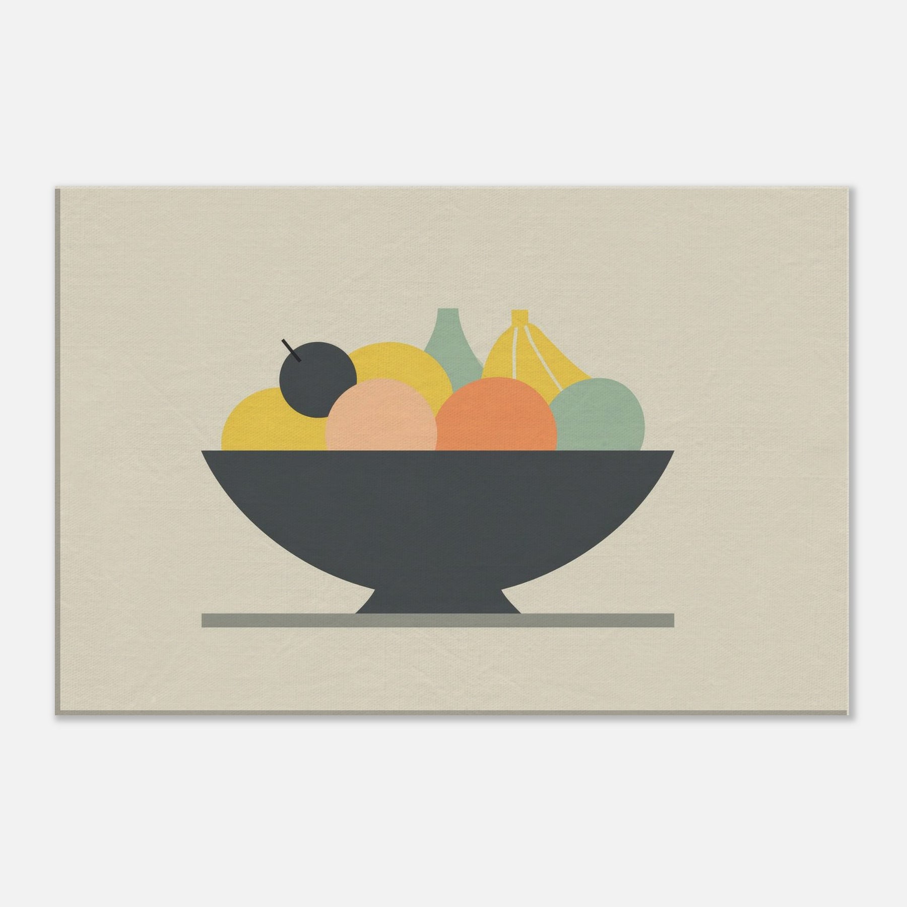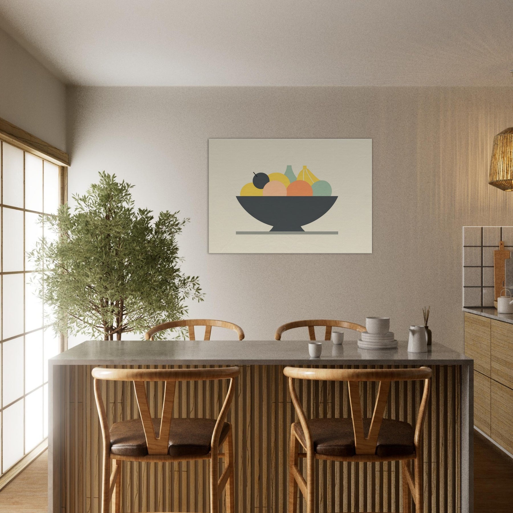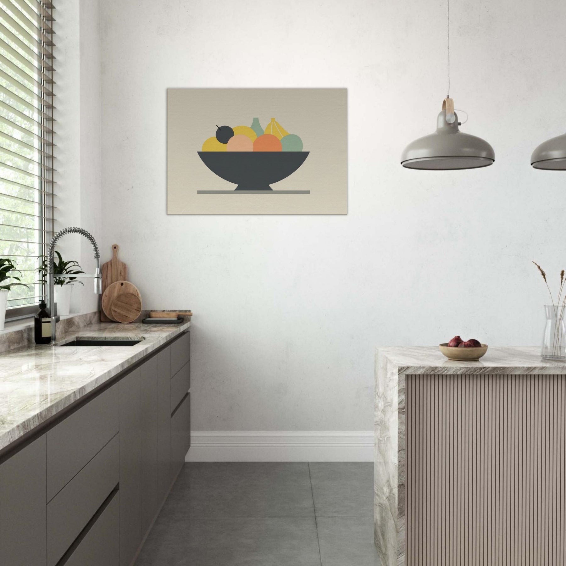 Like a quiet chord in a sunlit room, this work centers on the Fruit Bowl, the Primary Subject rendered in flat, unadorned shapes. The minimalist palette pearl background, charcoal bowl, soft yellows, tangerine, blush, sage evokes a serene still life that feels both timeless and contemporary. Its calm geometry invites gentle reflection, making a living space feel organized and breathable. Hang it where daylight can slide across the surface and let the colors bloom without crowding your space.