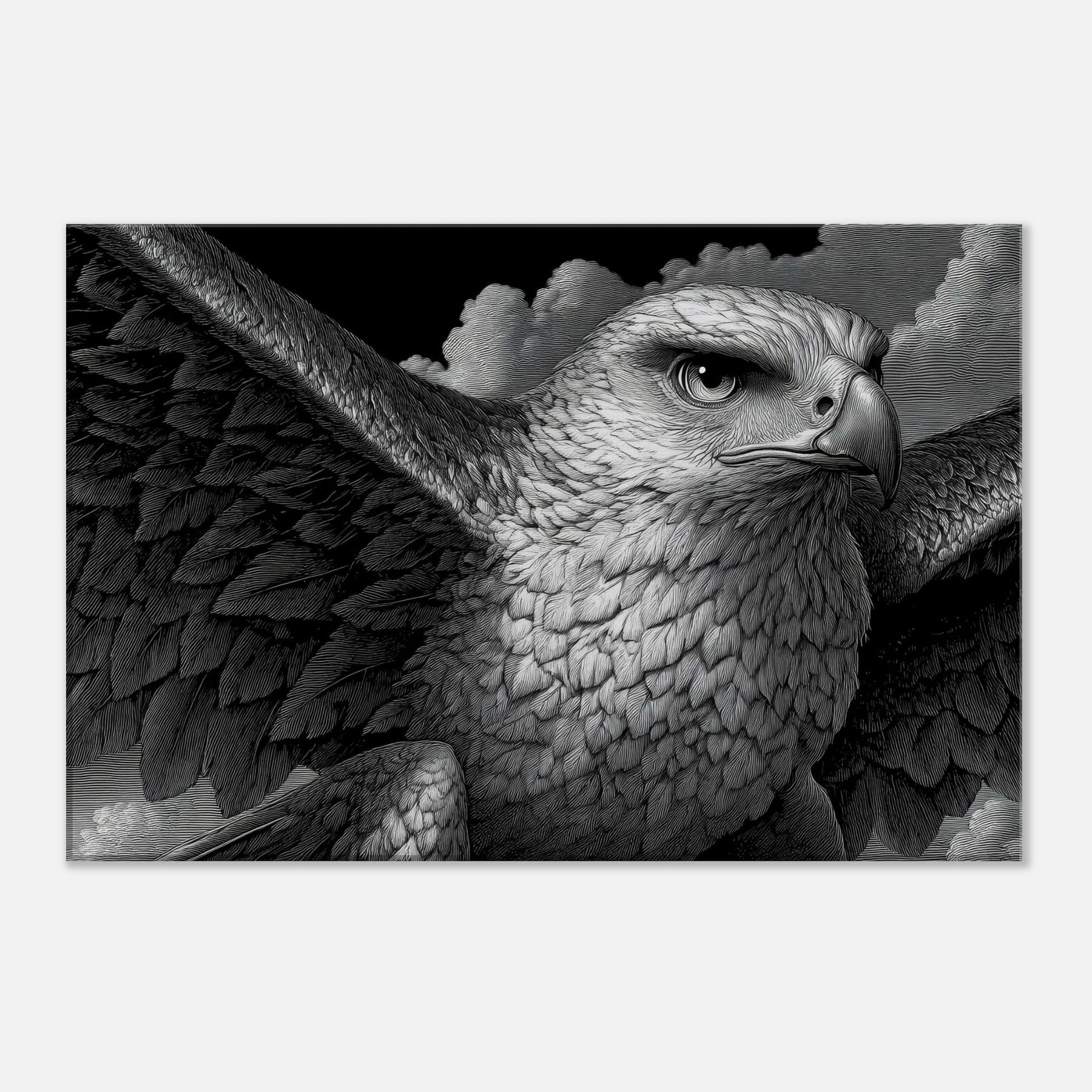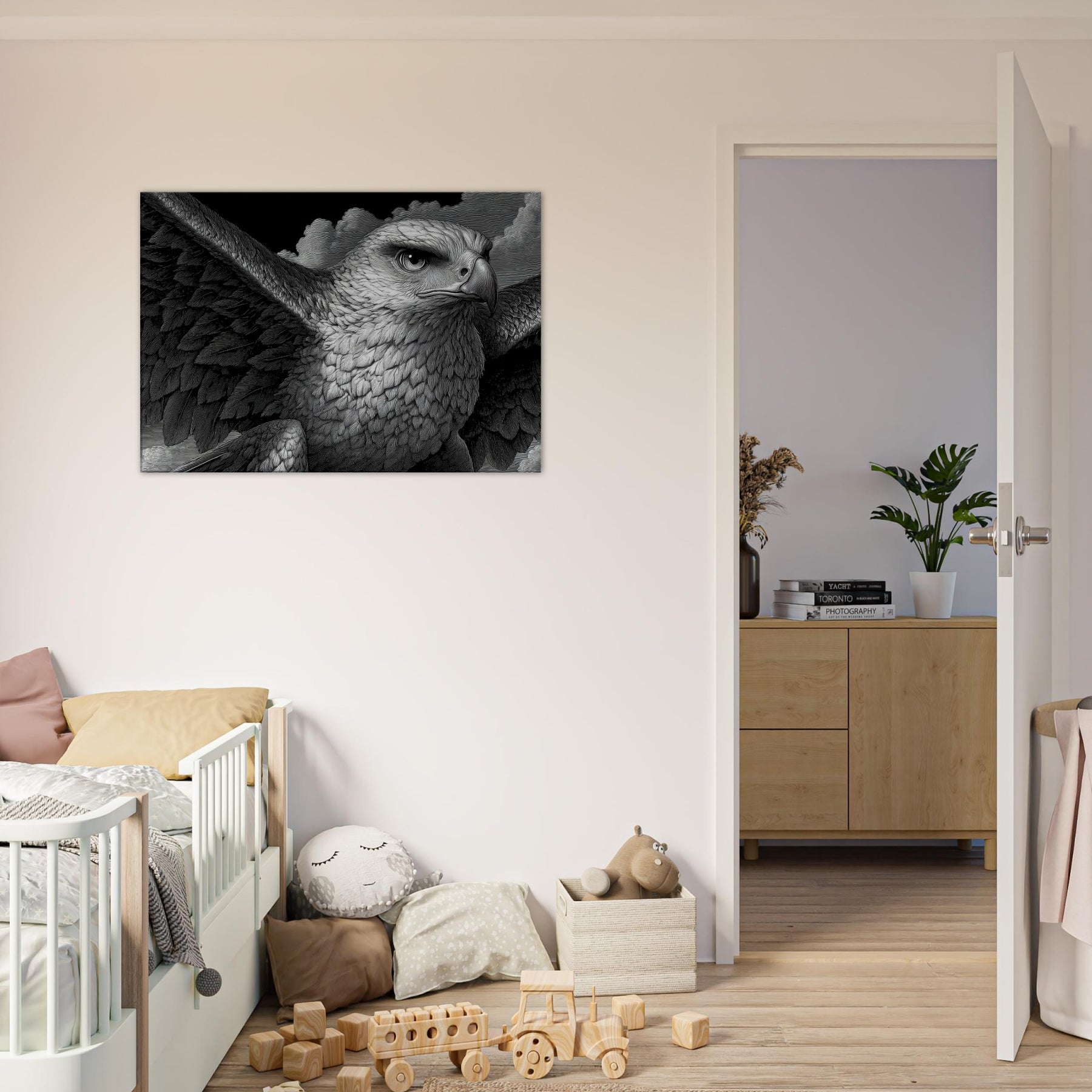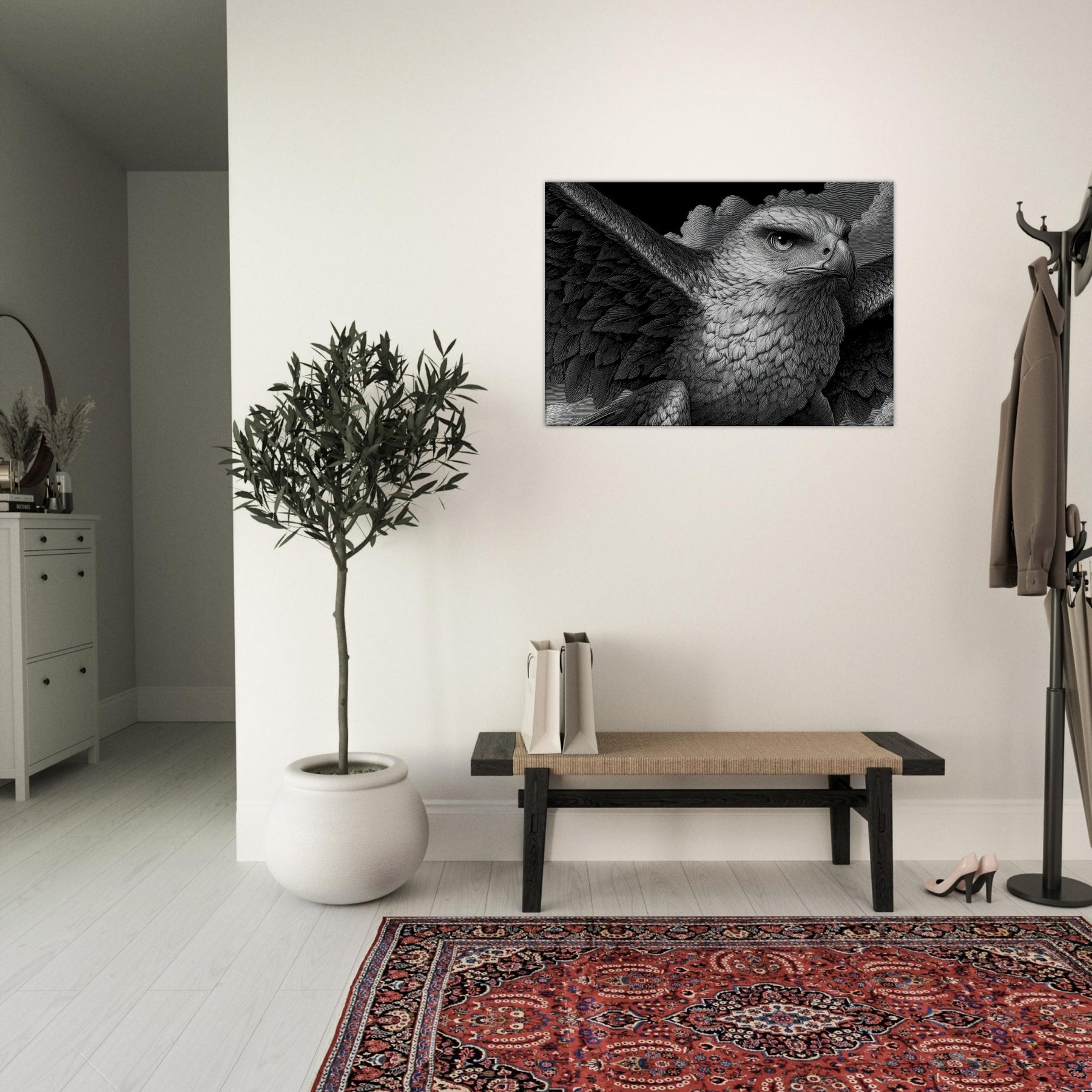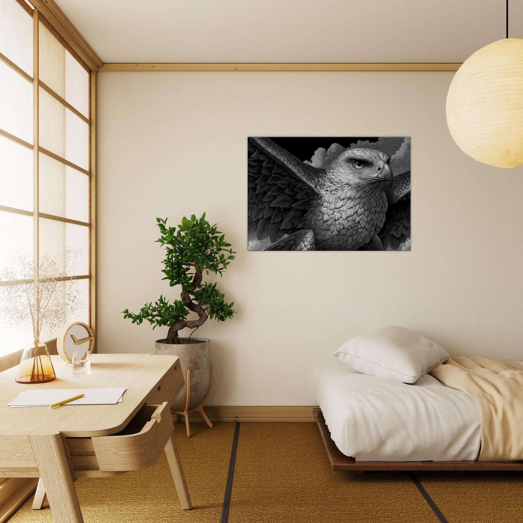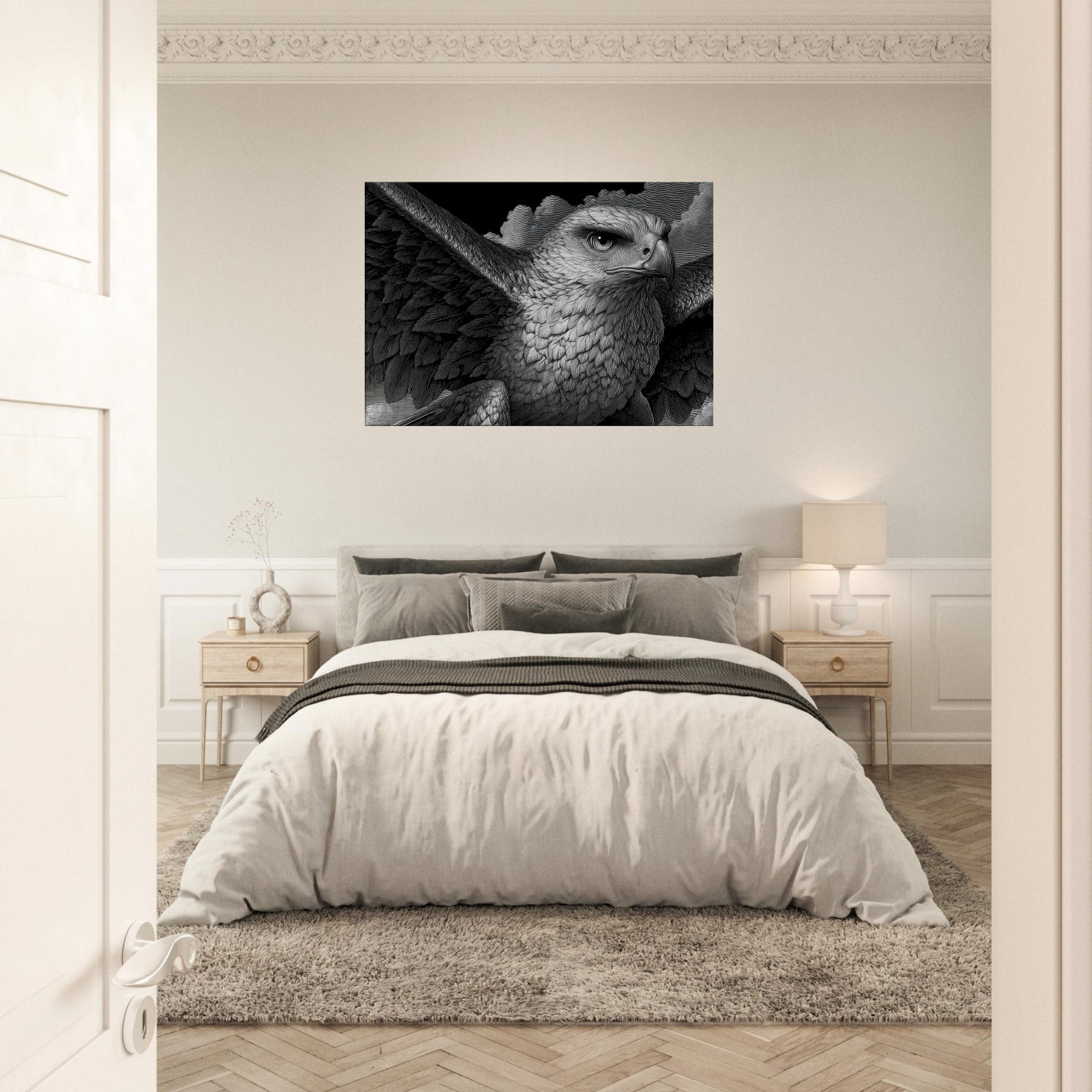 Immerse your space in the solemn gravity of a Noble Griffin, rendered in stark black and white. Every feather is etched with quiet rigor, creating a tactile, wind swept texture that seems to hover between dream and dawn.