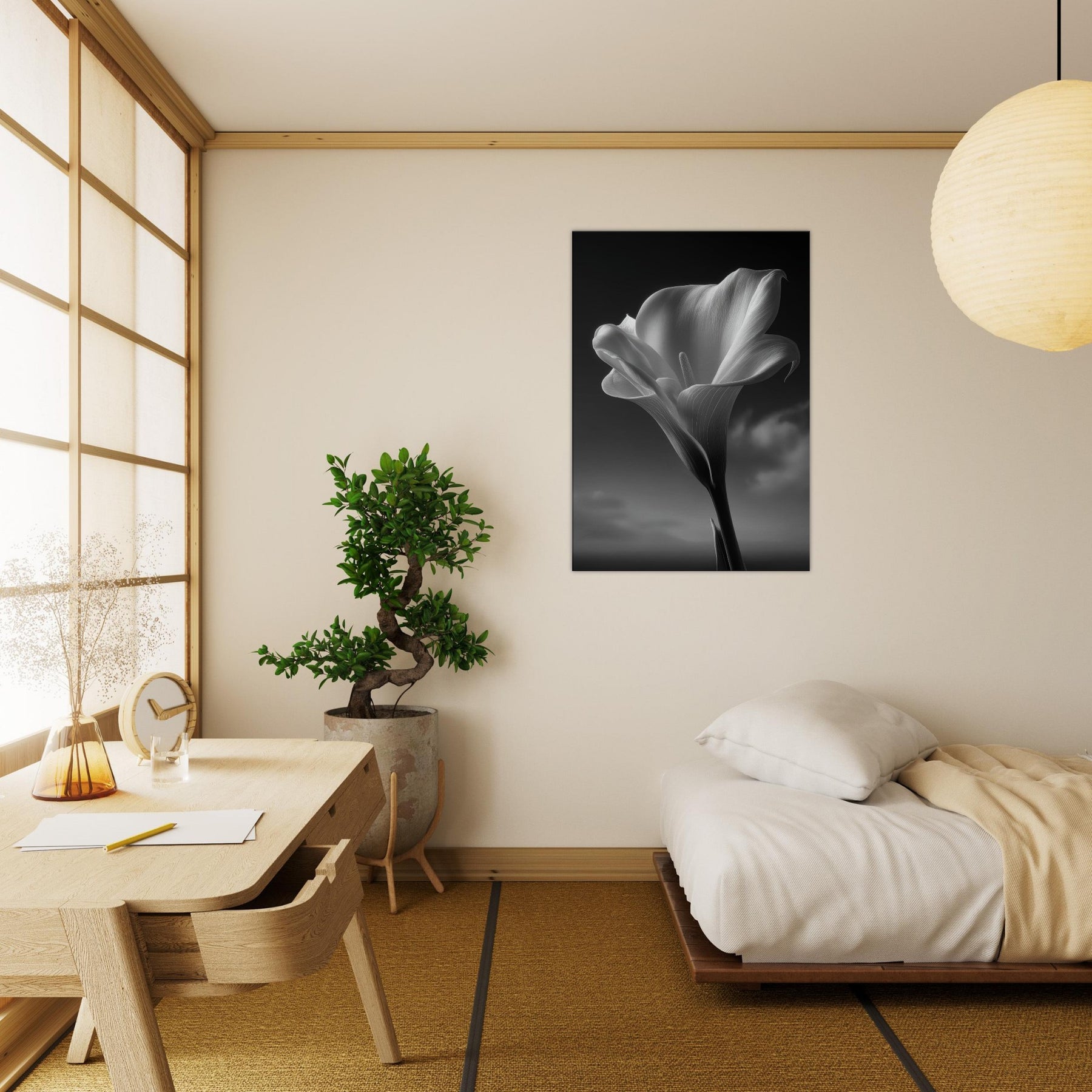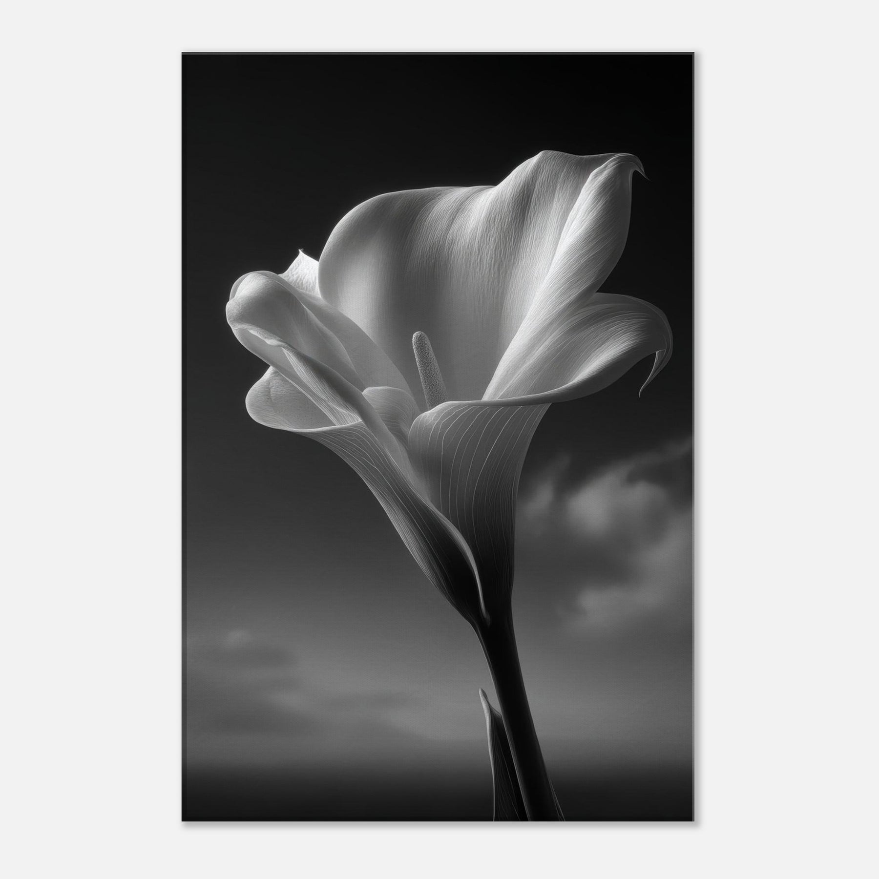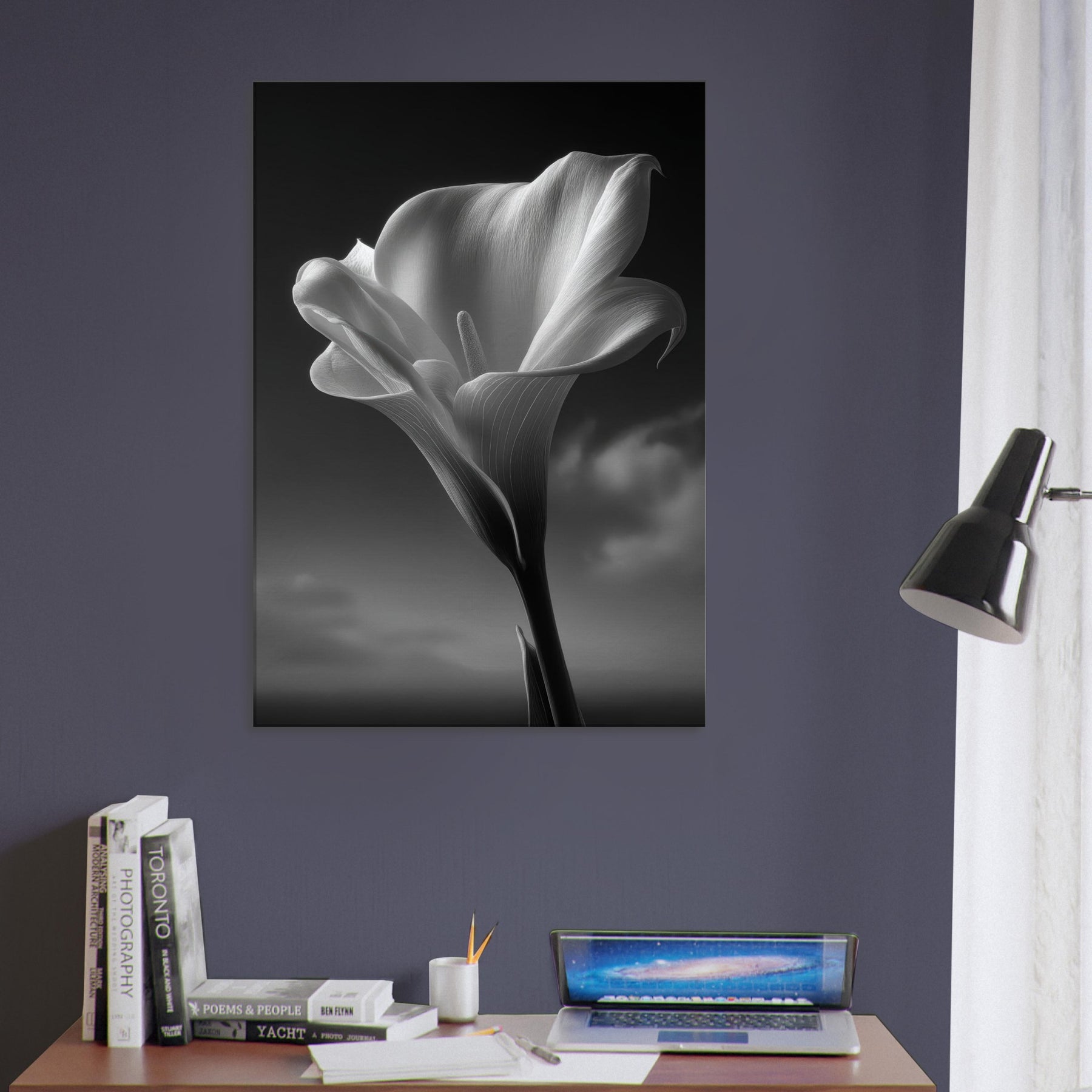 Experience the quiet drama of the Calla Lily rendered in black and white. This image captures a single bloom as if cut by moonlight, its curves and veining bathed in soft contrast and tactile texture. The atmosphere is serene yet evocative, inviting reflective pause in a living room or bedroom. The Calla Lily rises with graceful, restrained elegance, turning a wall into a sculptural moment. Pair it with clean lines and muted tones for a timeless centerpiece that breathes calm into daily life.