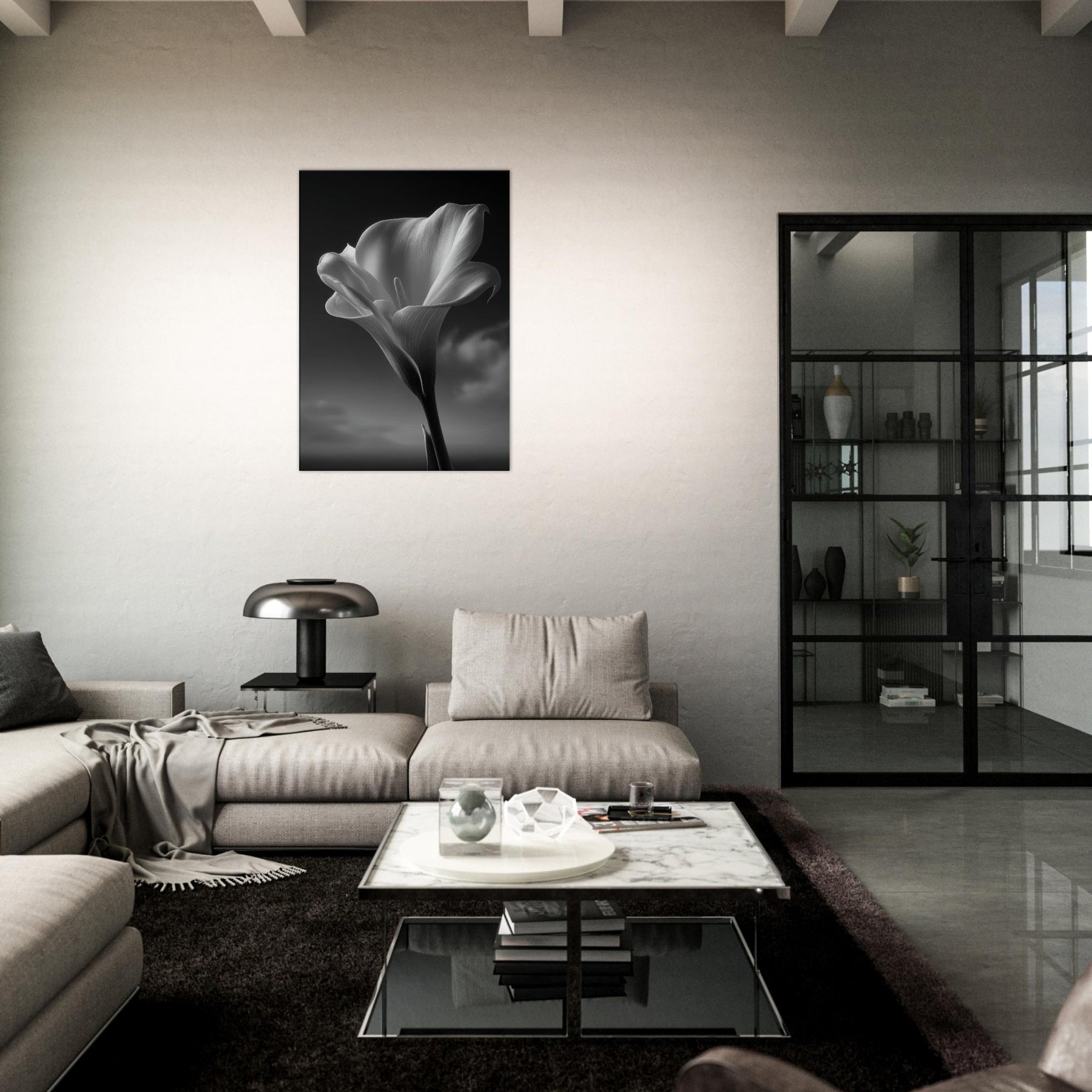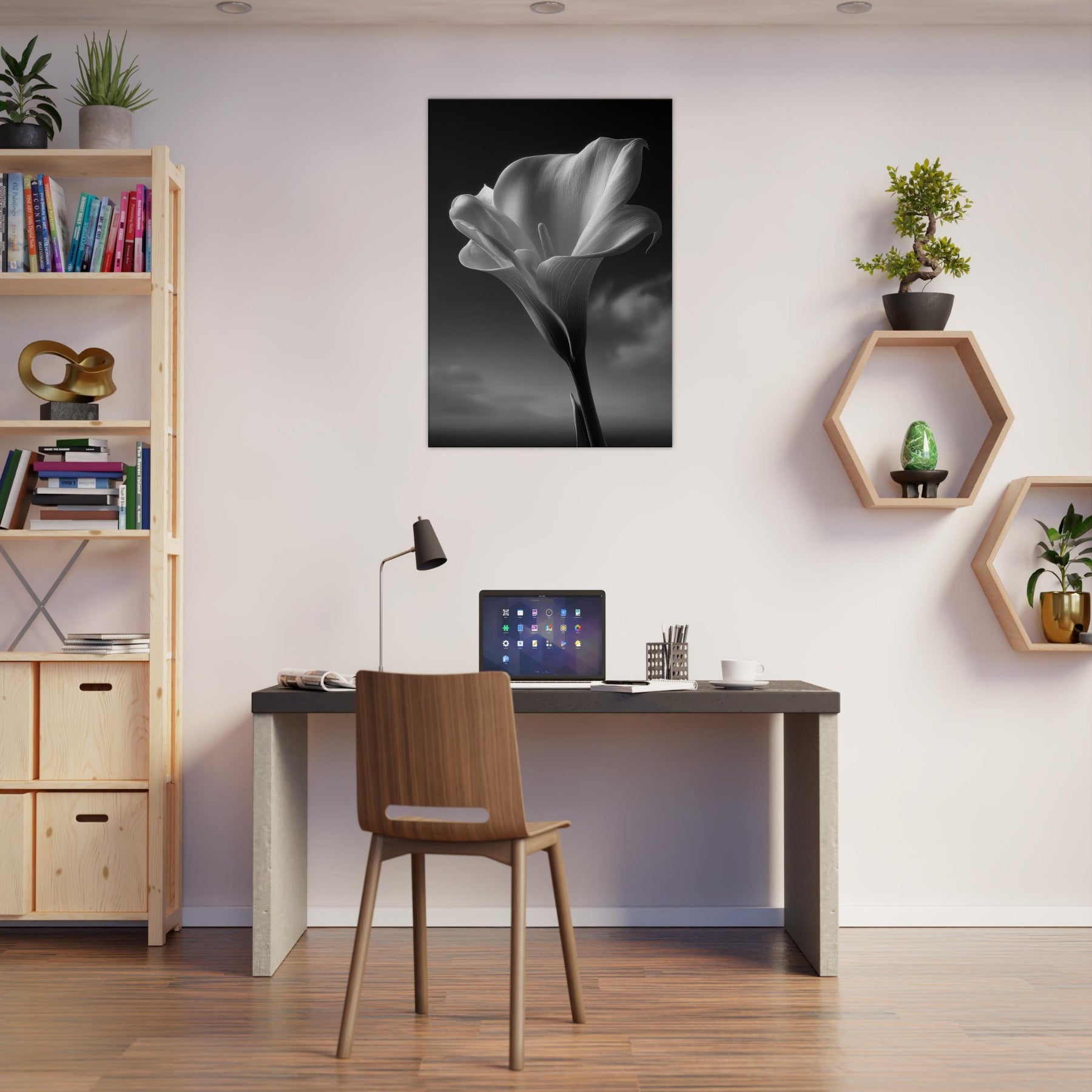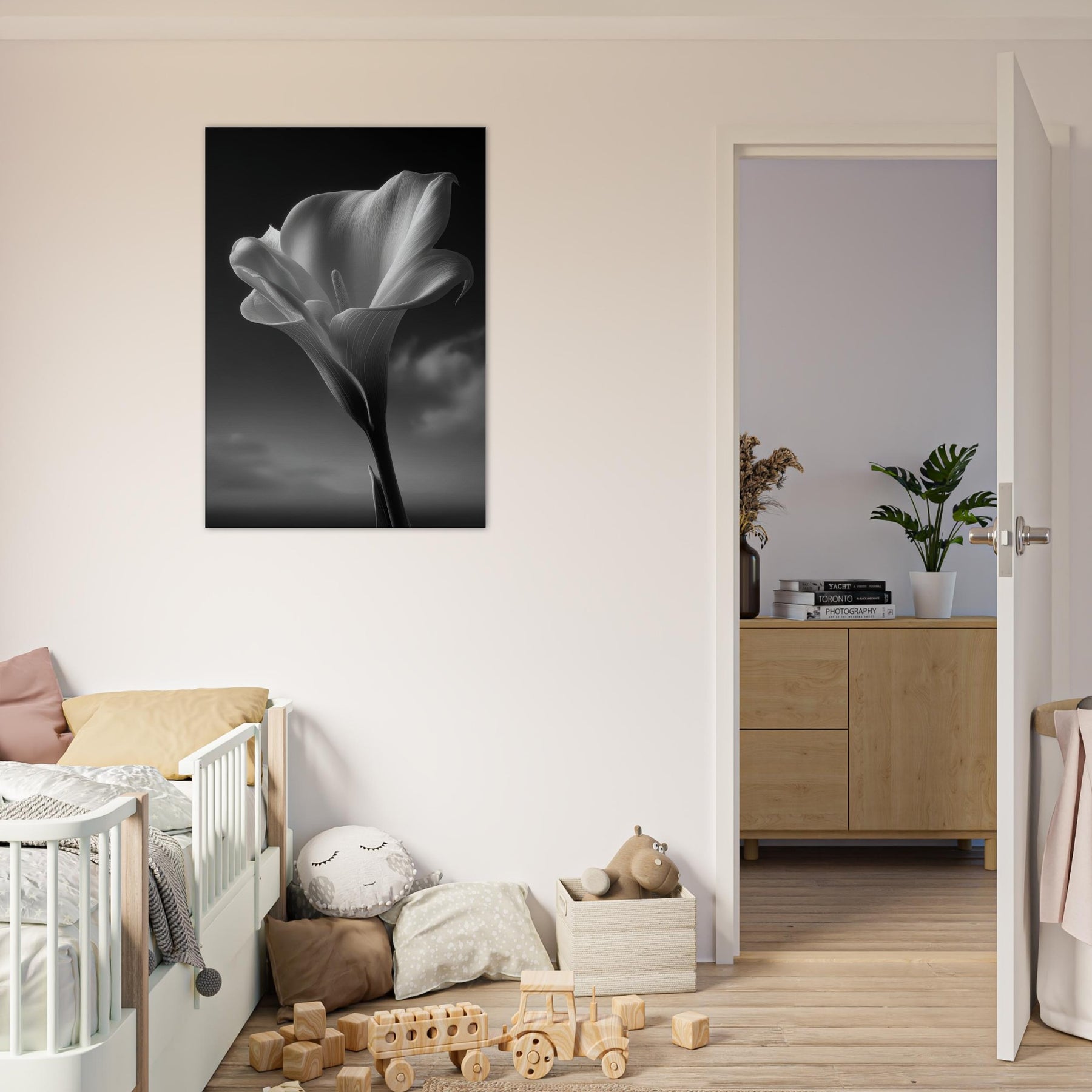 Experience the quiet drama of the Calla Lily rendered in black and white. This image captures a single bloom as if cut by moonlight, its curves and veining bathed in soft contrast and tactile texture. The atmosphere is serene yet evocative, inviting reflective pause in a living room or bedroom. The Calla Lily rises with graceful, restrained elegance, turning a wall into a sculptural moment. Pair it with clean lines and muted tones for a timeless centerpiece that breathes calm into daily life.